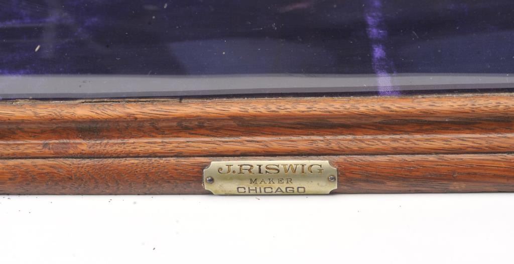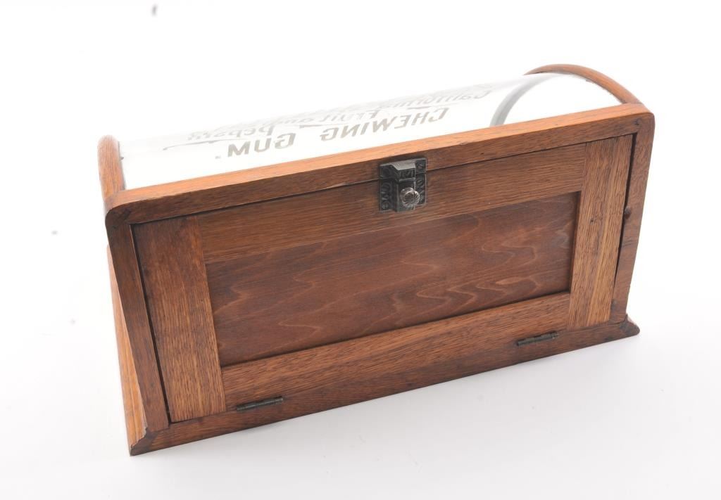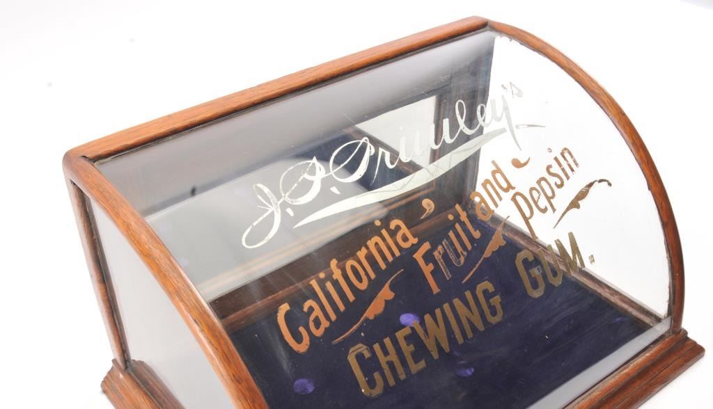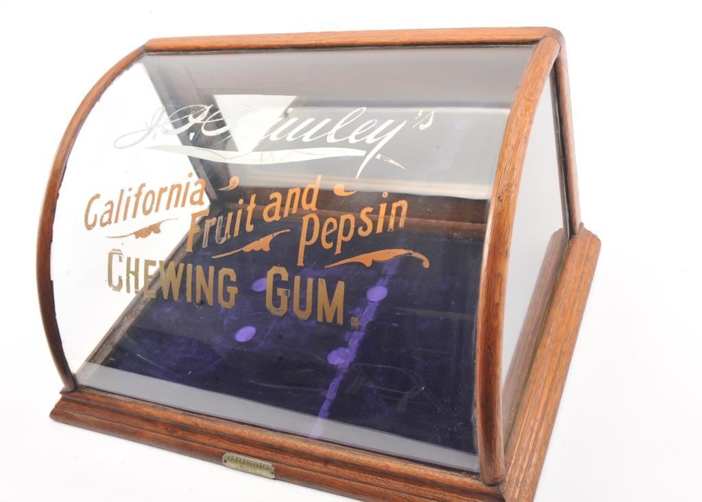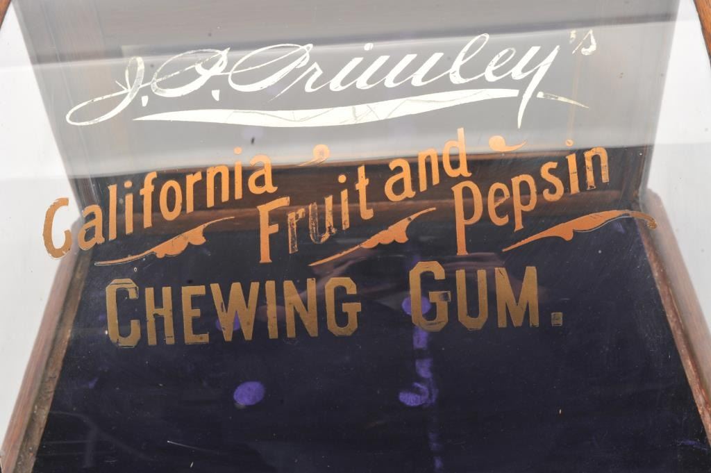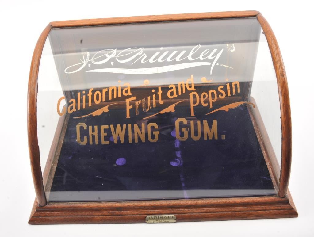J.O. Oriuley's California Fruit and Pepsin Chewing Gum" advertiser display case. Made by "J. Riswig Chicago". Very good plus to almost fine. Measures 9 1/2" x 18 1/2" x 12 1/2" deep. Est.: $250-$500