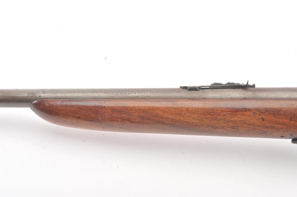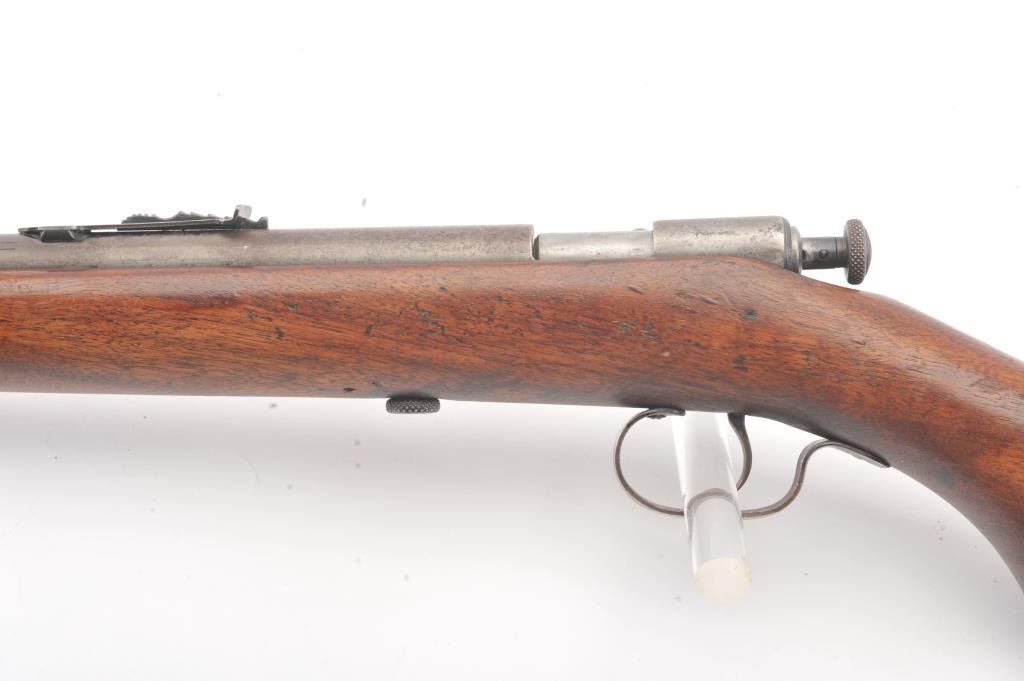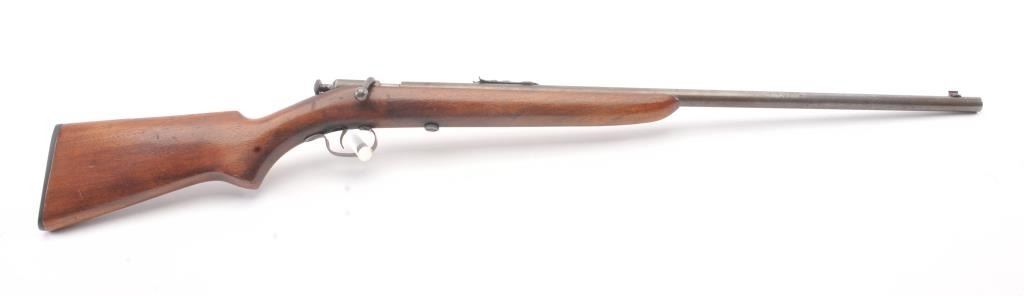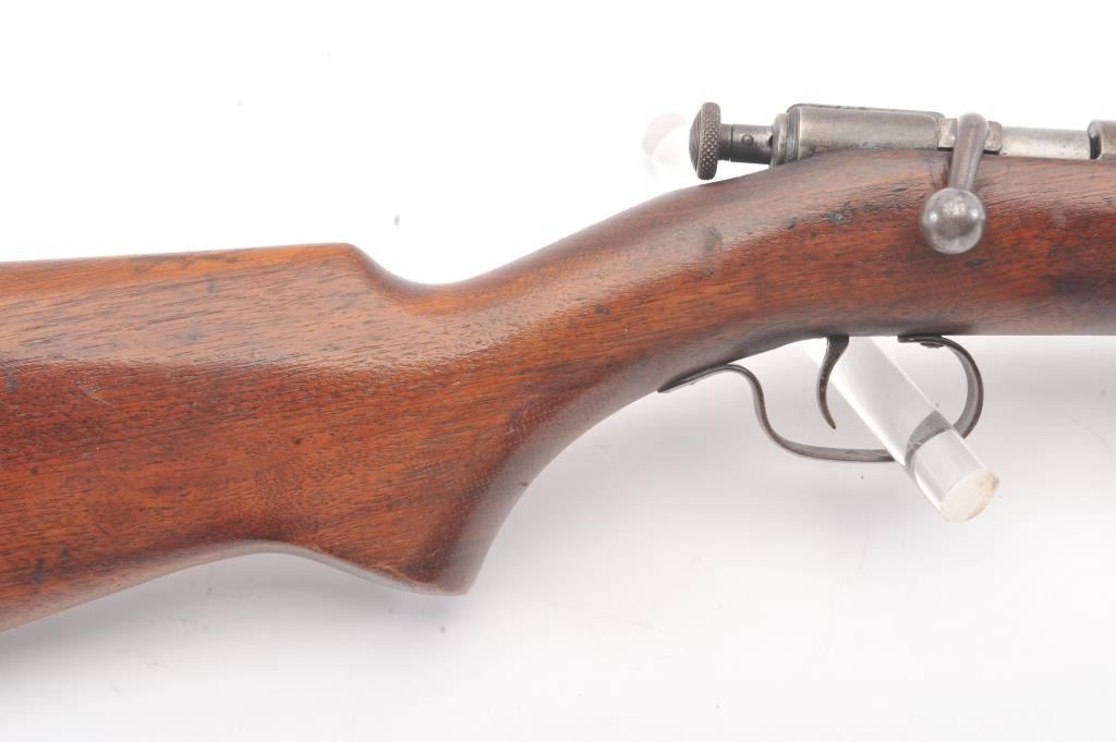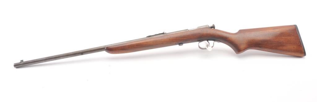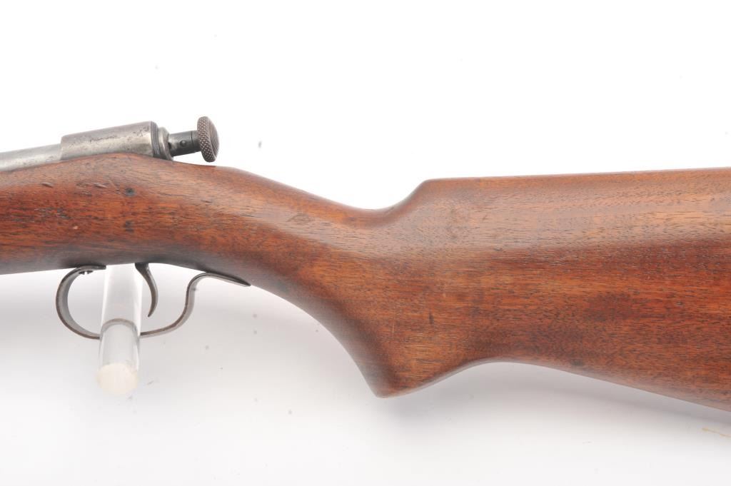 Winchester Model 60A bolt action single shot rifle, .22 Short caliber, Serial #NSNV. The rifle is in good overall condition with a 23” barrel. The metal surfaces have gone to a grey patina with light surface erosionevident. The smooth wood stock is in good condition with small mars and dents from carry and use. The bore is fair, the action functions and the markings are legible. Est.: $90-$180. (C+R).