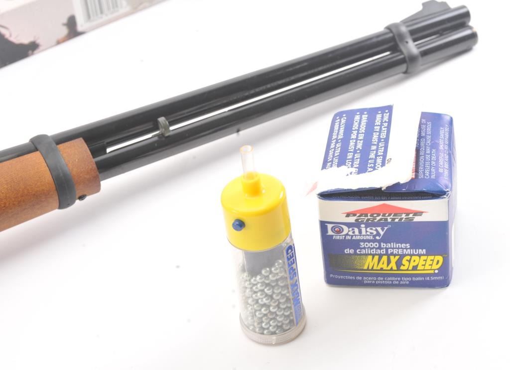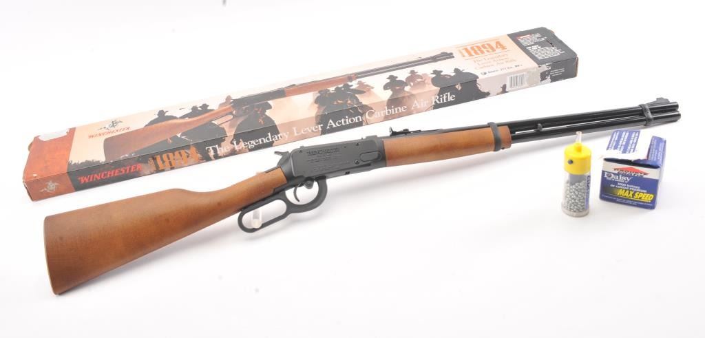 Winchester Model 1894 lever action carbine BB rifle. The rifle is in very good overall condition with a full-length magazine and a straight, Western style solid wood stock. The rifle is in the factory cardboard boxwith a box of Daisy Max Speed BB’s. Est.: $50-$100.