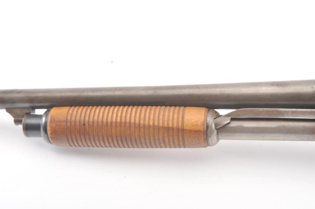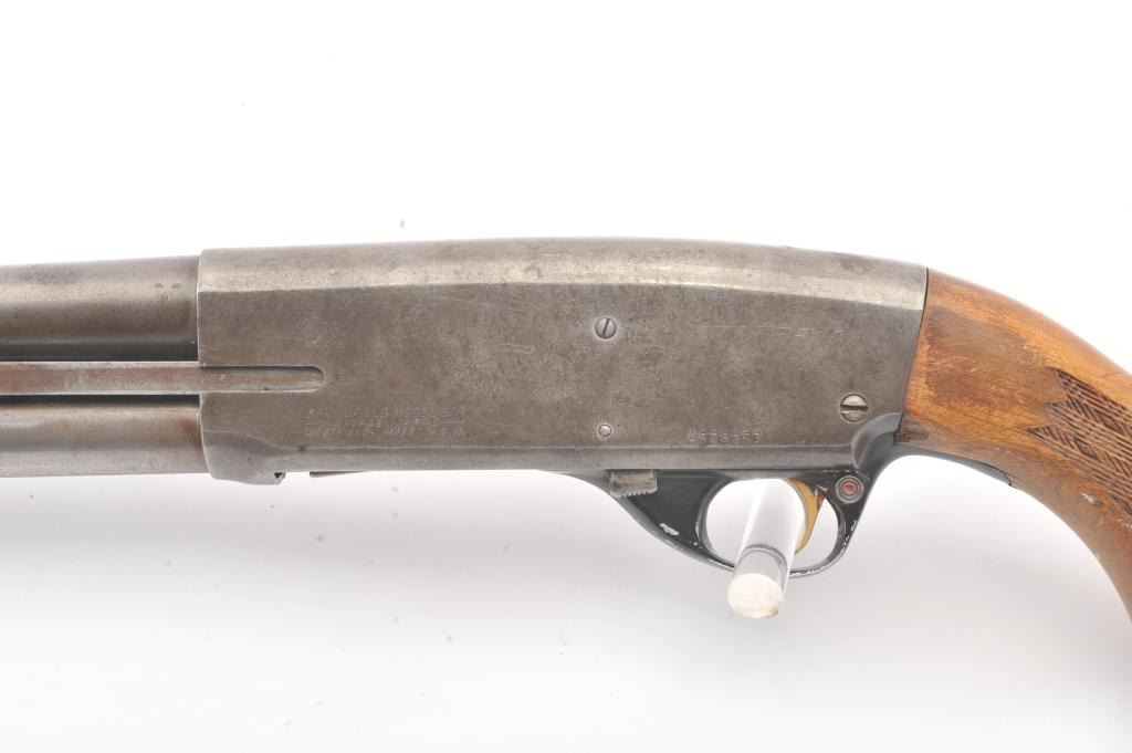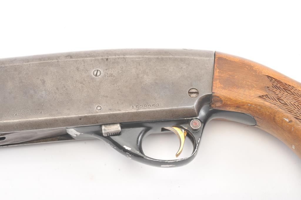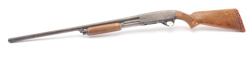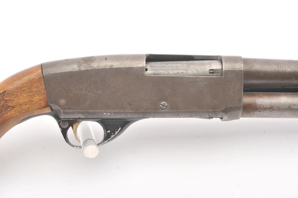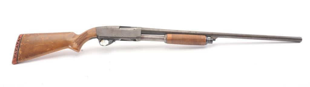 Springfield Model 67H pump shotgun, 12 gauge, Serial #A528253. The shotgun is in good overall condition with a 28” barrel chambered for 3” shells. The metal surfaces have gone to a mottled grey/brown patina with lightsurface erosion at the muzzle. The smooth wood stocks are in fair condition with mars and scrapes from carry and use. The butt stock ends with a ventilated rubber recoil pad with a 14 ¼” LOP. The bore is fair, theaction functions and the markings are legible. Est.: $40-$80. (C+R).