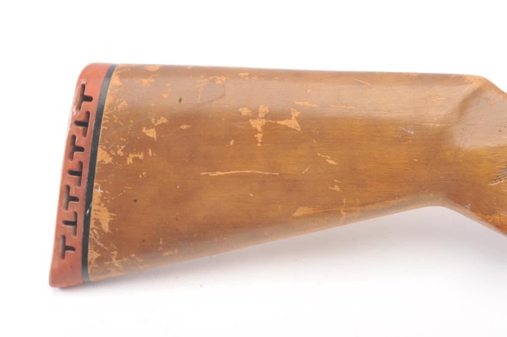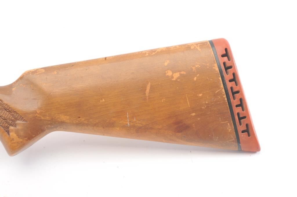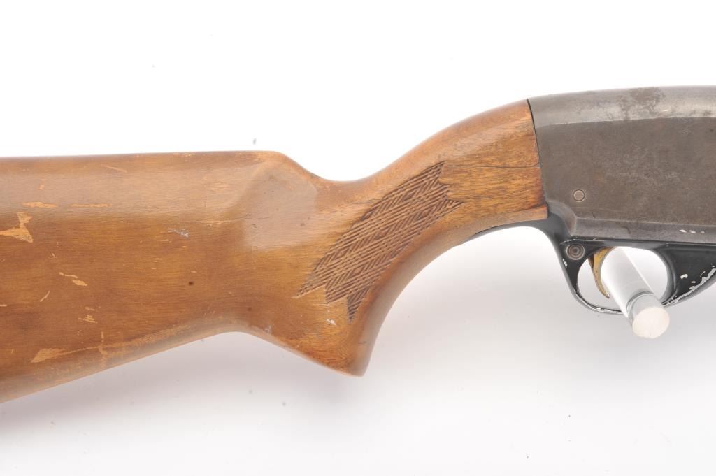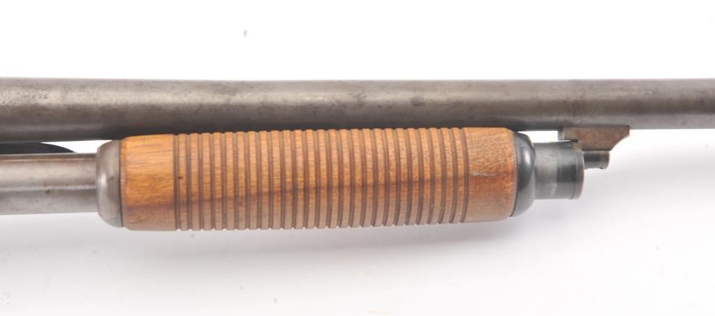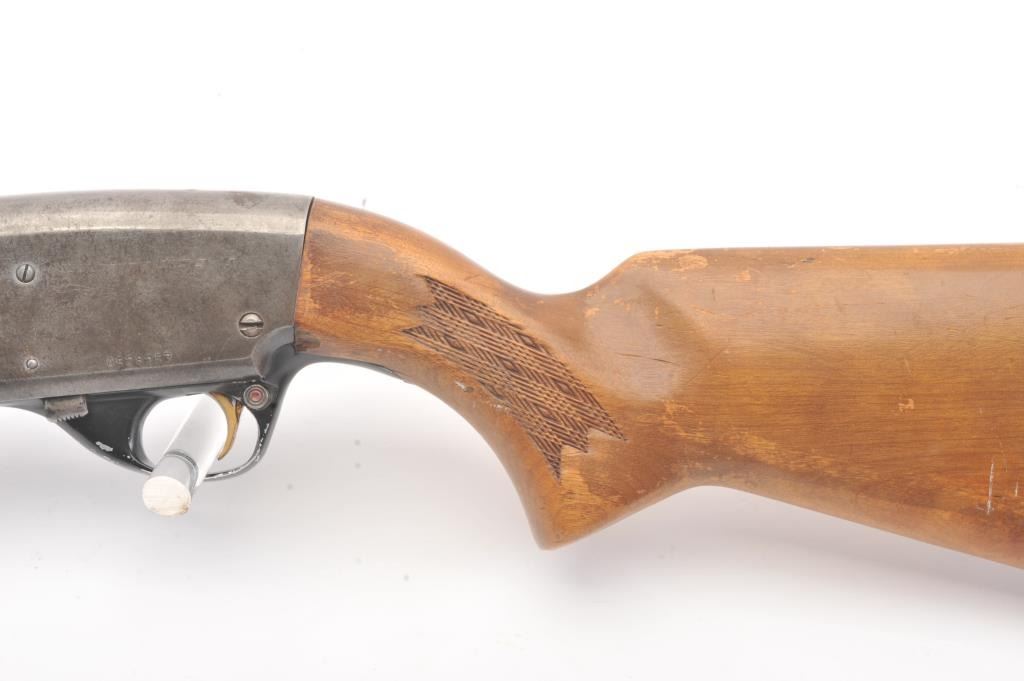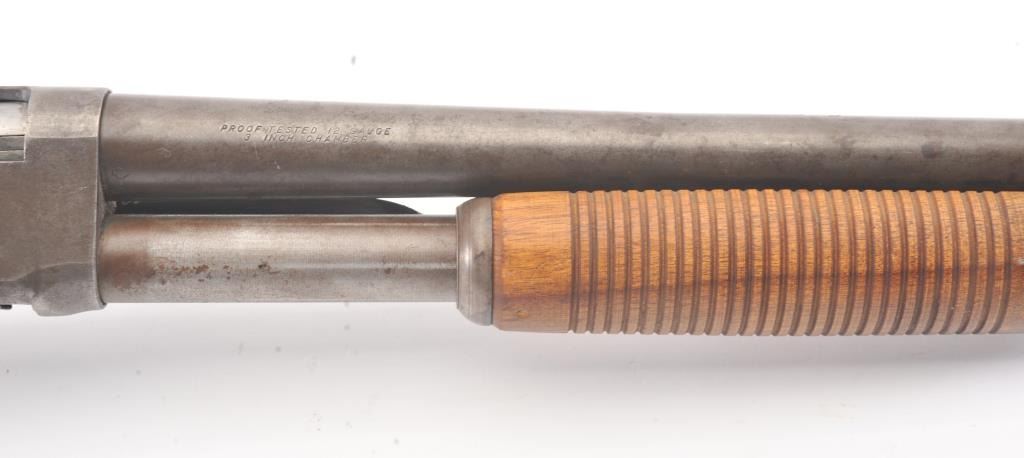 Springfield Model 67H pump shotgun, 12 gauge, Serial #A528253. The shotgun is in good overall condition with a 28” barrel chambered for 3” shells. The metal surfaces have gone to a mottled grey/brown patina with lightsurface erosion at the muzzle. The smooth wood stocks are in fair condition with mars and scrapes from carry and use. The butt stock ends with a ventilated rubber recoil pad with a 14 ¼” LOP. The bore is fair, theaction functions and the markings are legible. Est.: $40-$80. (C+R).