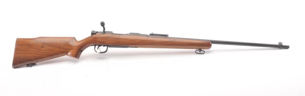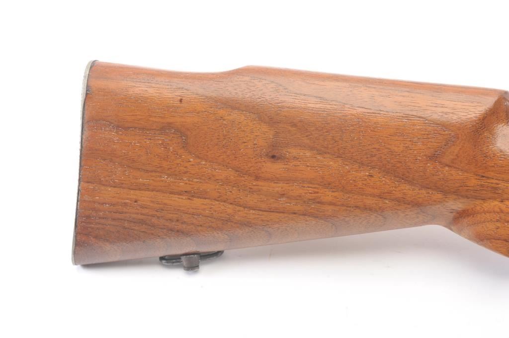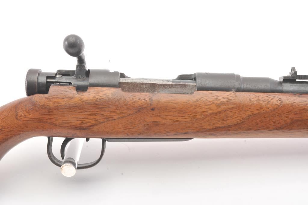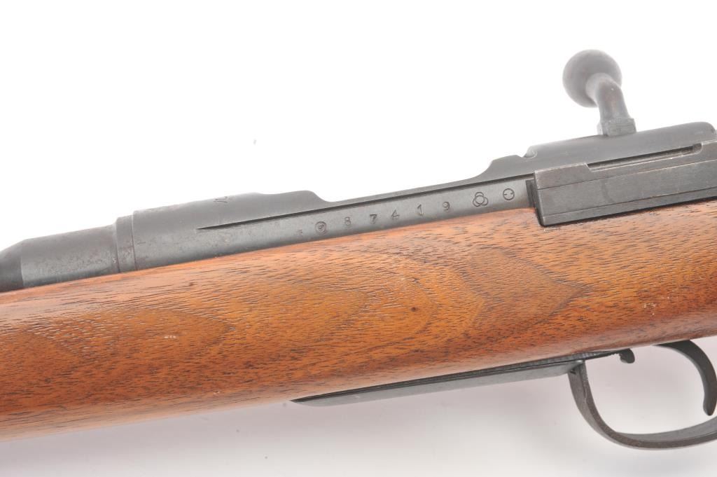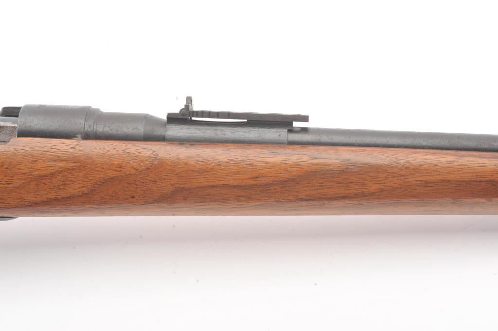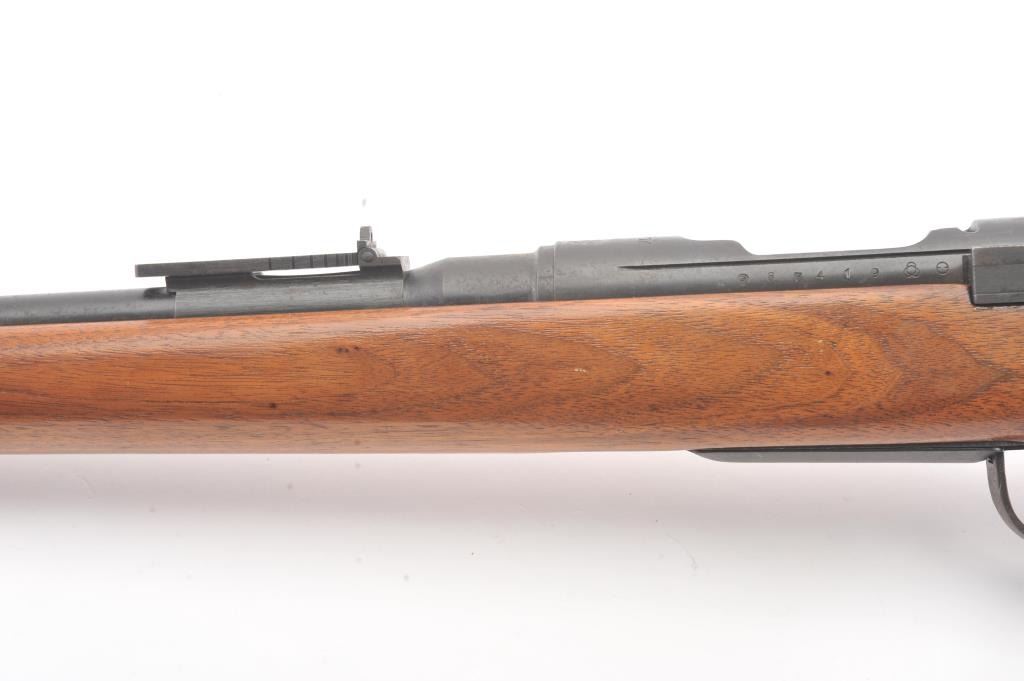 Arisaka bolt action sporter, 7.7 Japanese caliber, Serial #87419. The rifle is in good condition as sporterized with a 26” barrel. The metal surfaces are a blend of the military finish drifting to dark patina withscattered light surface rust, a protected blade front sight and original ladder rear. The Mum has been ground off the front ring. The smooth wood sight has been cut down and a coat of varnish added. The bore is fairwith moderate pitting, the action functions and the markings are legible. Est.: $60-$120. (C+R).