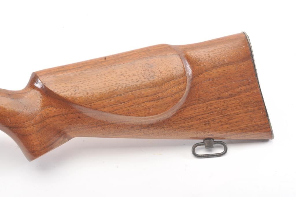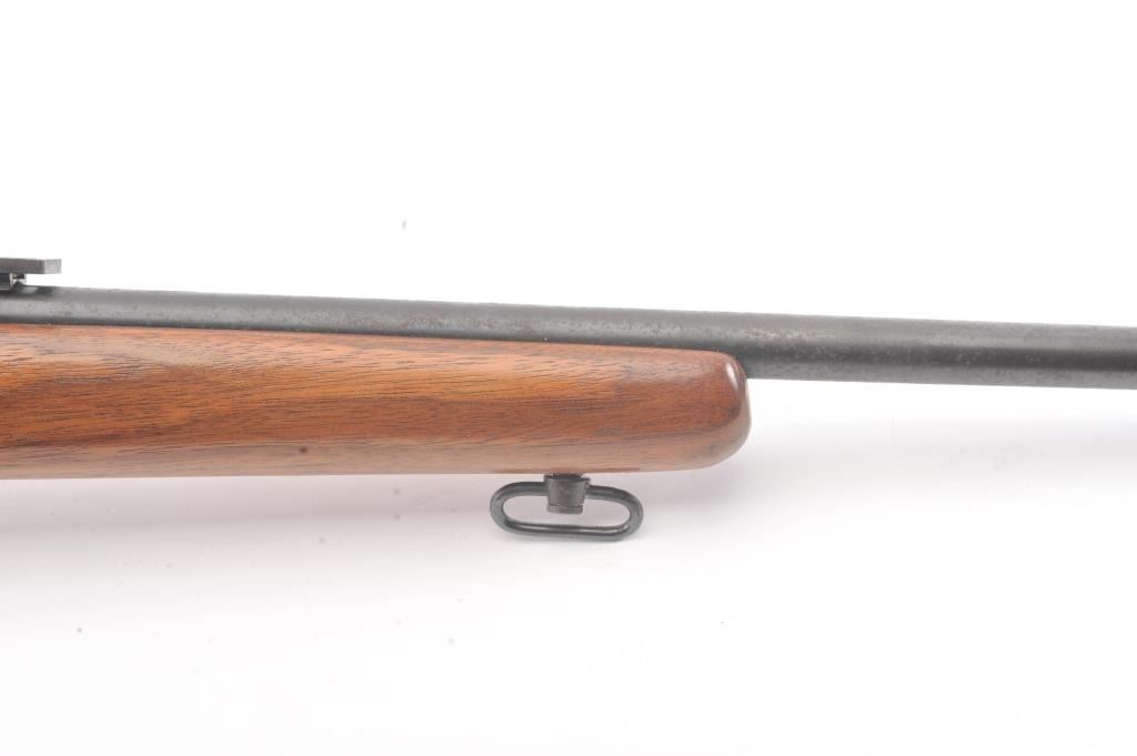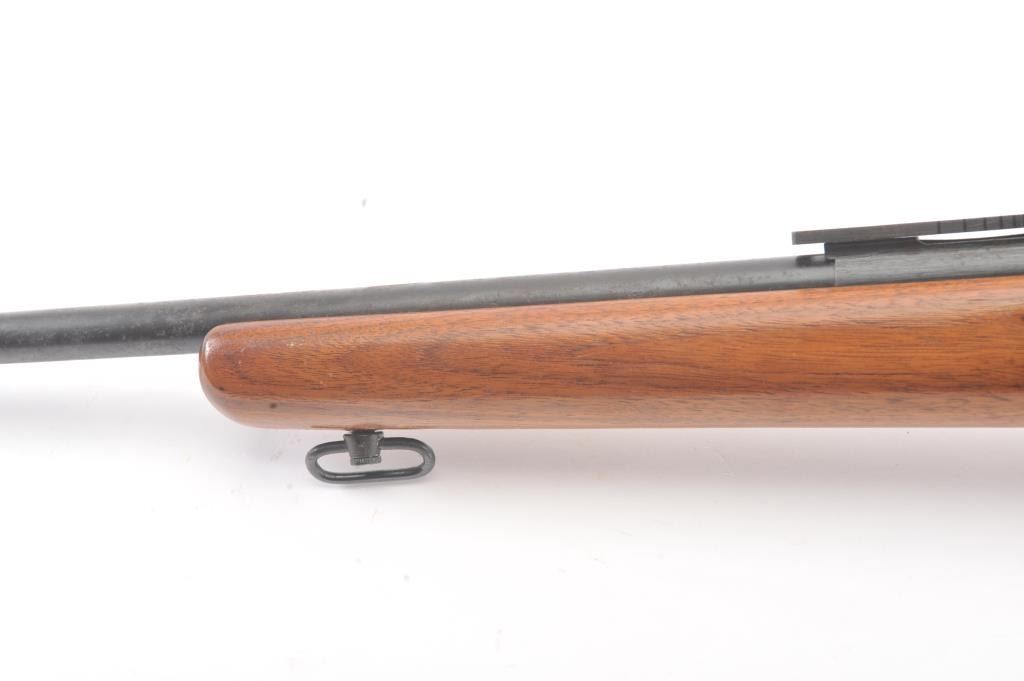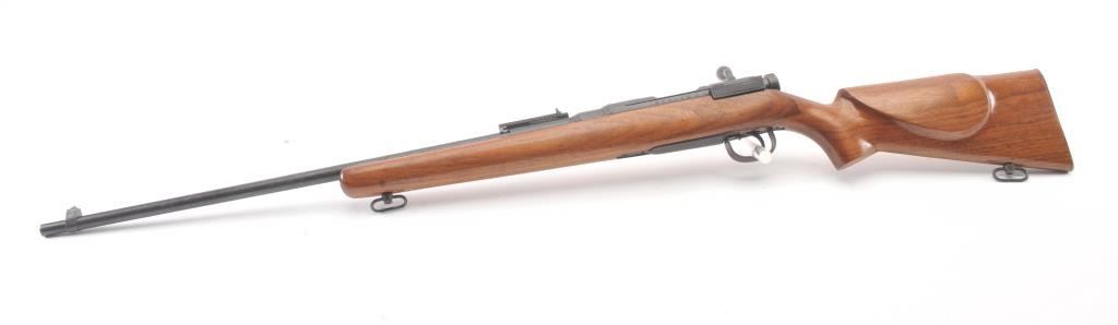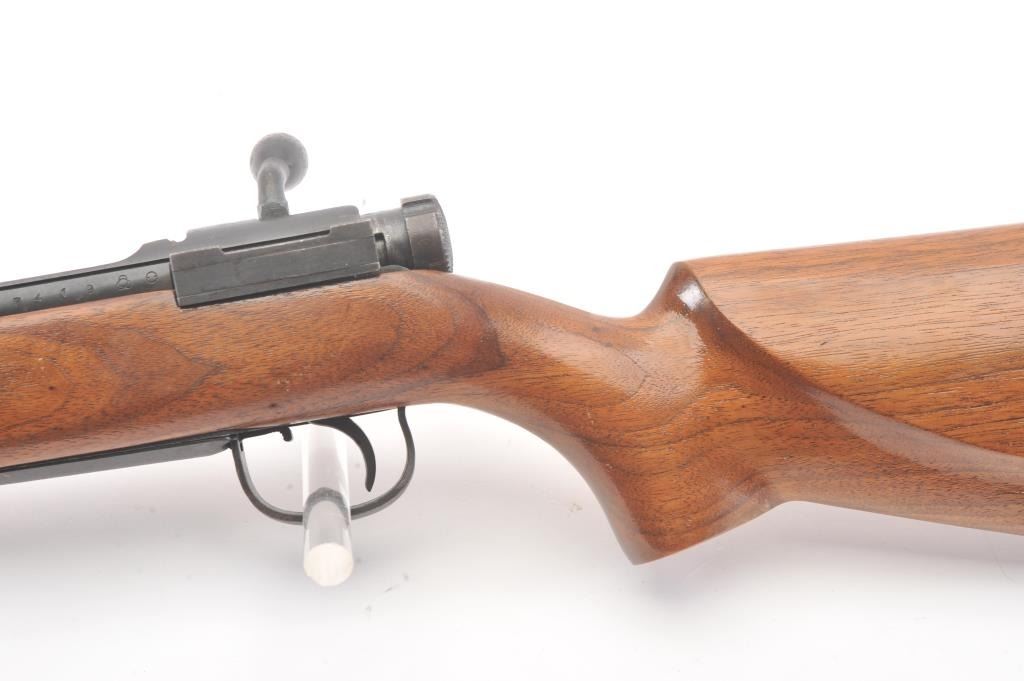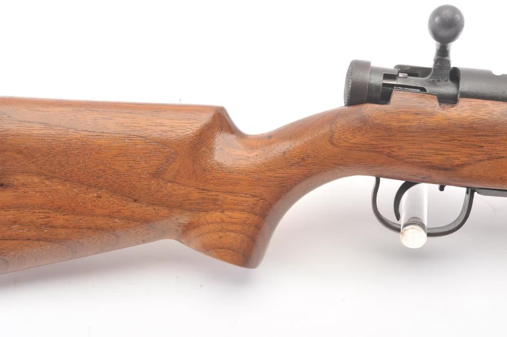 Arisaka bolt action sporter, 7.7 Japanese caliber, Serial #87419. The rifle is in good condition as sporterized with a 26” barrel. The metal surfaces are a blend of the military finish drifting to dark patina withscattered light surface rust, a protected blade front sight and original ladder rear. The Mum has been ground off the front ring. The smooth wood sight has been cut down and a coat of varnish added. The bore is fairwith moderate pitting, the action functions and the markings are legible. Est.: $60-$120. (C+R).