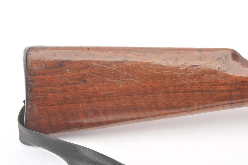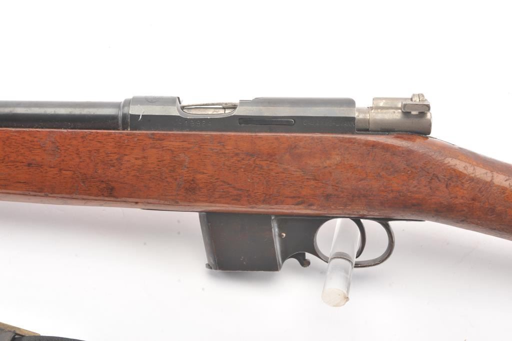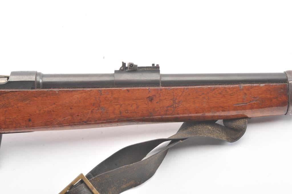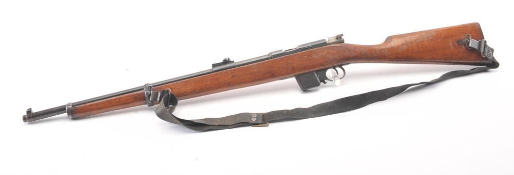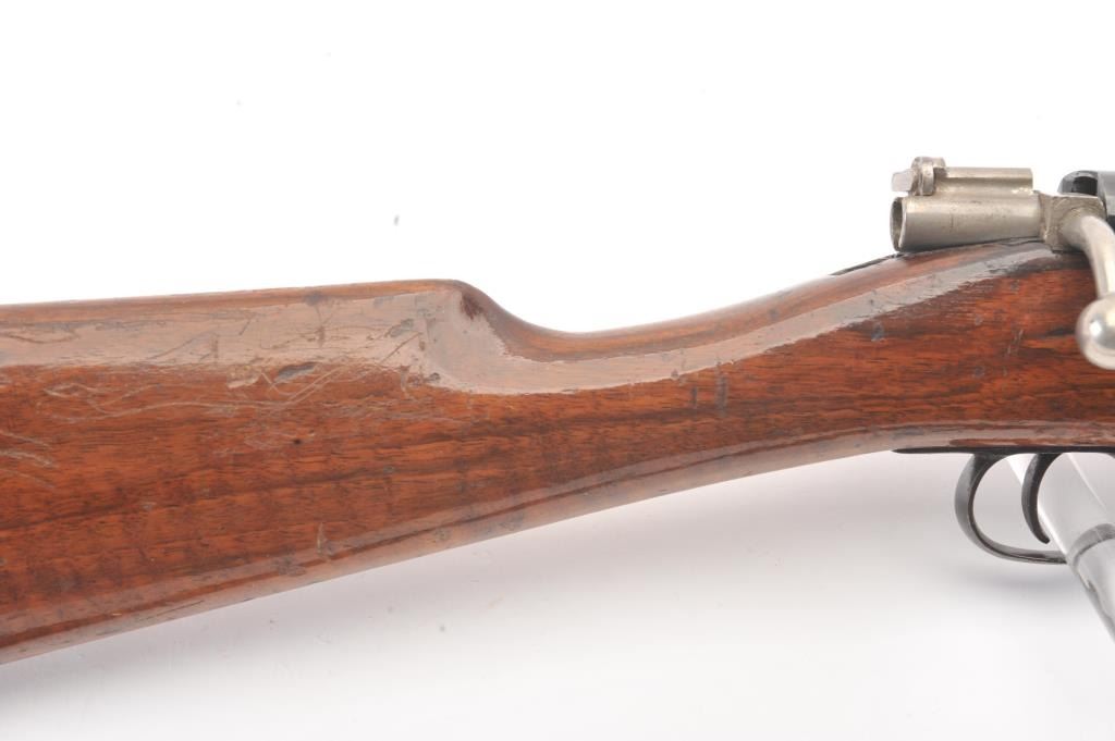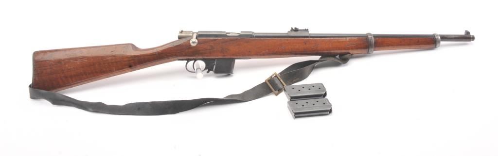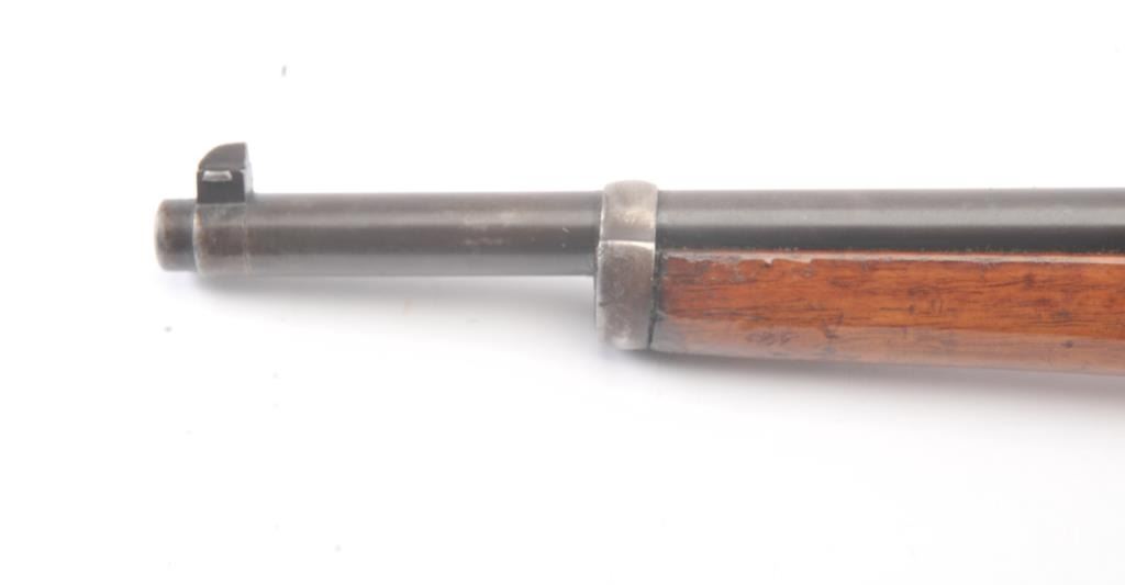 Spanish Destroyer bolt action carbine, 9mm Bergmann caliber, Serial #19864. The carbine has a 21” barrel with a blade front and ladder rear sights. The barrel shows a small amount of muted blue finish with theremainder drifting to dark patina. The receiver shows a significant amount of toning blue finish with a crisp Destroyer trademark on the front ring. The smooth wood stock is in good condition with a smooth steel buttplate, sling swivels and period leather sling. The bore is fair, the action is crisp and the markings are sharp. The lot includes three correct, two-tone magazines. Est.: $250-$500. (C+R).