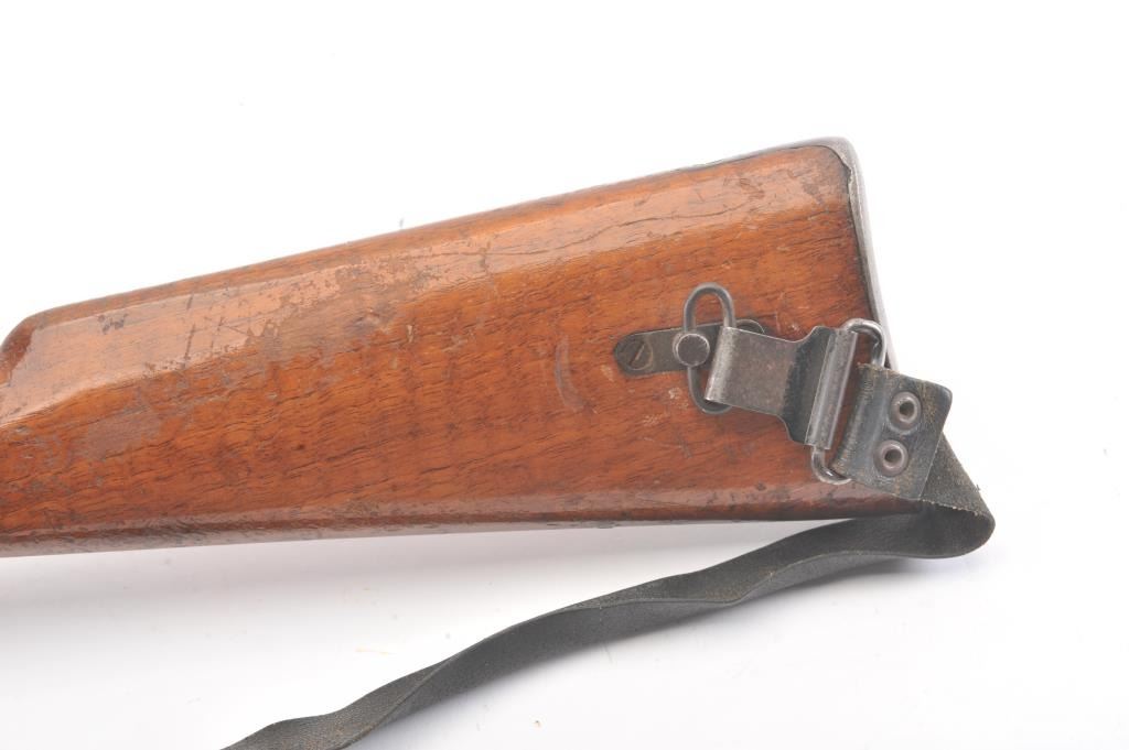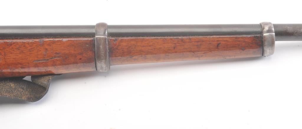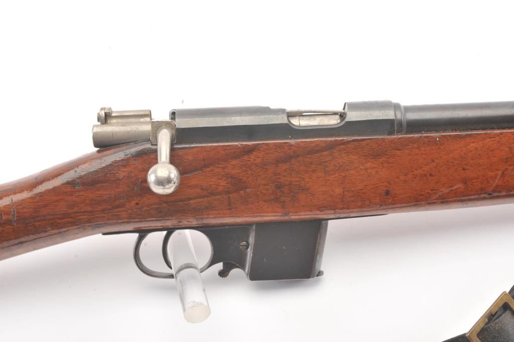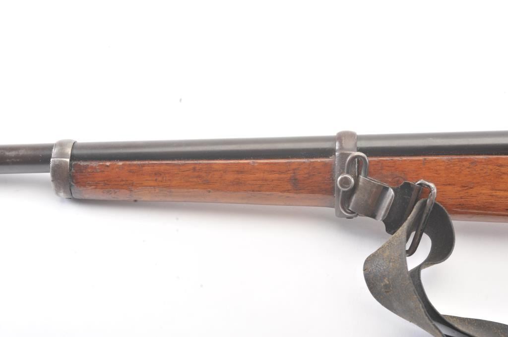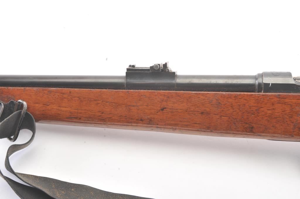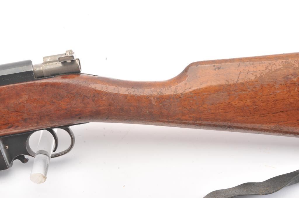 Spanish Destroyer bolt action carbine, 9mm Bergmann caliber, Serial #19864. The carbine has a 21” barrel with a blade front and ladder rear sights. The barrel shows a small amount of muted blue finish with theremainder drifting to dark patina. The receiver shows a significant amount of toning blue finish with a crisp Destroyer trademark on the front ring. The smooth wood stock is in good condition with a smooth steel buttplate, sling swivels and period leather sling. The bore is fair, the action is crisp and the markings are sharp. The lot includes three correct, two-tone magazines. Est.: $250-$500. (C+R).