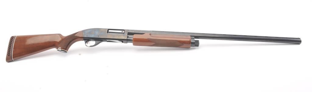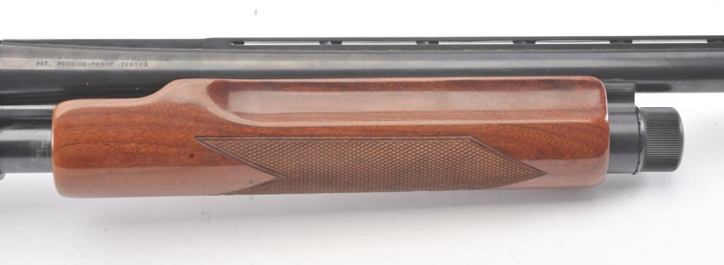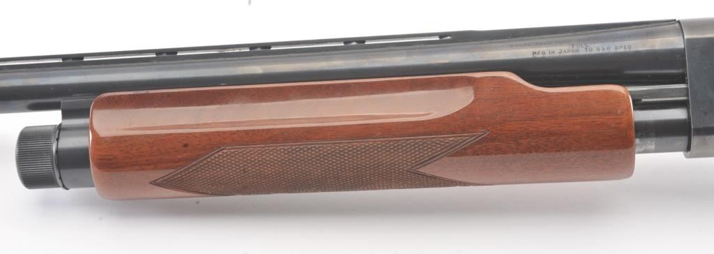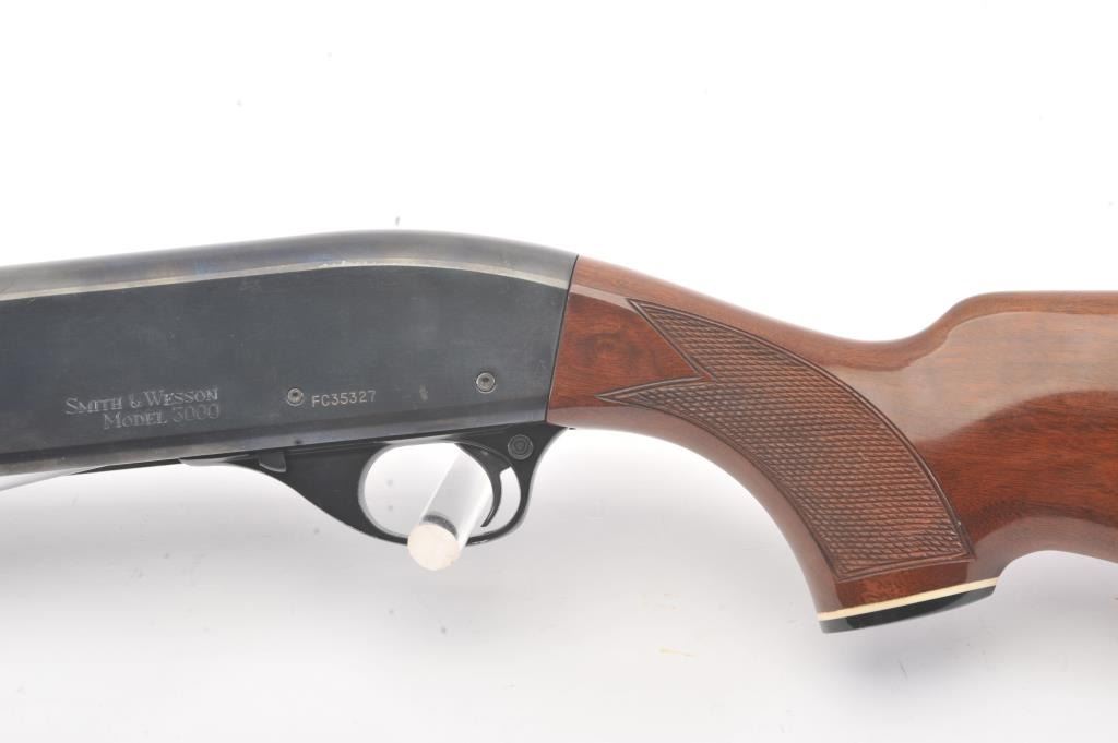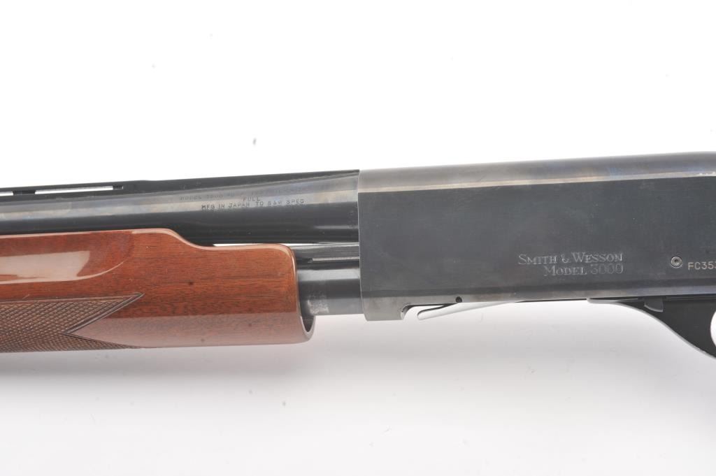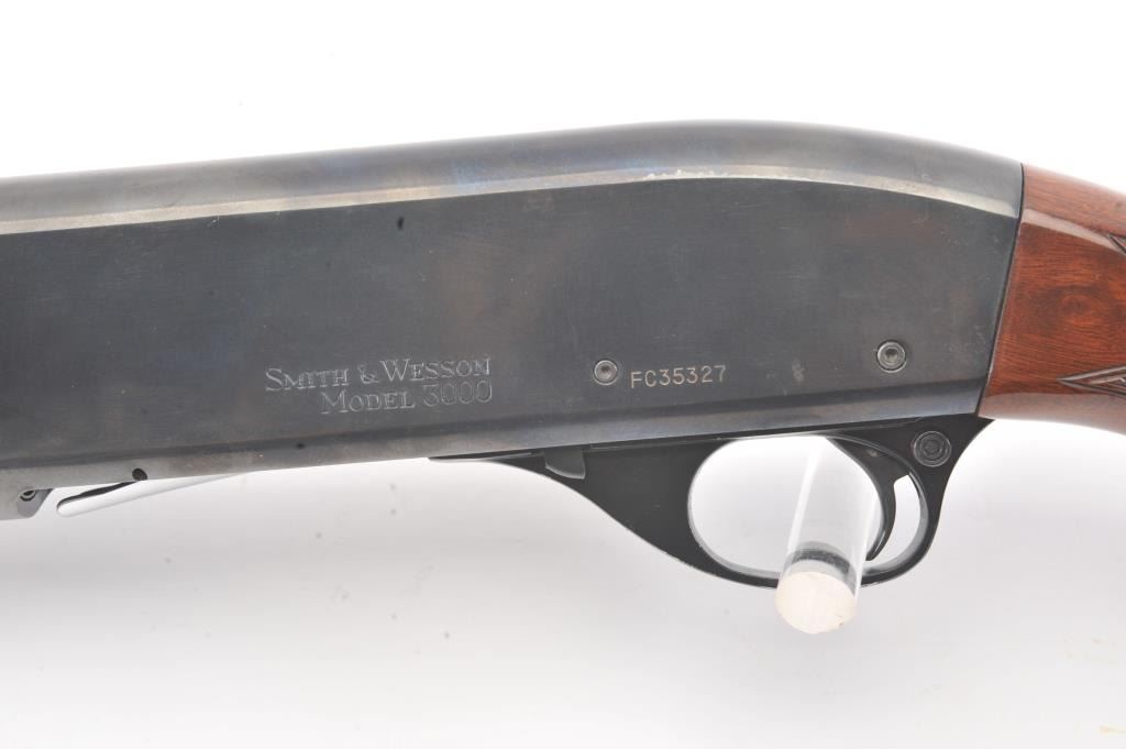 Smith & Wesson Model 3000 pump shotgun, 12 gauge, Serial #FC35327. The shotgun is in fine overall condition with a 30” barrel with a full-length ventilated rib. The shotgun retains nearly all of the blue finish with asteel bead front sight. The shotgun is choked “Full” and chambered for 3” shells. The checkered wood stocks are in very good conditions with small mars and scrapes consistent with field use. The butt stockends with a ventilated rubber recoil pad providing a 14 ¼” LOP. The bore is good, the action is crisp and the markings are sharp. Est.: $200-$400. (Modern).