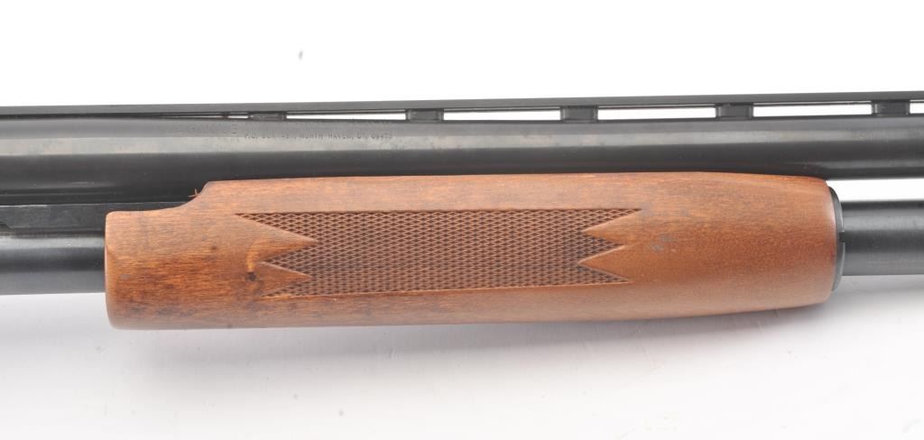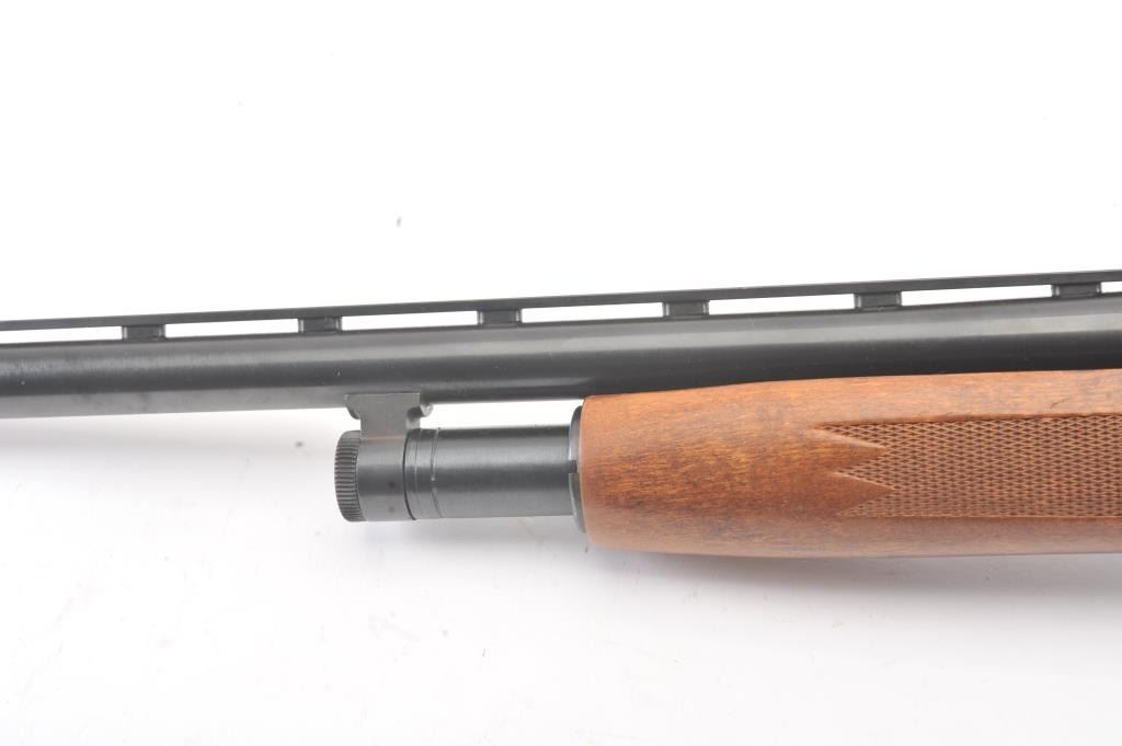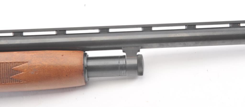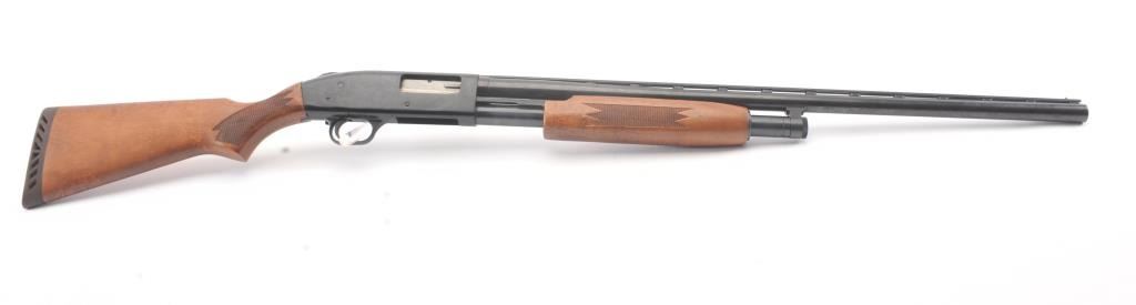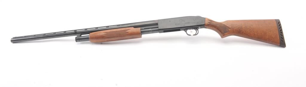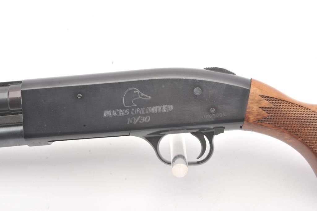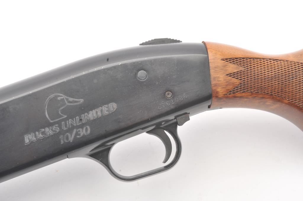 Mossberg Model 500A Ducks Unlimited pump shotgun, 12 gauge, Serial #J761036. The shotgun is in fine overall condition with a 28” barrel with a full-length ventilated rib and brass bead front sight. The shotgunretains nearly all of the blue finish with light handling marks. The left side of the receiver is marked, “DUCKS UNLIMITED 10/30”. The shotgun is choked modified and chambered for 2 ¾” or 3” shells. The smooth woodstocks are in very good conditions with small mars and scrapes consistent with field use. The butt stock ends with a ventilated rubber recoil pad providing a 14” LOP. The bore is good, the action is crisp and the markingsare sharp. Est.: $200--$400. (Modern).