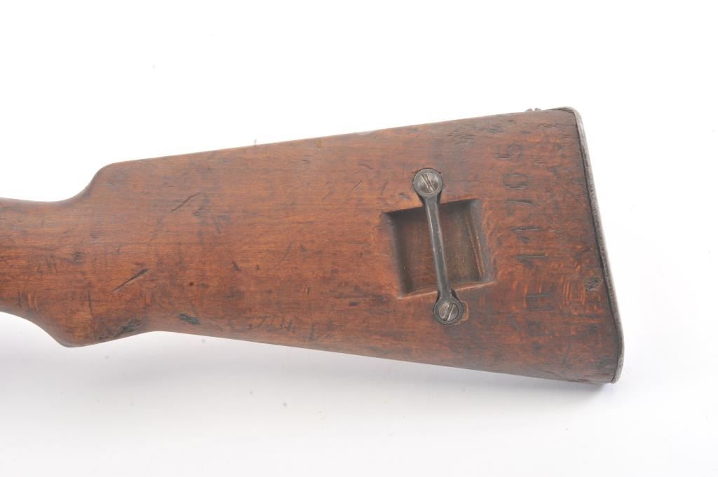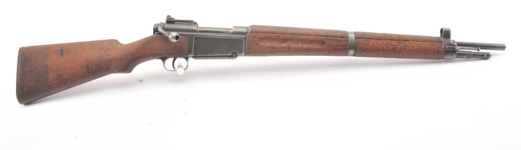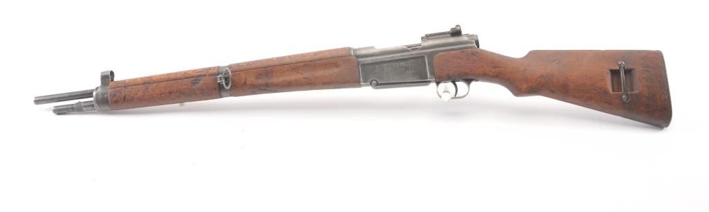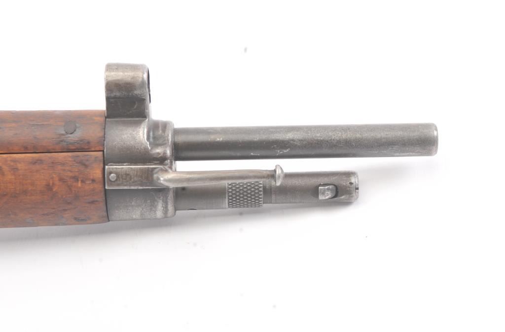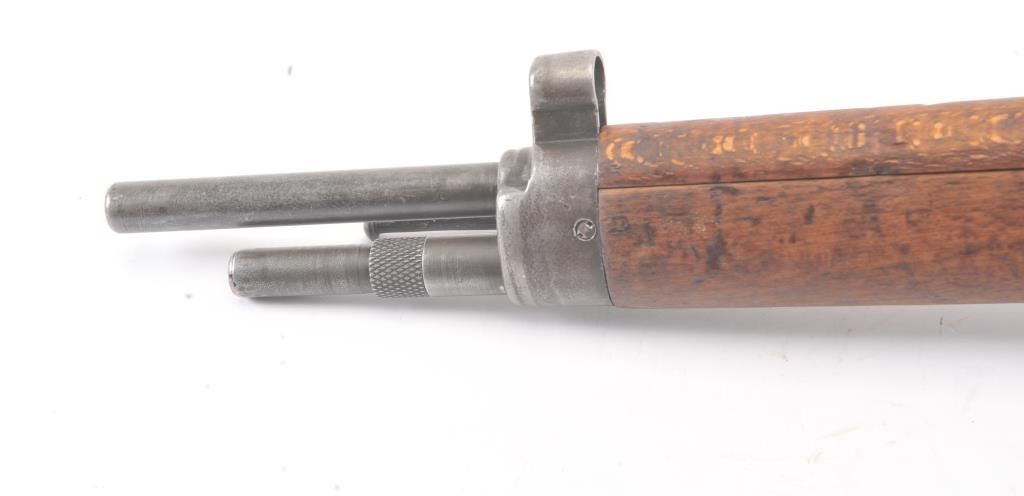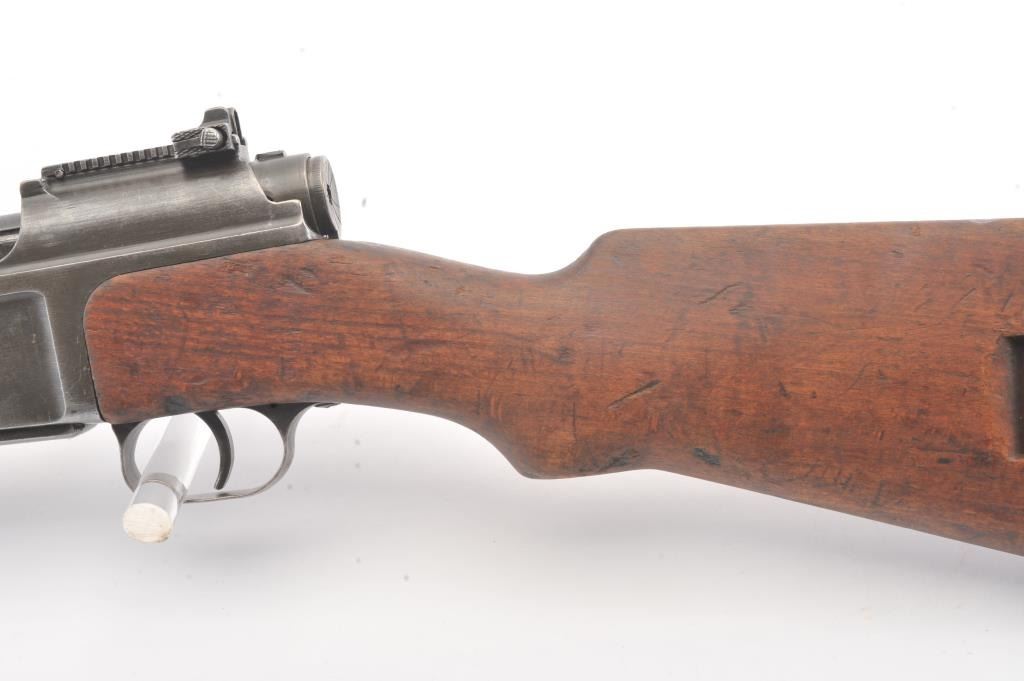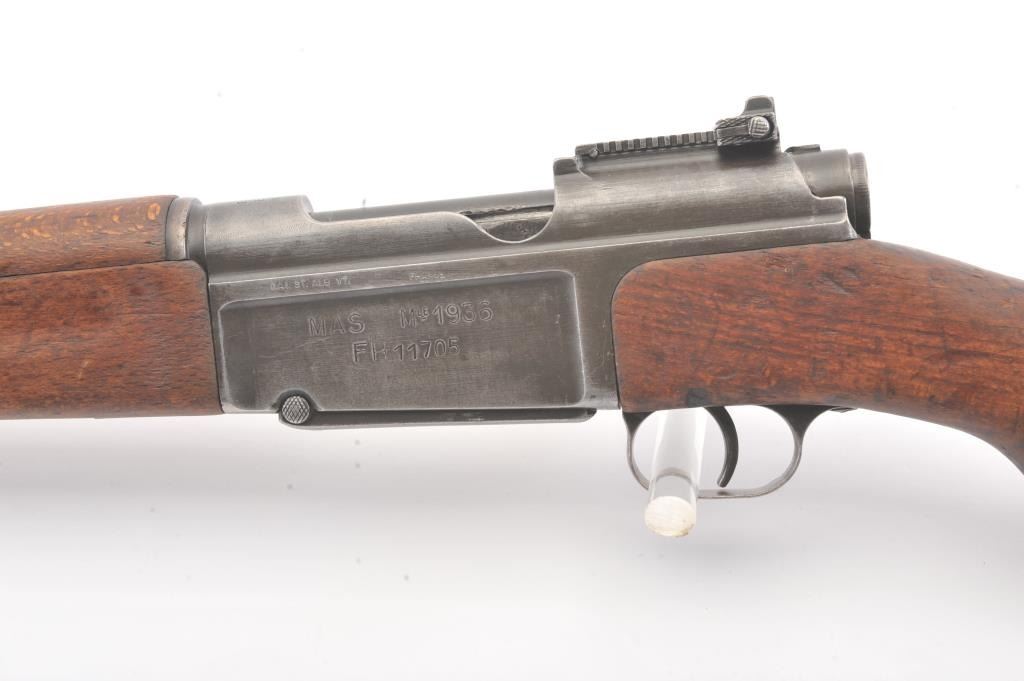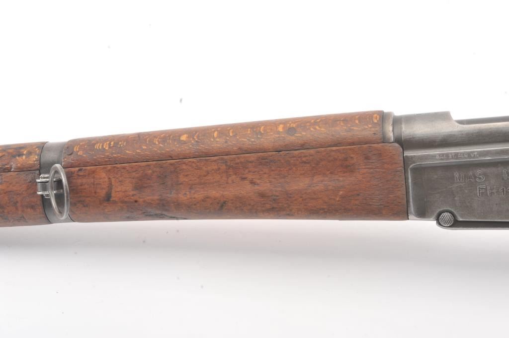 French MAS Model 1936 bolt action rifle, 7.5 French caliber, Serial #FH11705. The rifle is in good overall condition with a 23” barrel. The rifle retains a significant amount of military finish with moderate wearfrom carry and use. The receiver is marked France and import marked on the left side. The smooth wood stock is in good condition showing heavy use with dents, mars and pressure bruises consistent with militaryservice use. The stock has sling swivels and ends with a smooth steel butt plate. The bore is fair, the action is crisp and the markings are sharp on this WWII era MAS. Est.: $200-$400. (C+R).