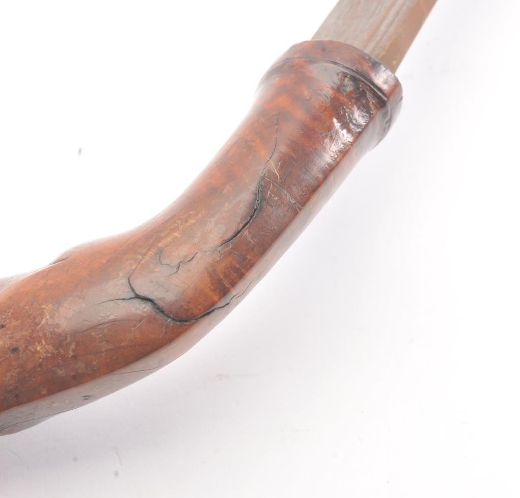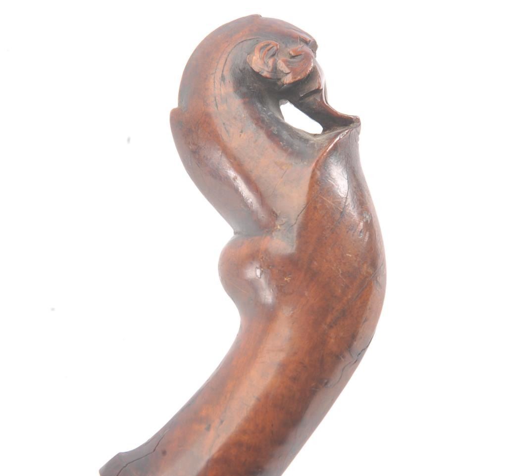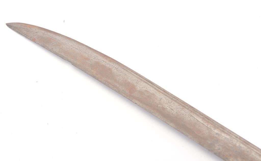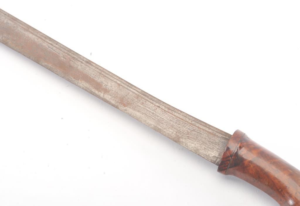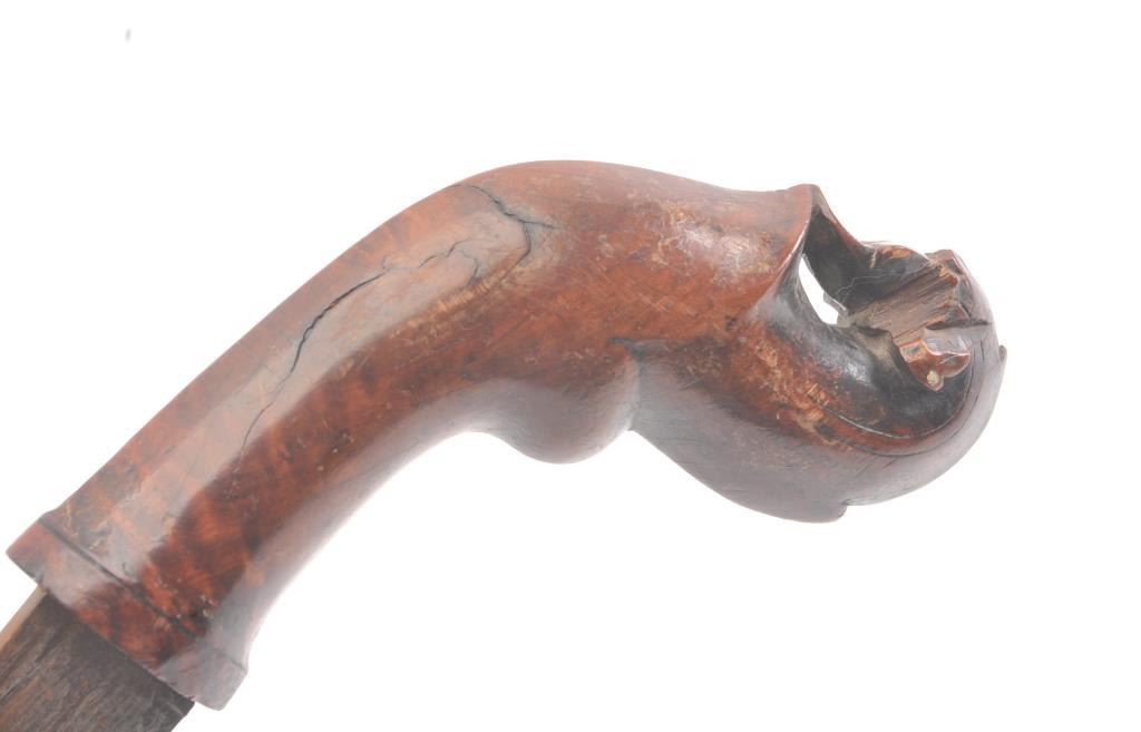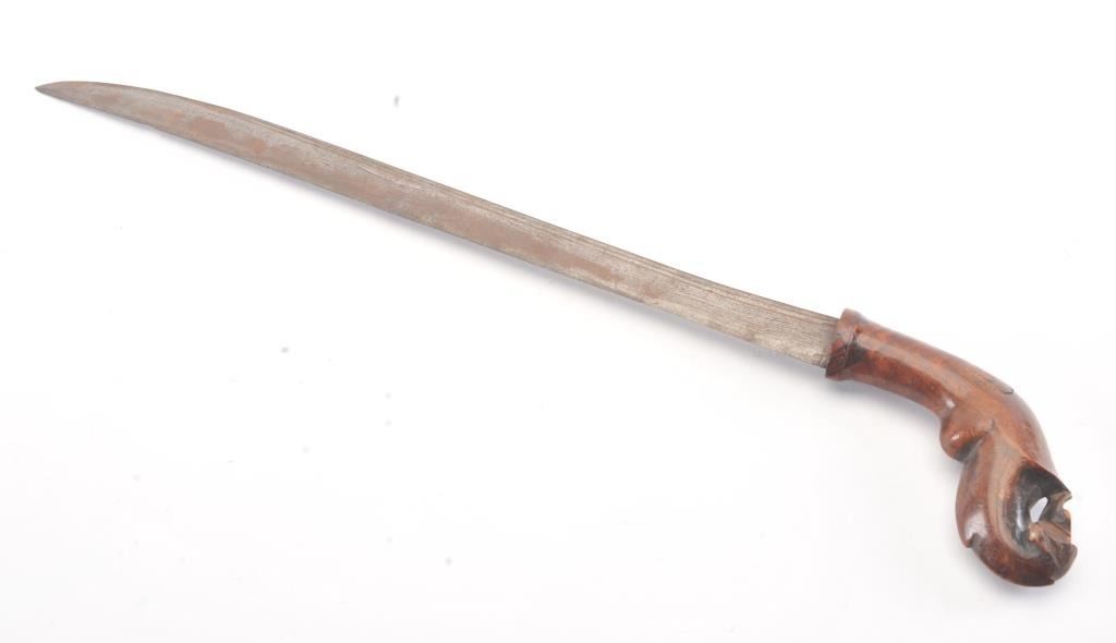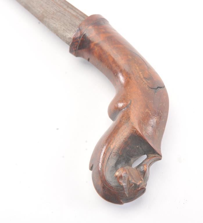 Malaysian Kris with carved wood grip from 18th-19th century with no scabbard. Meteorite steel blade measuring 22 1/2". Fair to good overall. Est.: $150-$300