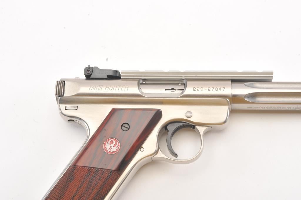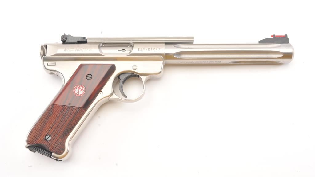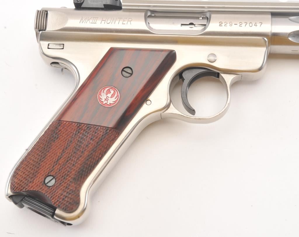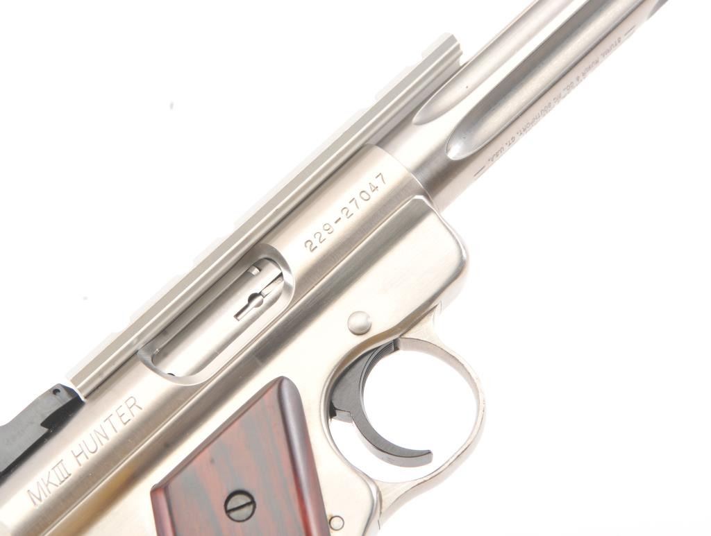 Ruger MK III Hunter semi-automatic target pistol, .22 Long Rifle caliber, Serial #229-27047. The pistol is as new in the factory plastic case with a 6 7/8” fluted medium weight barrel with a Hi-Viz frontsight, adjustable rear and a picatinny rail style mounting base added. The pistol retains approximately 98%-99% of the stainless steel finish showing little use. The checkered wood medallion grips are inexcellent condition with light handling marks. The lot includes the factory plastic case, two correct magazines and all associated packing materials. Est.: $300-$600. (Modern/PPT).