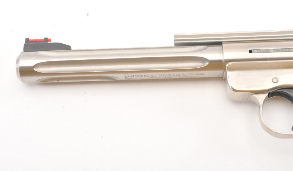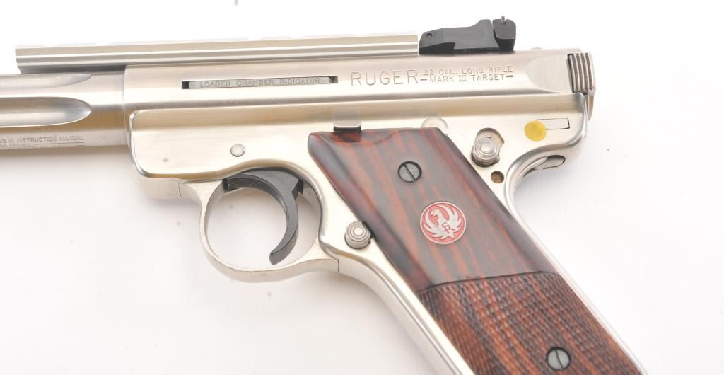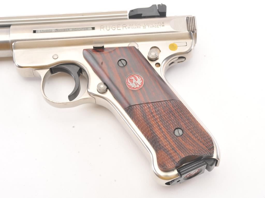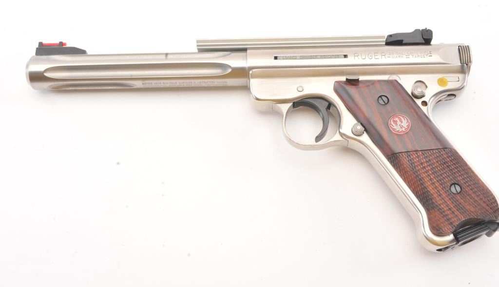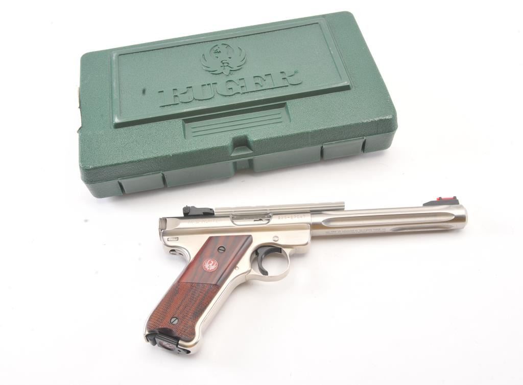 Ruger MK III Hunter semi-automatic target pistol, .22 Long Rifle caliber, Serial #229-27047. The pistol is as new in the factory plastic case with a 6 7/8” fluted medium weight barrel with a Hi-Viz frontsight, adjustable rear and a picatinny rail style mounting base added. The pistol retains approximately 98%-99% of the stainless steel finish showing little use. The checkered wood medallion grips are inexcellent condition with light handling marks. The lot includes the factory plastic case, two correct magazines and all associated packing materials. Est.: $300-$600. (Modern/PPT).