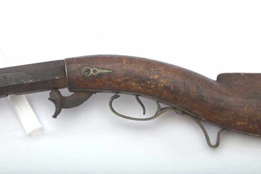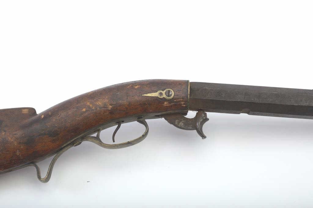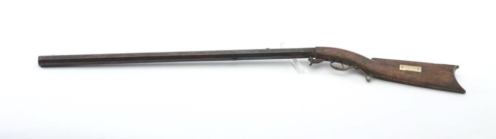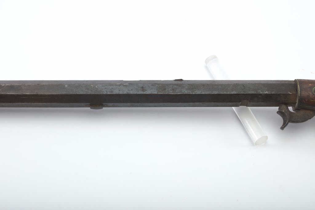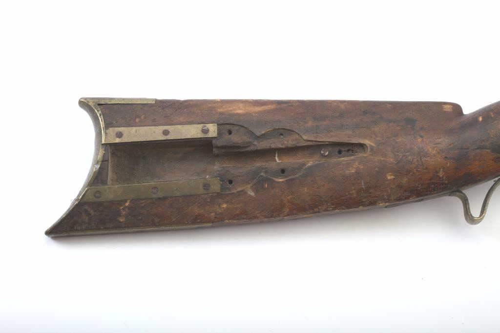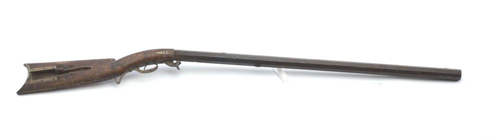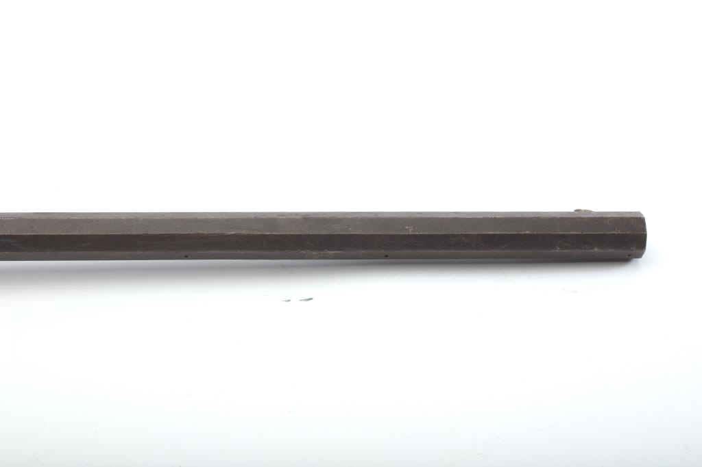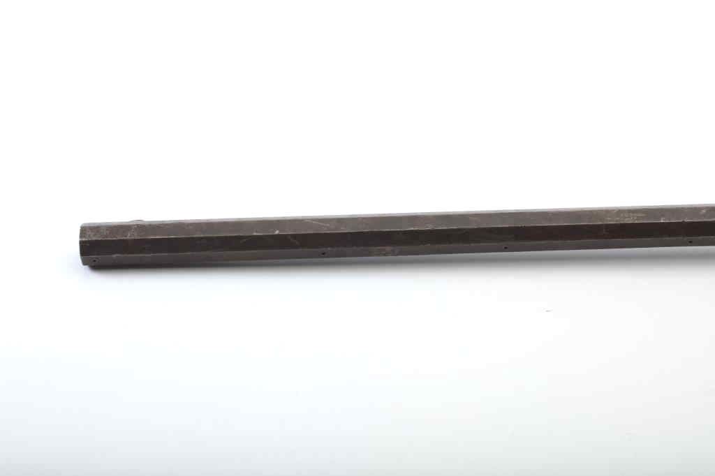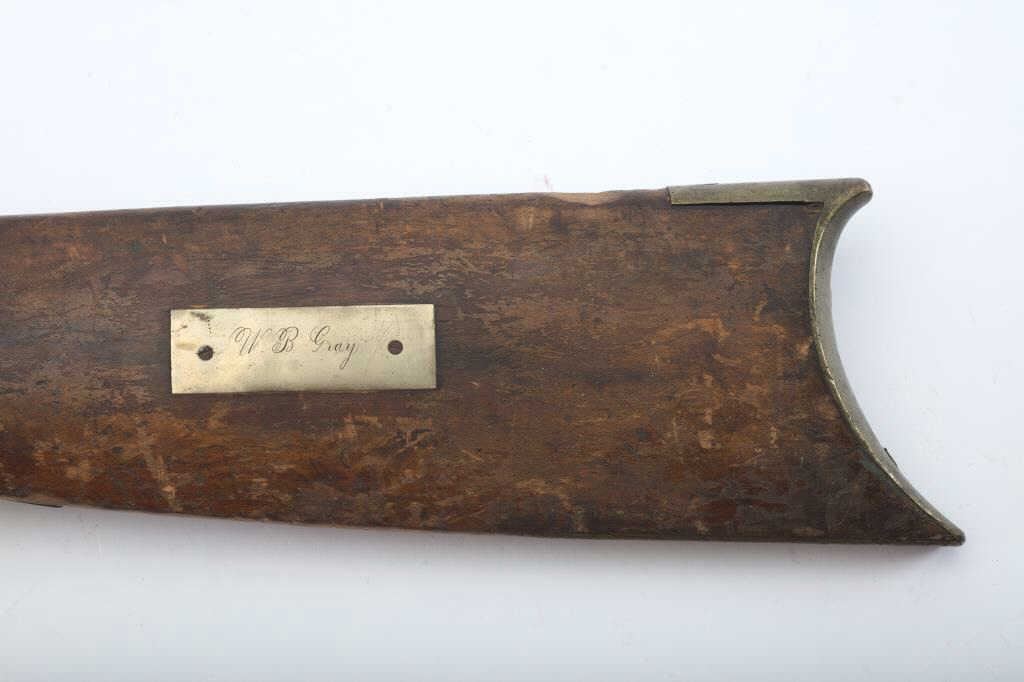 Heavy barrel under hammer percussion rifle with inlaid plaque inscribed in script “W.B. Gray”. Shows removal of large patch box. Barrel measures 34 ½” of .52 caliber measuring almost 1 ¼” across the flats. Thebottom of the barrel shows key and groove for fore end. Lock working. Fair to poor overall but completely untouched and as found in Northern California by early collector who purchased from pioneer descendants. (Antique) Est.: $250-500
