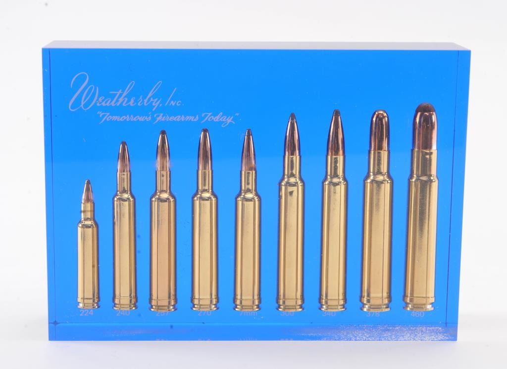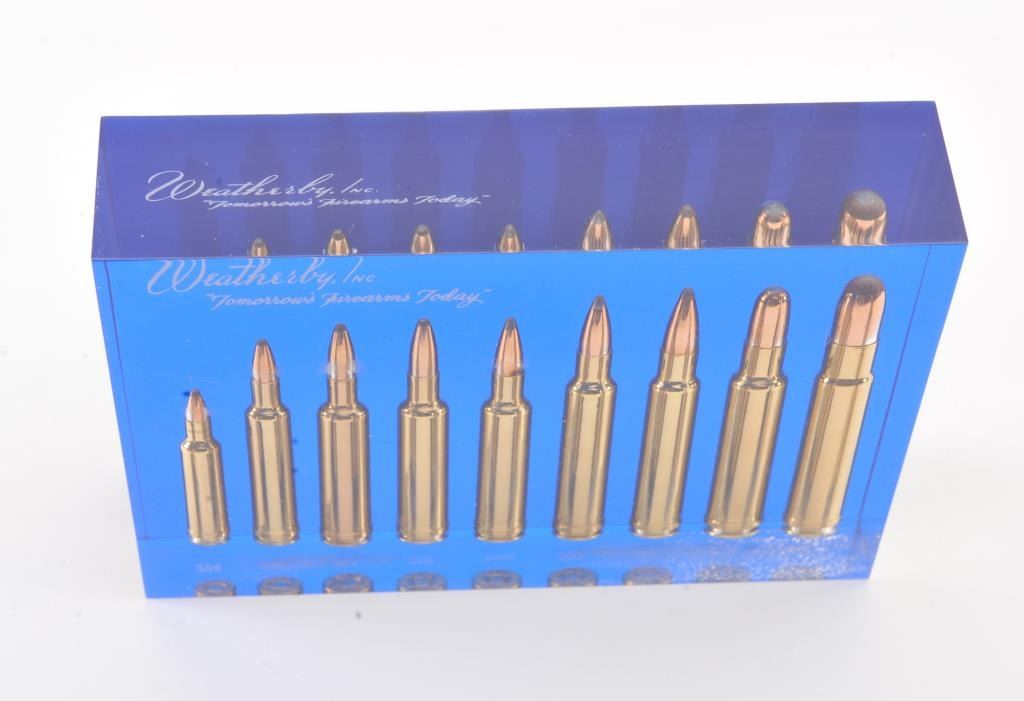 Collectible Weatherby Lucite block bullet display. The Lucite block is 5” x 7” and features nine Weatherby cartridges from the .224 Weatherby to the .460 Weatherby. The block is in excellent overall condition withsome light crazing on the underside, marked, “TOMORROWS FIREARMS TODAY” in white script. A great item for the Weatherby collector or gun room. Est.: $150-$300.