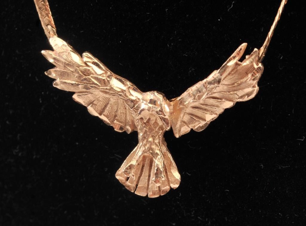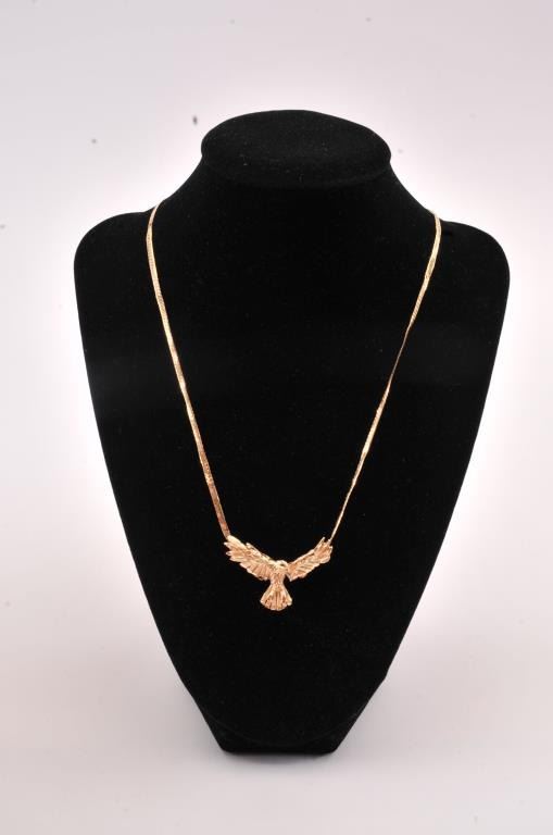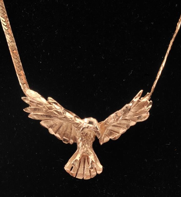 Hand carved in14 k yellow gold a flying eagle on on a chain weighing approx 9.4 grams Est:$250-500