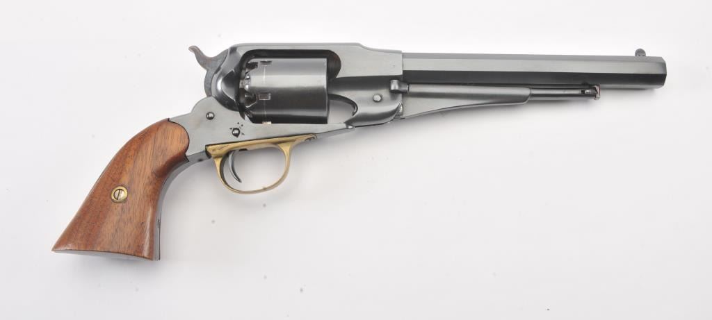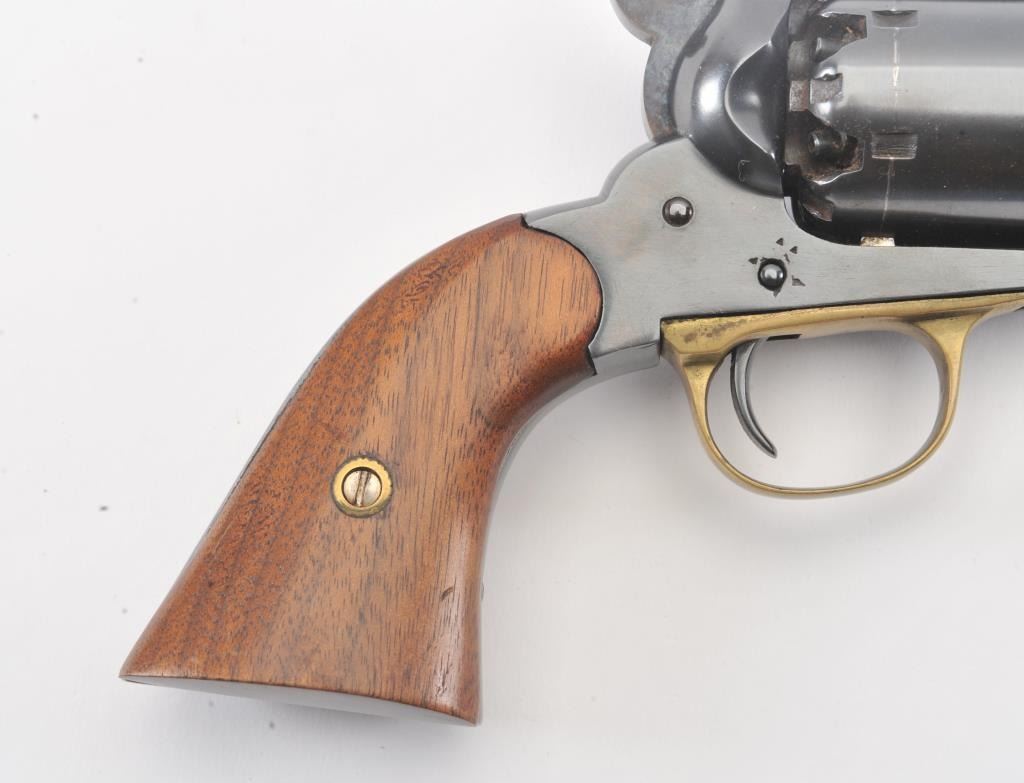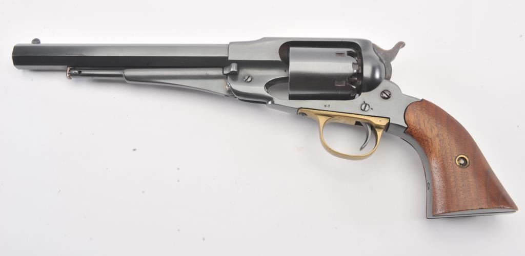 Remington Model 1858 percussion revolver, .44 caliber, 8” octagon barrel, re-blued finish, smooth wood grips, no visible S/N, “N.J.” marking on left bottom side of frame; overall good condition as re-finished, crisp action, majority of a quality older re-blue, good grips. (Percussion). Est.: $350-$700.