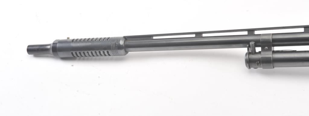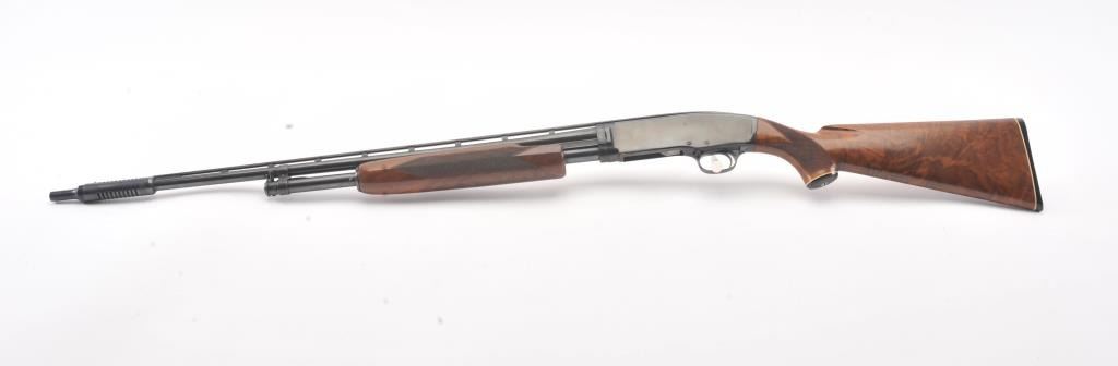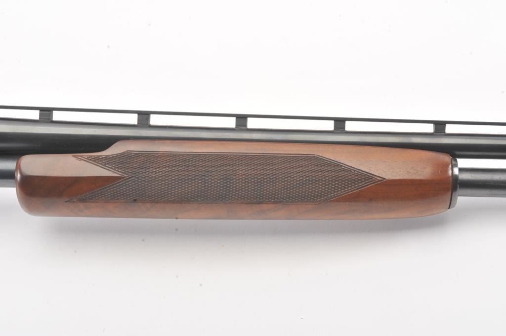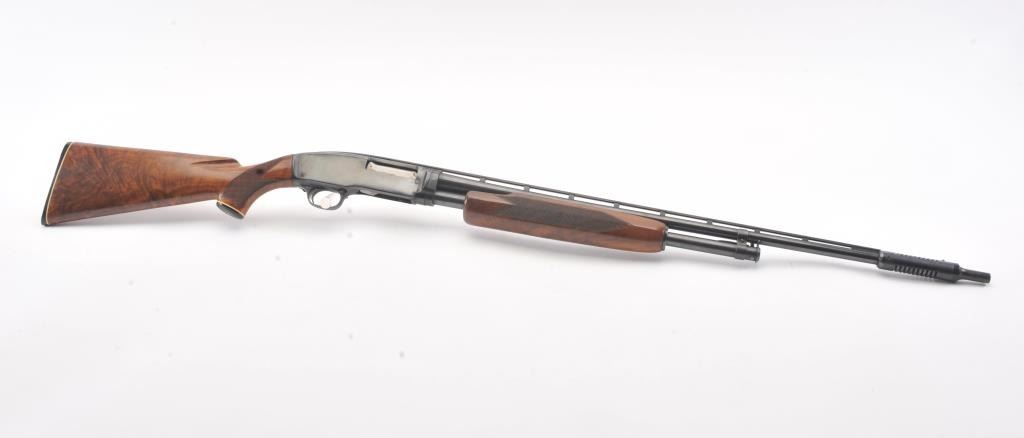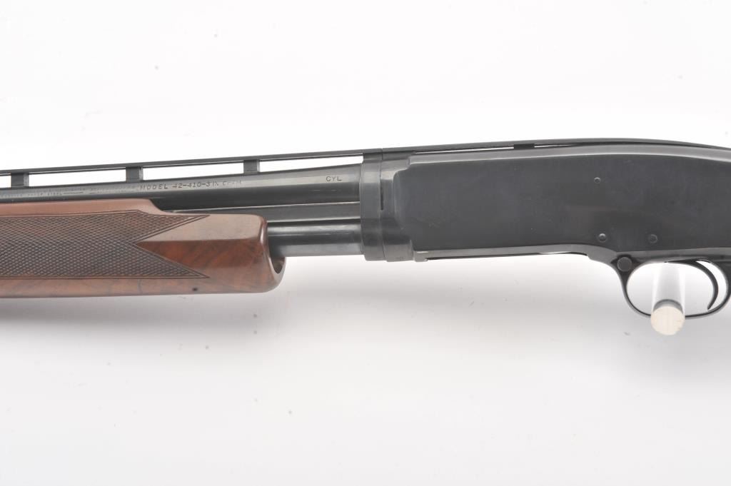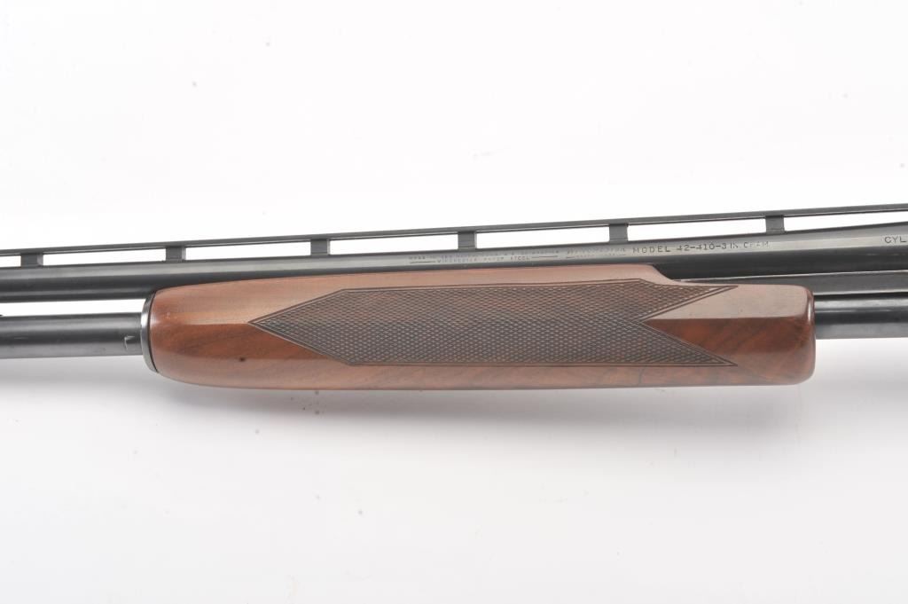 Winchester Model 42 custom takedown skeet pump action shotgun, .410 gauge, ventilated rib barrel with added Cutts compensator, deluxe checkered finely grained wood stocks, S/N 77686; majority of blued finish remaining on metal surfaces, fine bore, crisp action, beautiful stocks. (Modern). Est.: $900-$1,800.