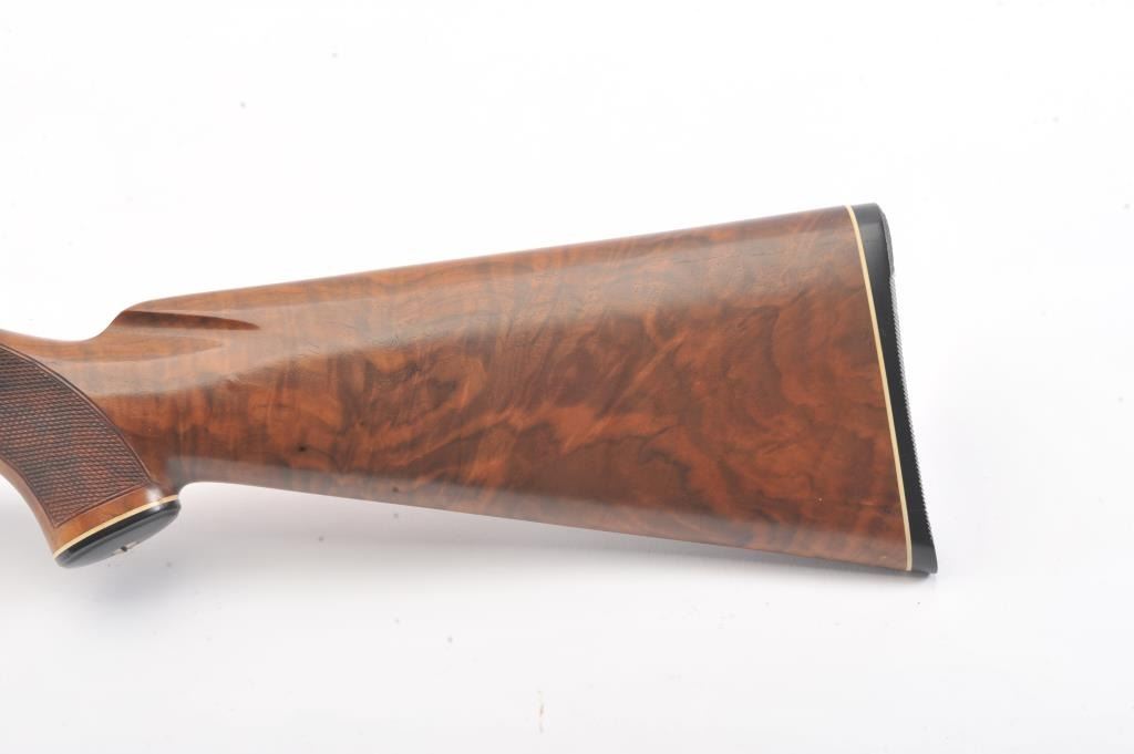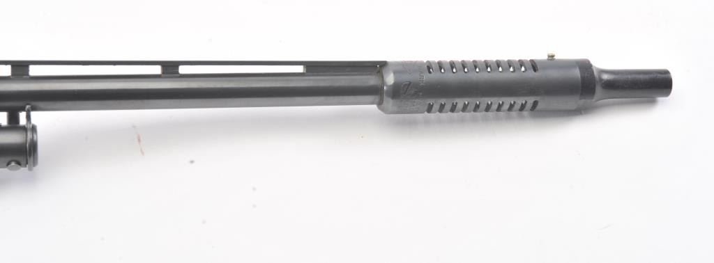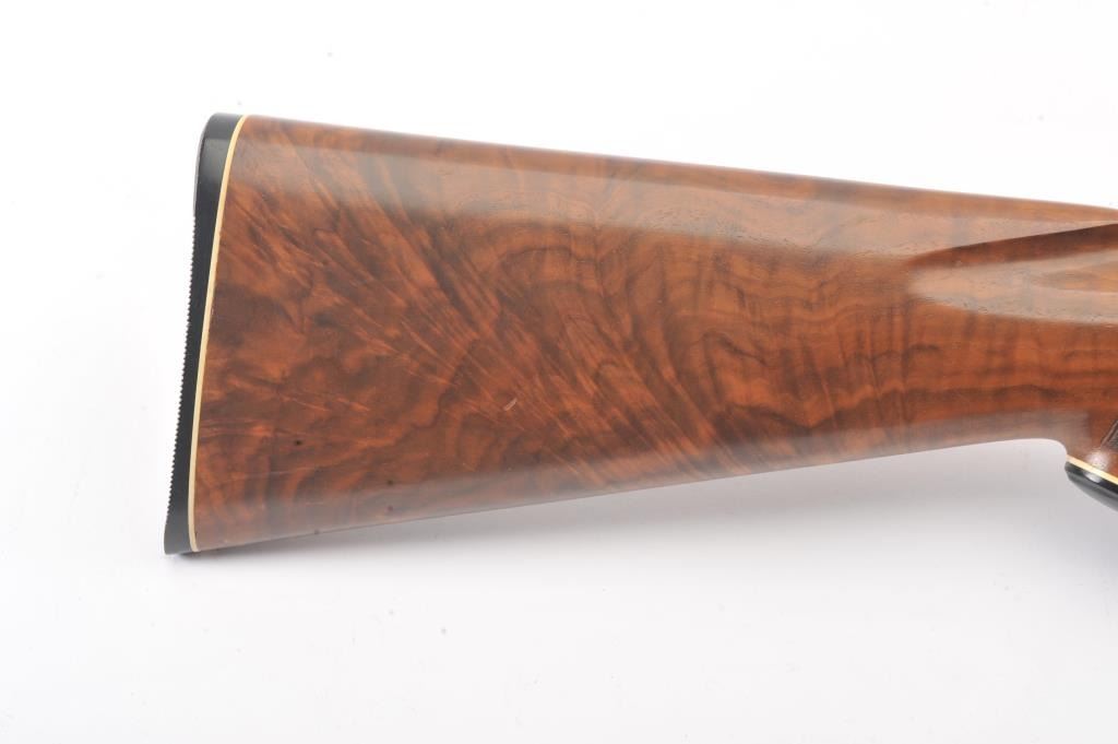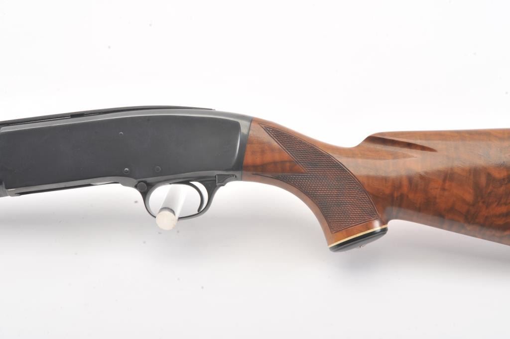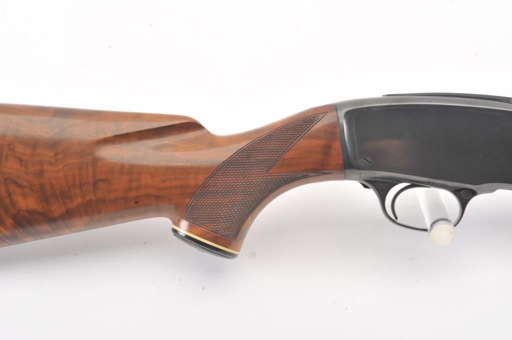 Winchester Model 42 custom takedown skeet pump action shotgun, .410 gauge, ventilated rib barrel with added Cutts compensator, deluxe checkered finely grained wood stocks, S/N 77686; majority of blued finish remaining on metal surfaces, fine bore, crisp action, beautiful stocks. (Modern). Est.: $900-$1,800.