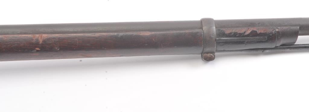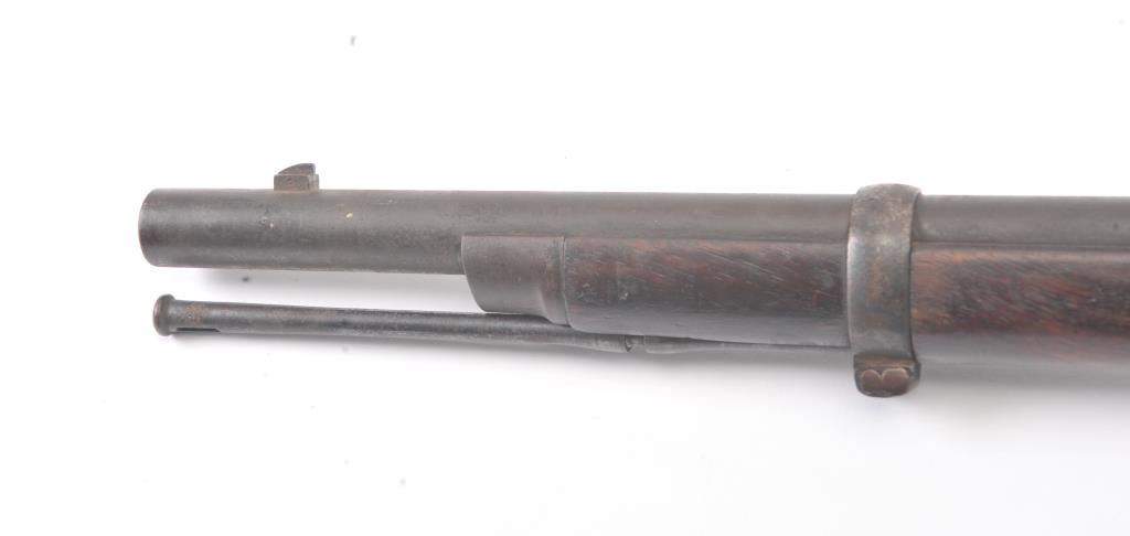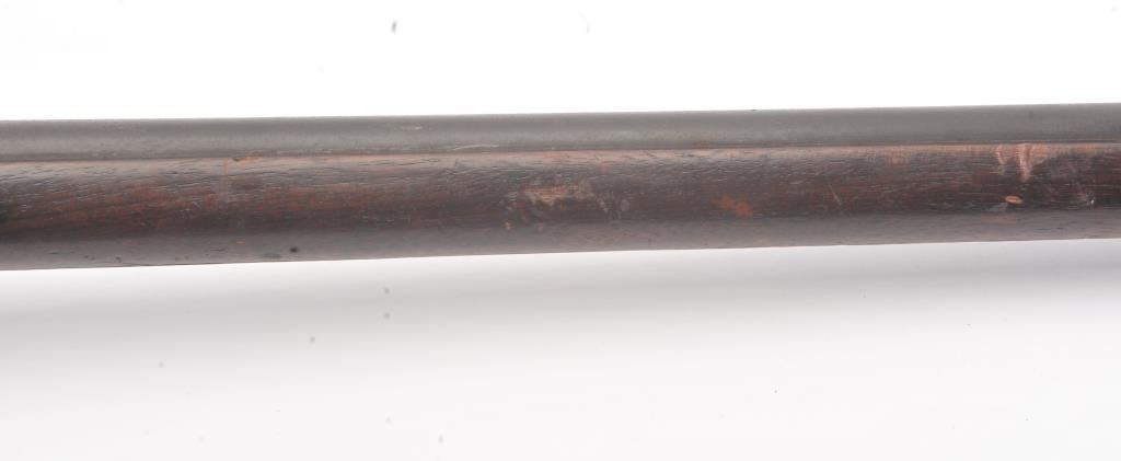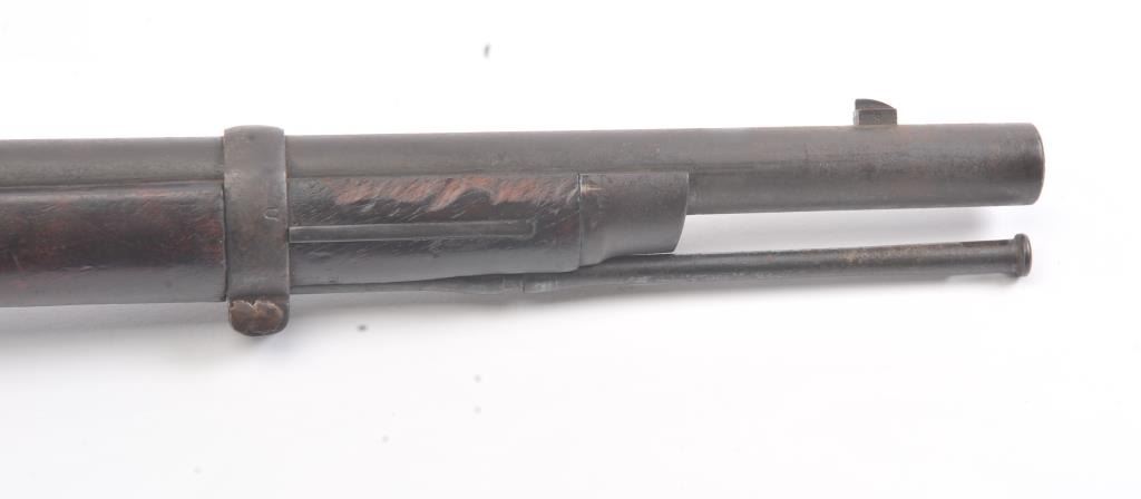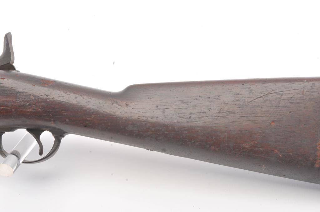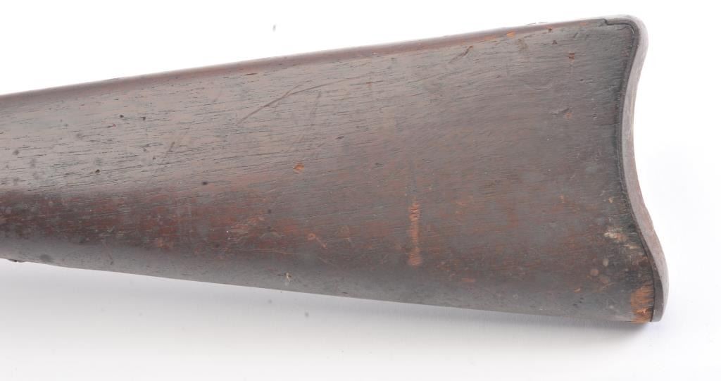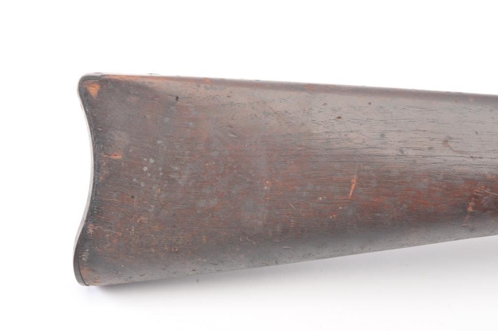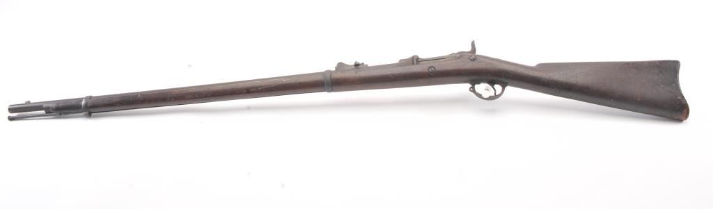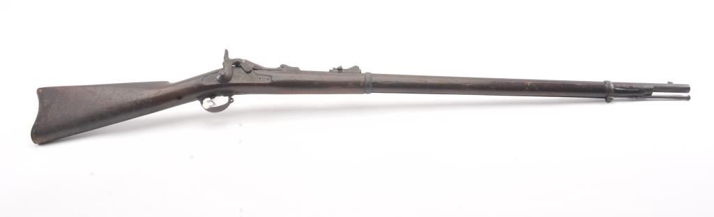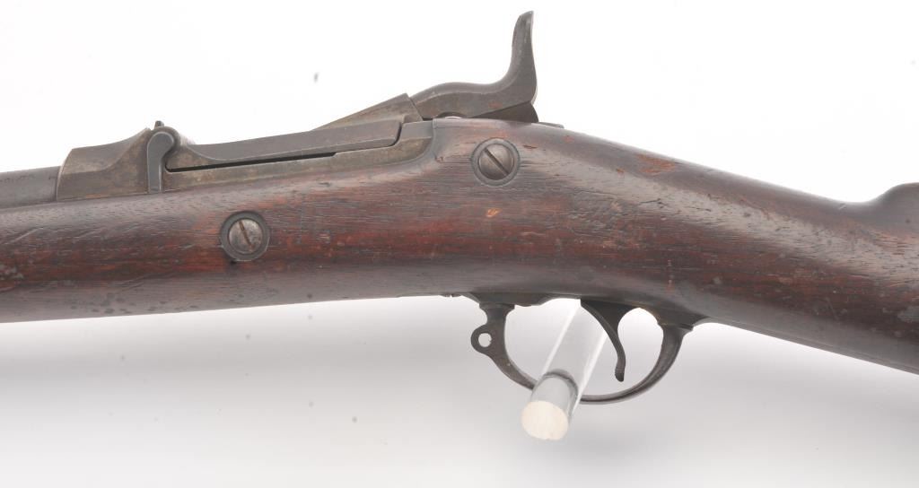 Springfield Trapdoor rifle, .45-70 caliber, Serial #274800. The rifle is in uncleaned as found condition with a heavy brown patina and light to moderate erosion and pitting. The wood shows many dings, mars and chips.The rifle retains the correct rod and sights with the markings visible. The trigger guard swivel is missing. The action is good, the bore is dark and dirty but may clean up. A nice, as found, “out of the attic” conditiontrapdoor. Est.: $400-800 (Antique).