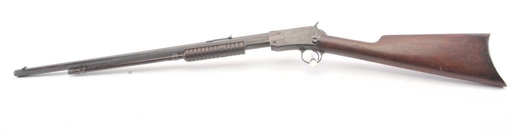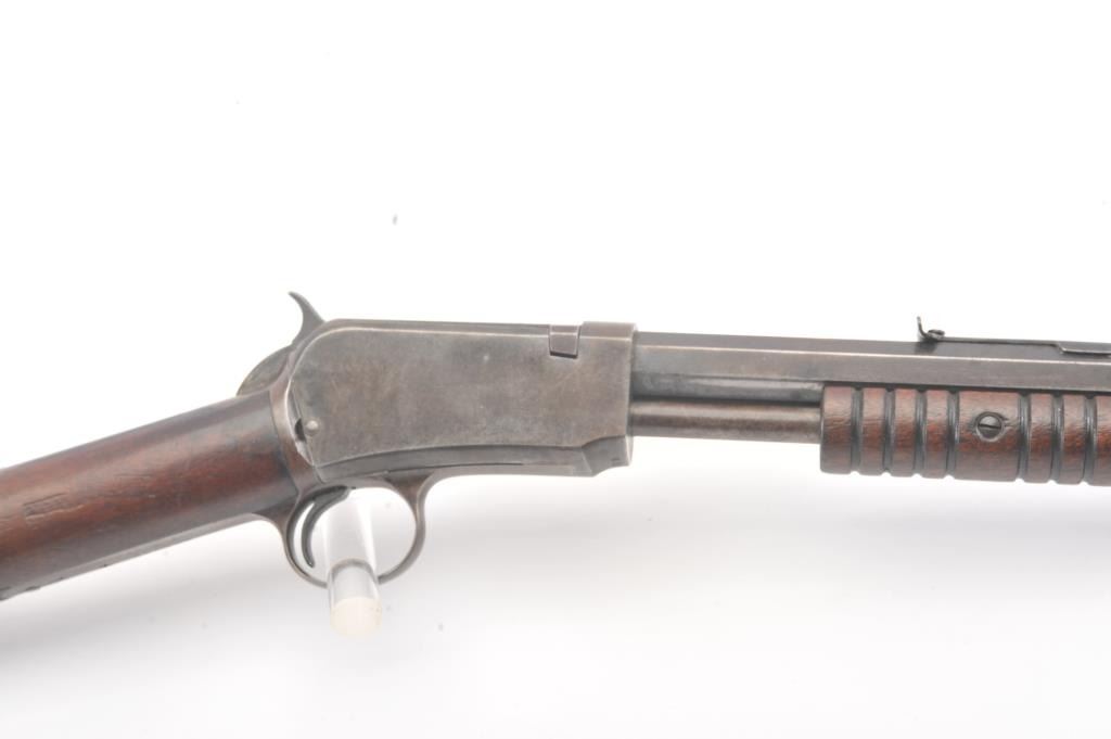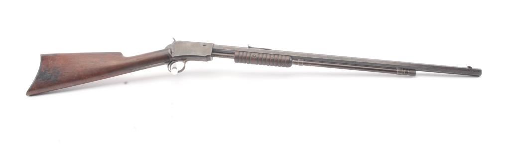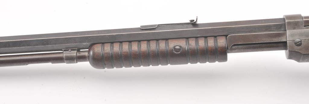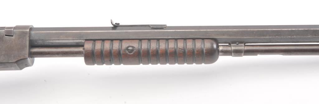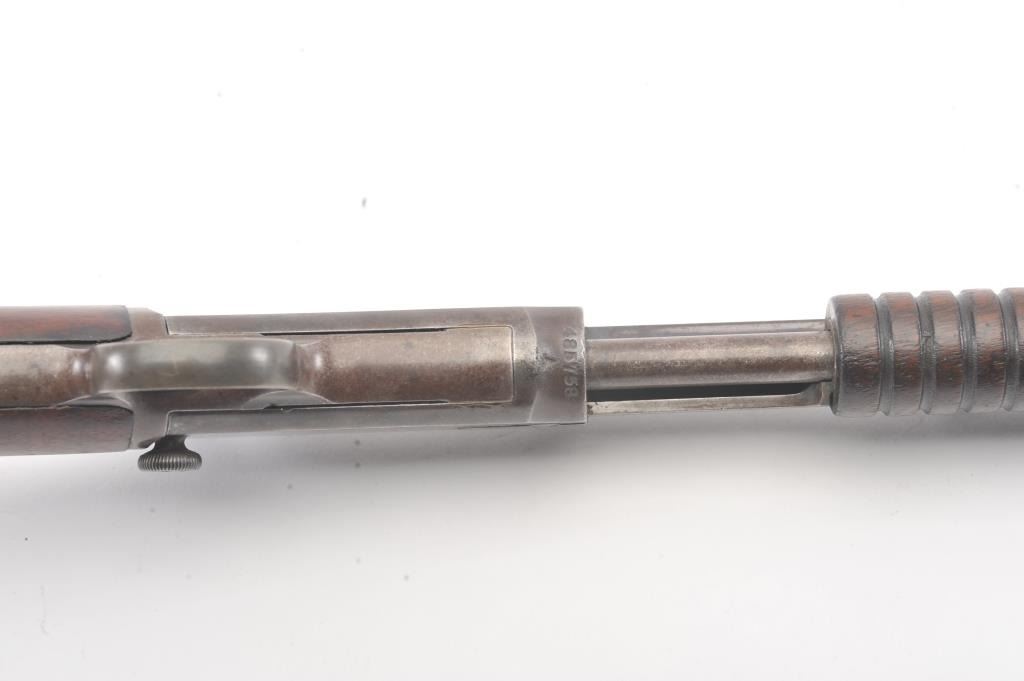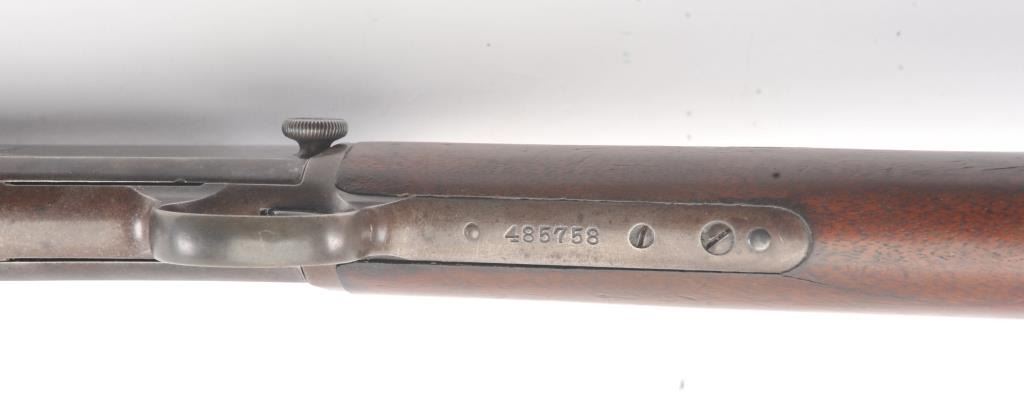 Winchester Model 1890 pump action rifle, .22 Long Rifle caliber, Serial #485758. The rifle is in good condition with traces of finish within a grey patina. The stocks are good with minor imperfections, with a goodaction and a dirty bore that may clean up. Est.: $300-600 (C+R).