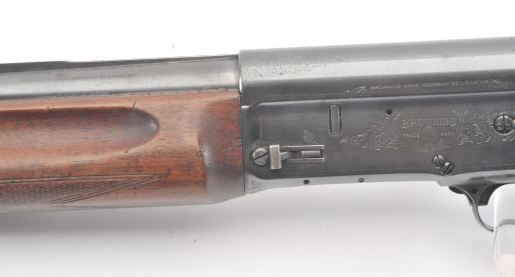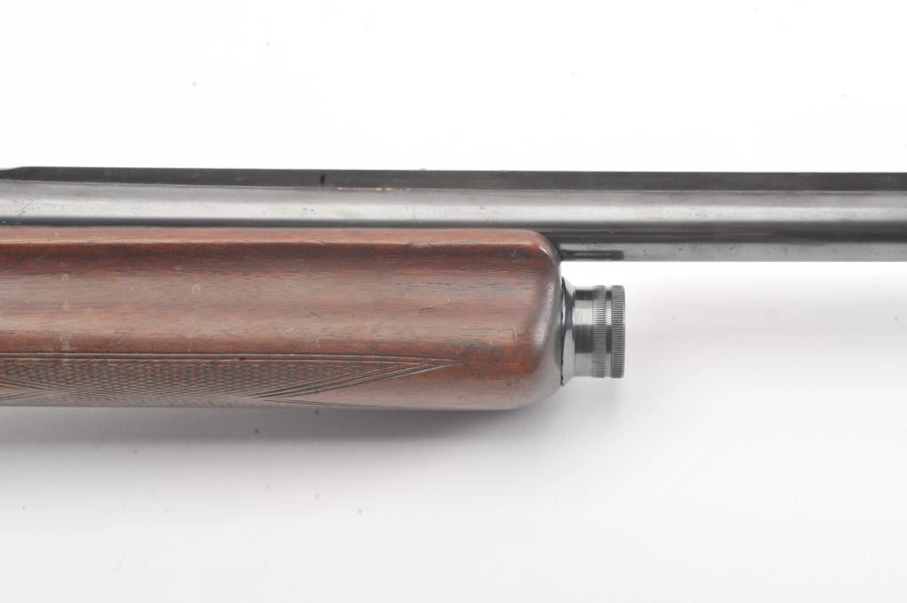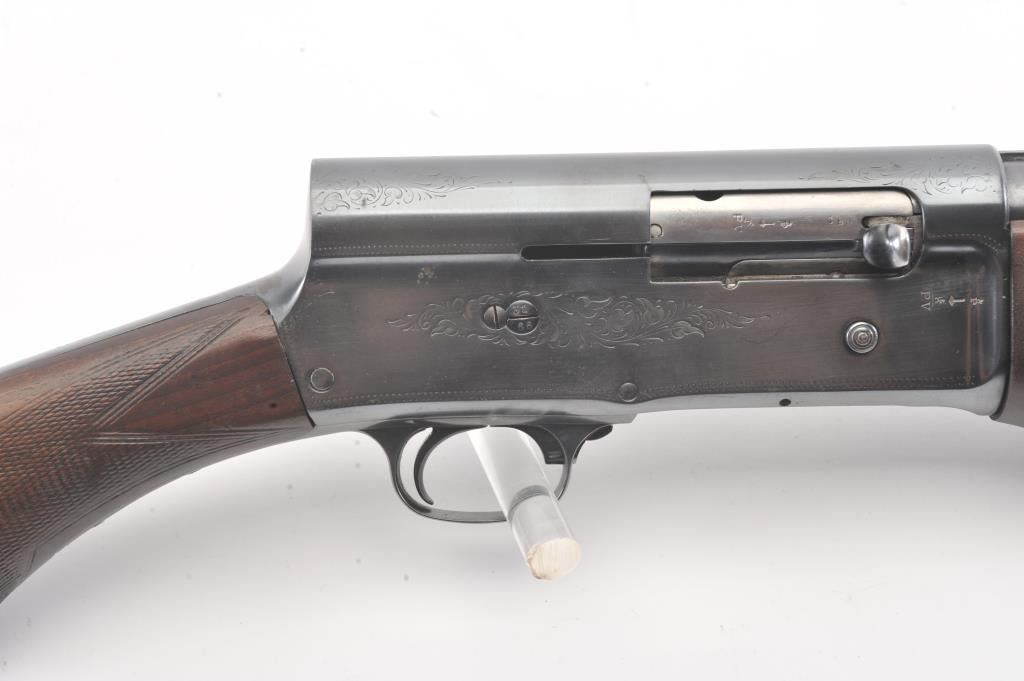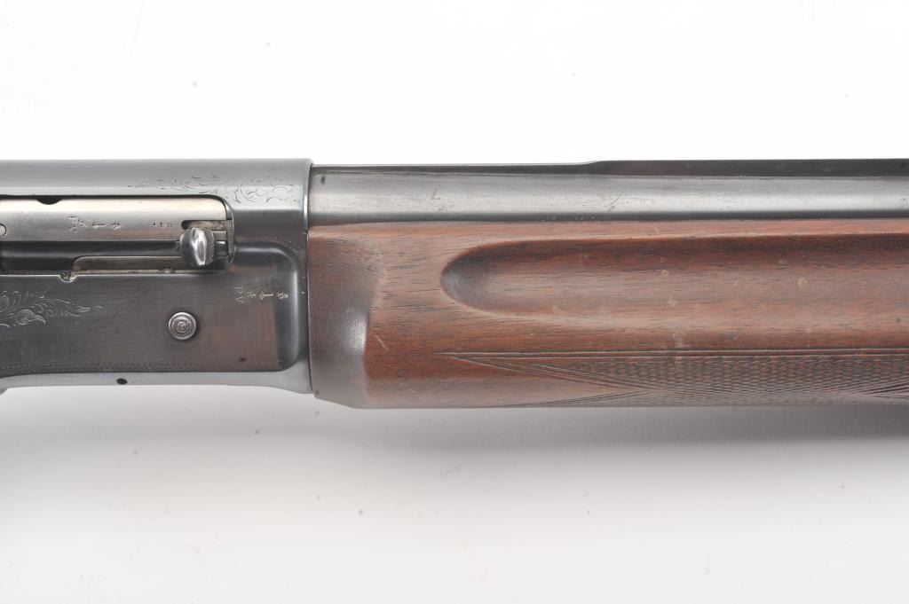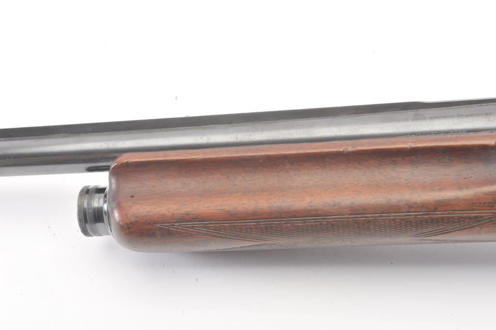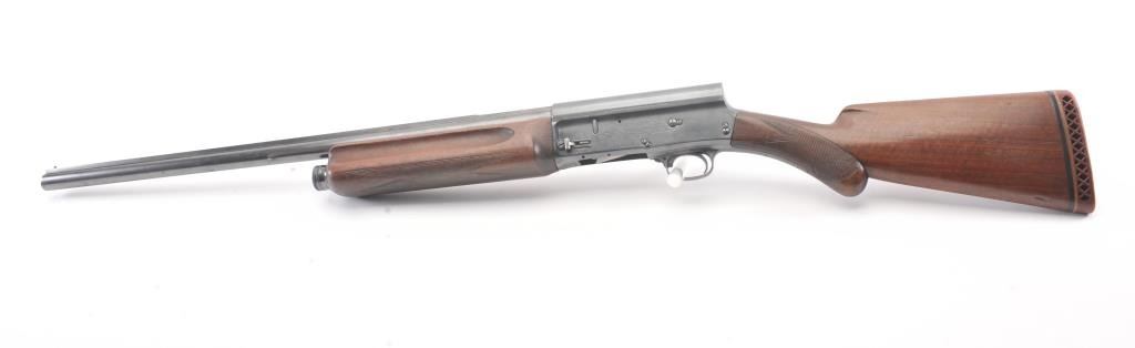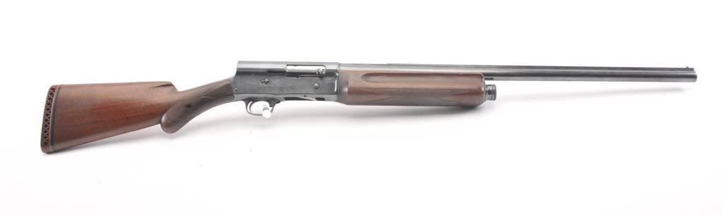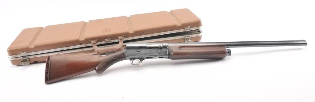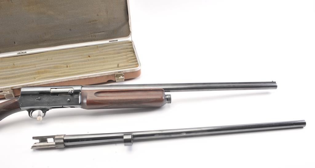 Browning Auto 5 semi-automatic shotgun, 12 gauge, Serial #193166. The shotgun is in very good overall condition as refinished with a two-barrel set including 25” and 27” barrels, each with a full-length filed rib.The barrels retain the majority of the blue finish with scratches and edge wear consistent with field use. The 27” barrel is choked Full and the 25” is choked Modified, each have numerous Belgian proofs andacceptance marks. The receiver retains a significant amount of an old, quality re-blue with small mars. The checkered wood stock is in good condition with flattening of checkering and a round knob pistol grip. The buttstock ends with a ventilated rubber recoil pad providing a 14” LOP. The shotgun comes in a luggage case. Est.: $300-$600. (C+R).