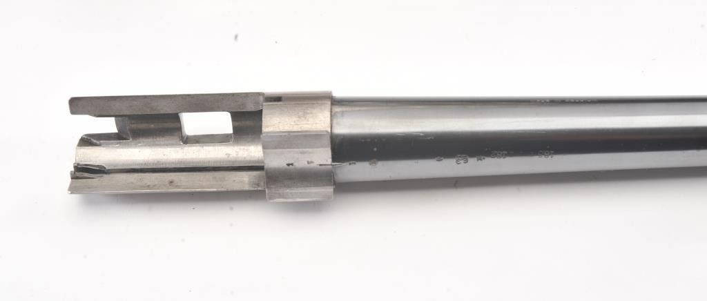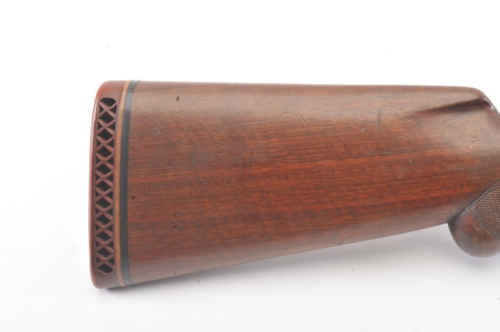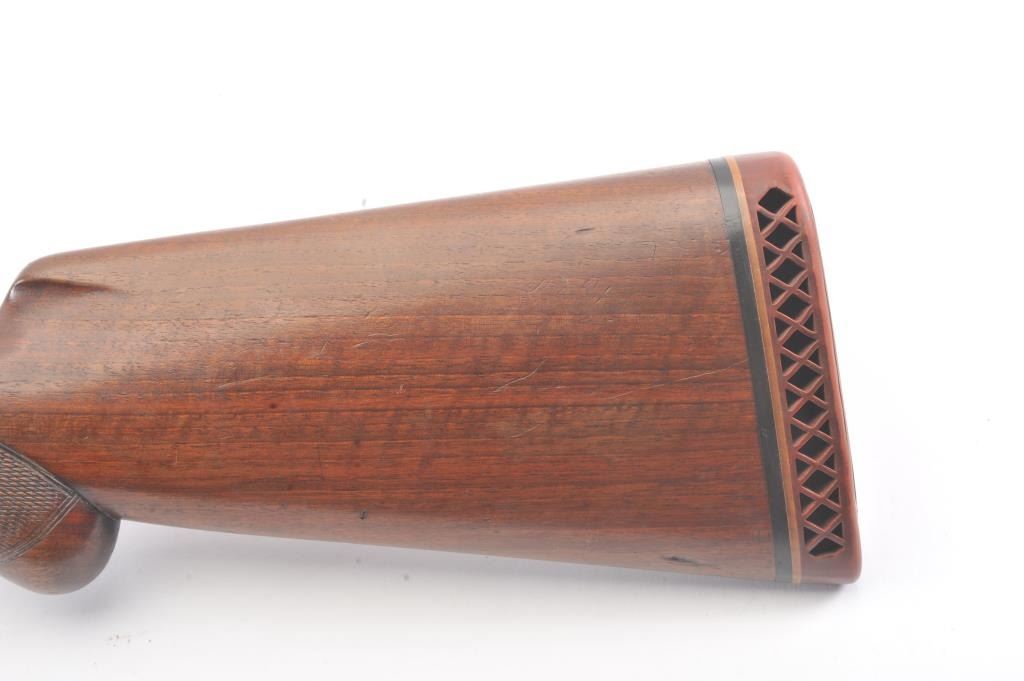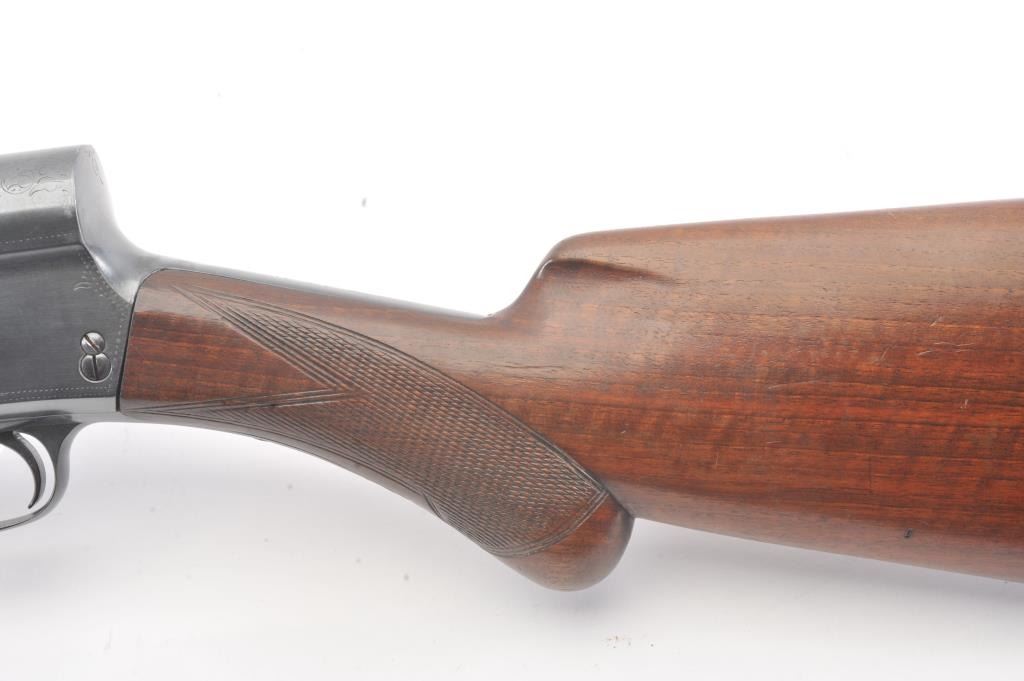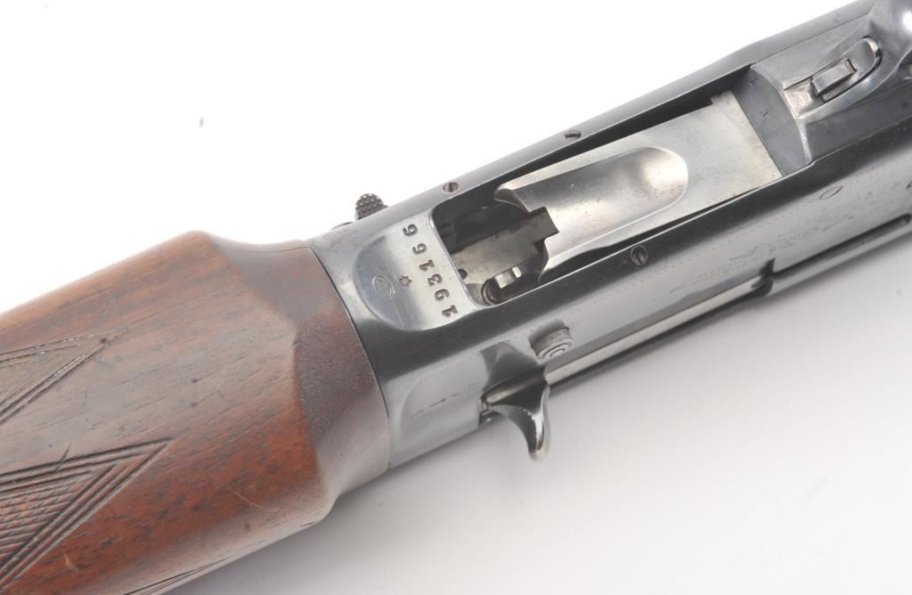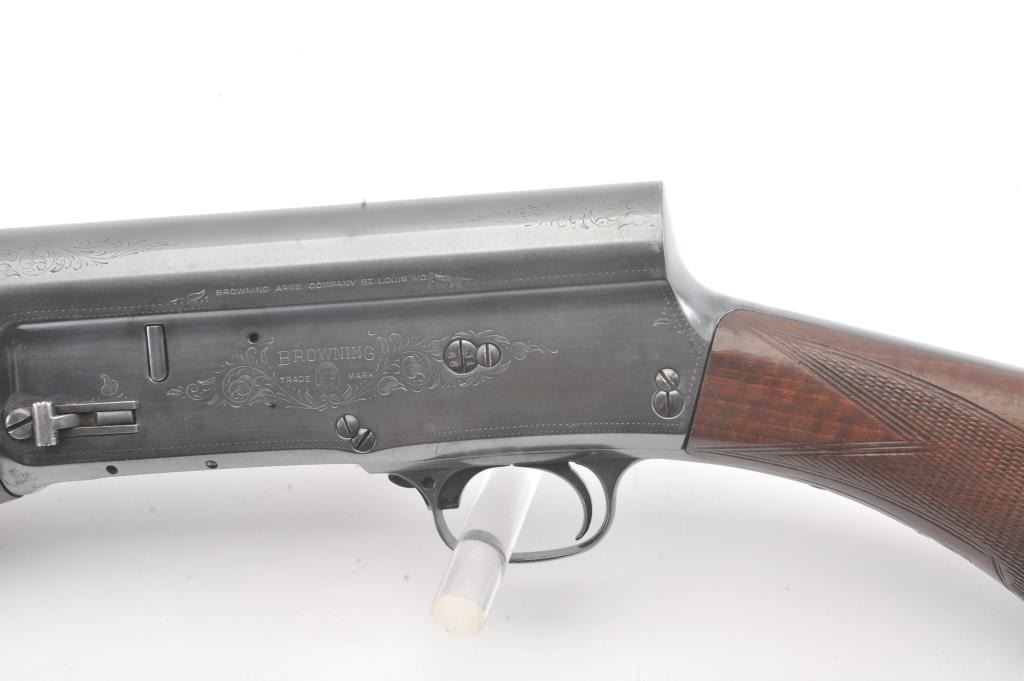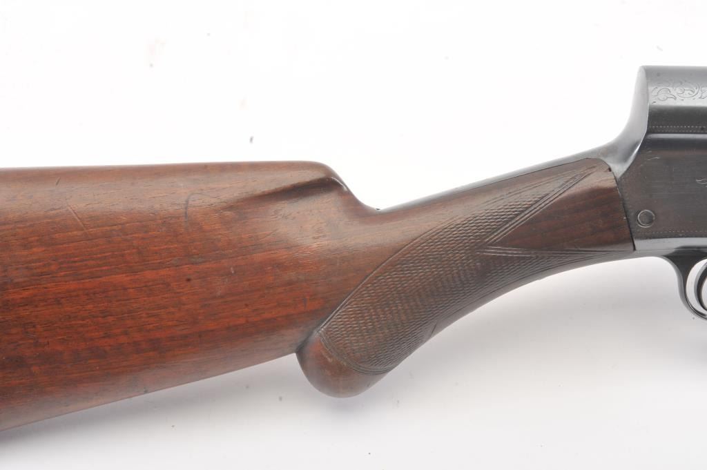 Browning Auto 5 semi-automatic shotgun, 12 gauge, Serial #193166. The shotgun is in very good overall condition as refinished with a two-barrel set including 25” and 27” barrels, each with a full-length filed rib.The barrels retain the majority of the blue finish with scratches and edge wear consistent with field use. The 27” barrel is choked Full and the 25” is choked Modified, each have numerous Belgian proofs andacceptance marks. The receiver retains a significant amount of an old, quality re-blue with small mars. The checkered wood stock is in good condition with flattening of checkering and a round knob pistol grip. The buttstock ends with a ventilated rubber recoil pad providing a 14” LOP. The shotgun comes in a luggage case. Est.: $300-$600. (C+R).