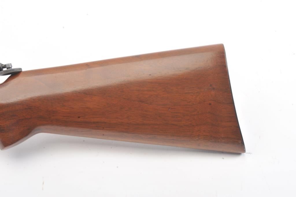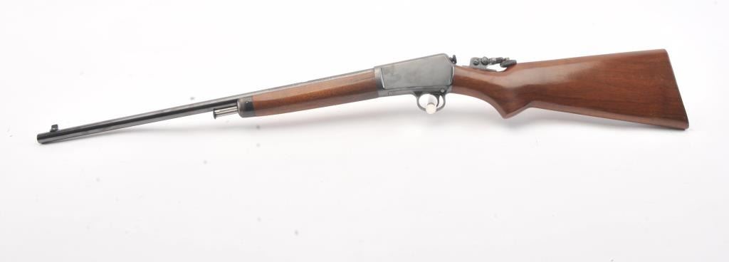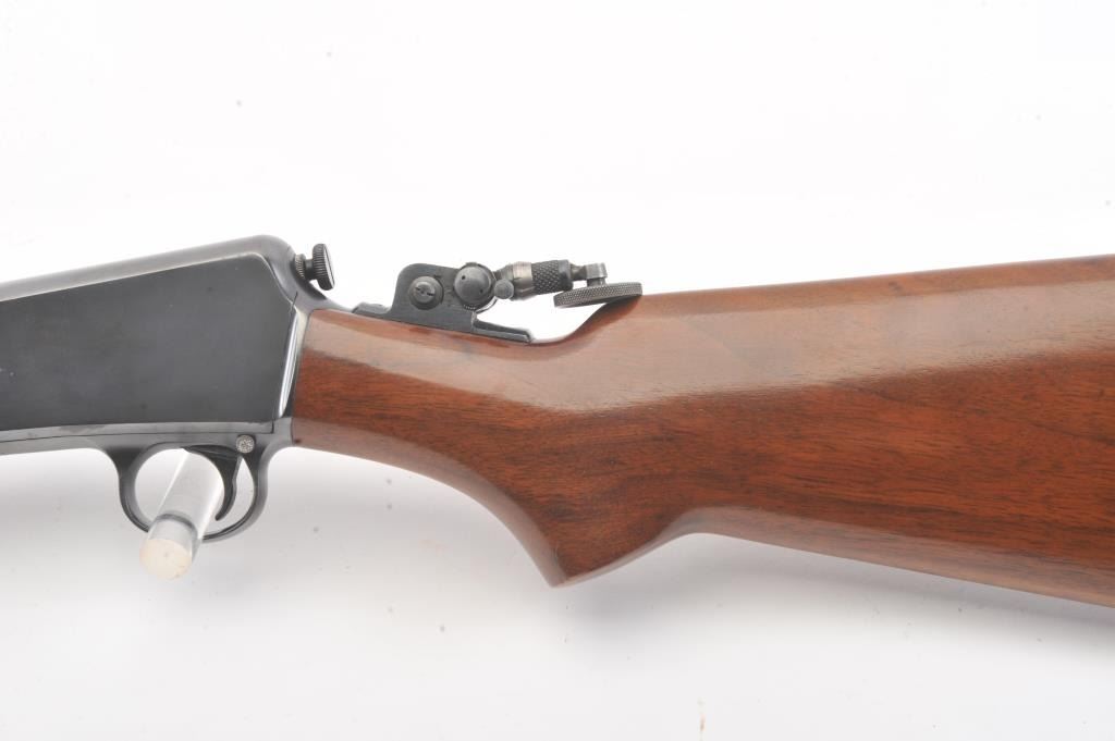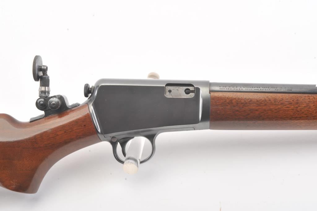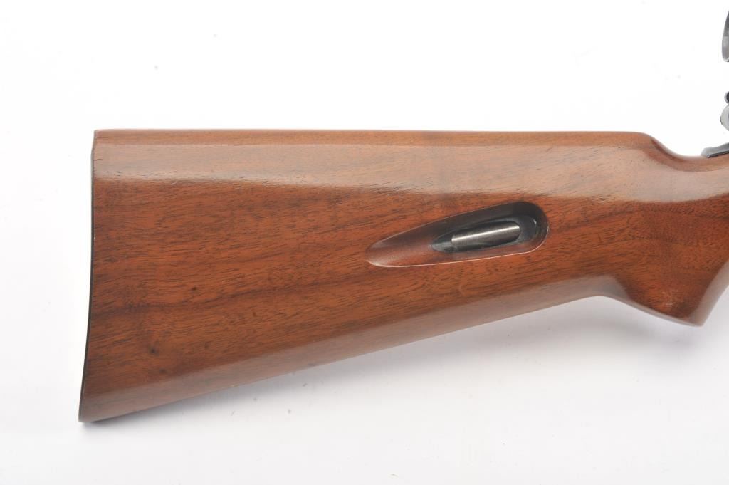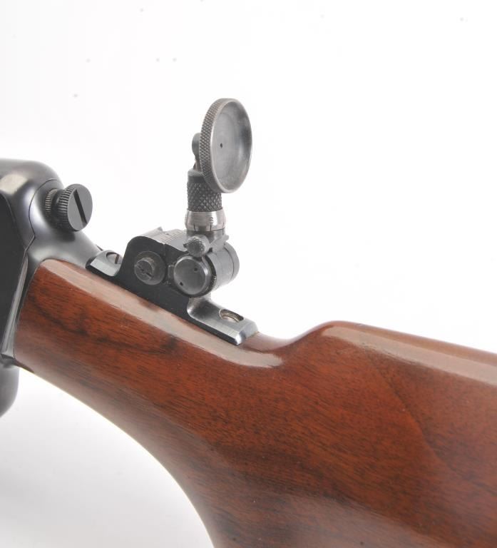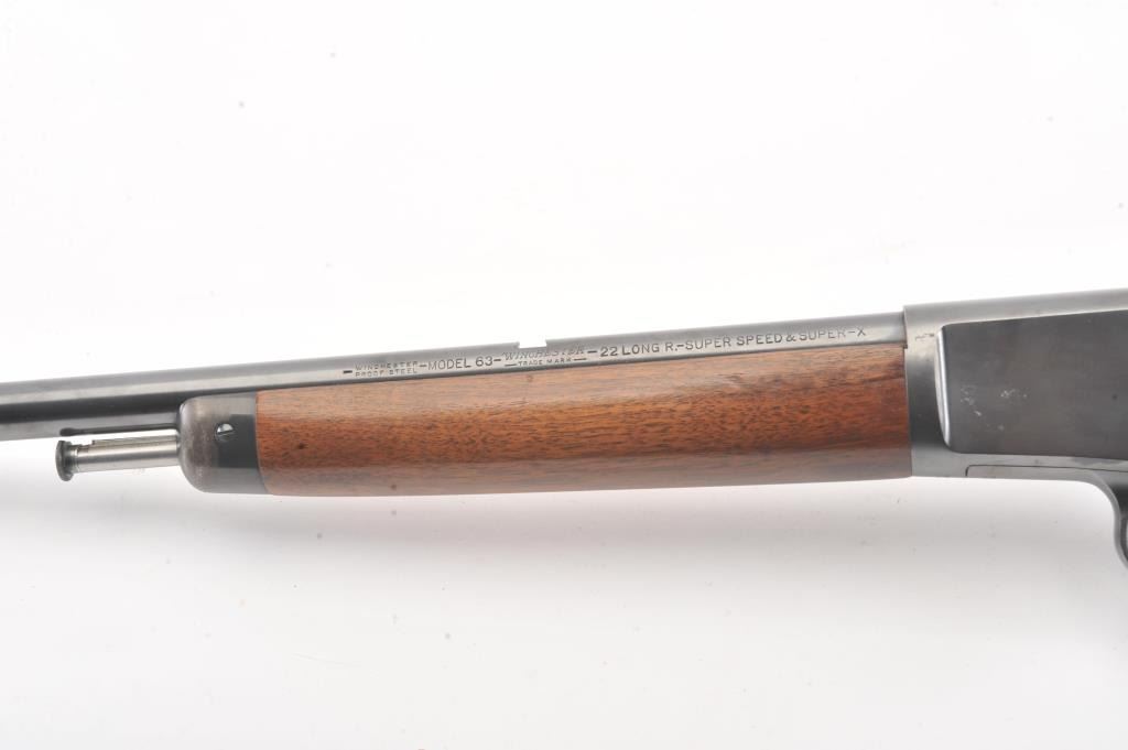 Winchester 63 .22 Semi-Auto rifle marked for Super Speed and Super X with a 20” barrel, S/N 3962. Near fine original condition with 96%-99% original blue with slight flaking on the fore end cap only. The wood is almostfine with minor crack in the left forearm. Adjustable windage and elevation period tang sight with high white dot front in factory dovetail. The bore is excellent. A 9.5 on a 1-10 scale. Est.: $750-$1500