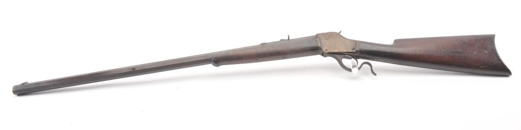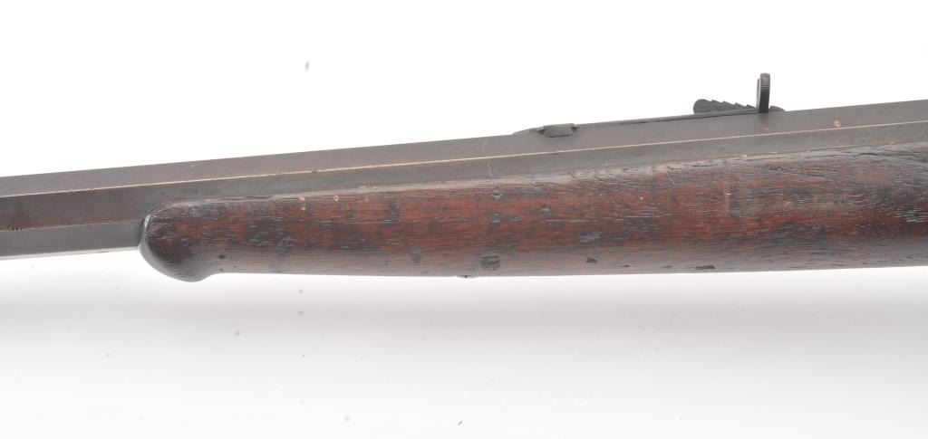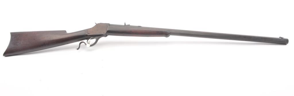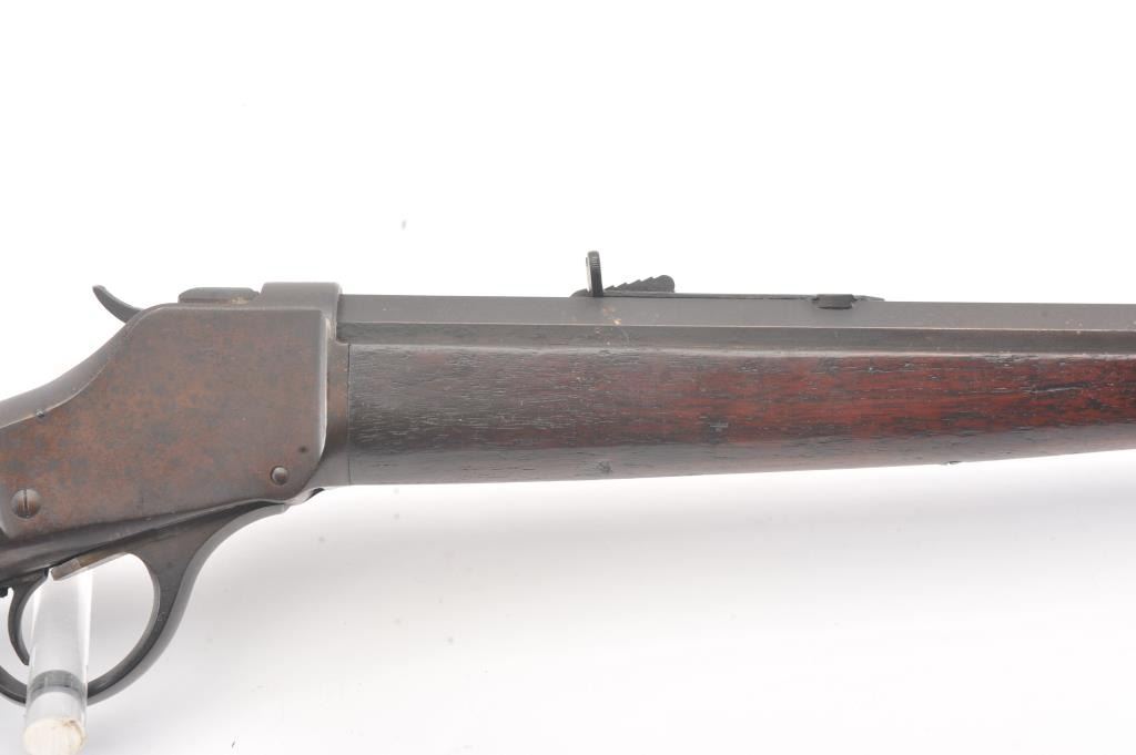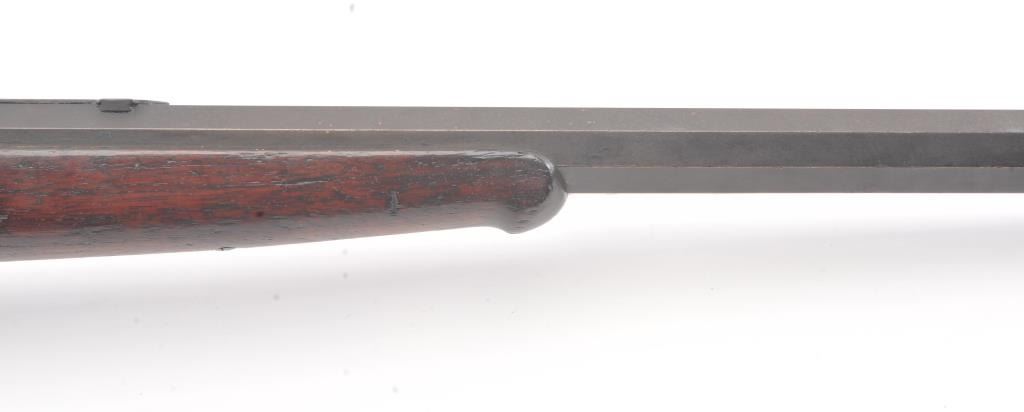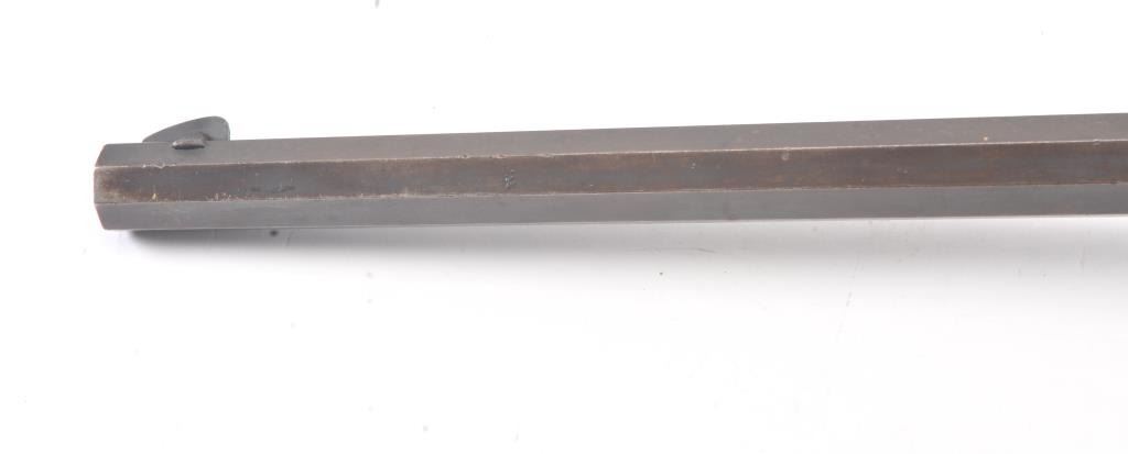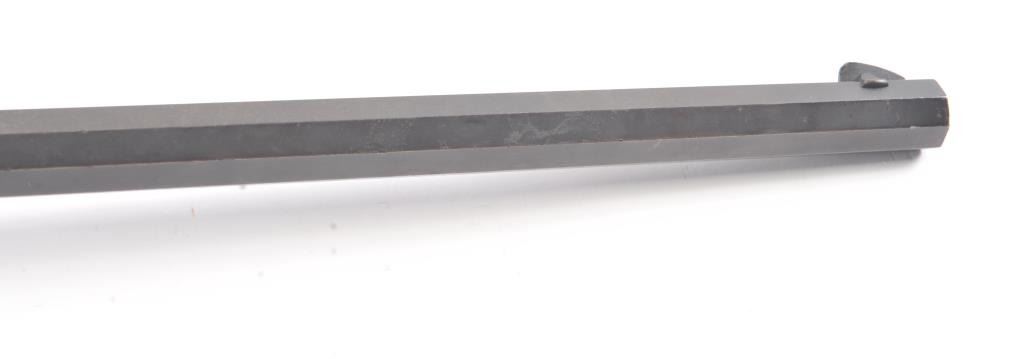 Winchester Hi-Wall Single Shot Rifle in .40-82 caliber with a 30” octagon barrel and single set trigger, S/N 23787. Uncleaned “Out of the attic” condition with the finish showing under erosion. Dirt and surface rust. Good markings. The wood is oil stained but good. The bore is bright with strong rifling. For the collector who likes ‘As Found” with a western frontier look. (Antique) Est.: $700-1400