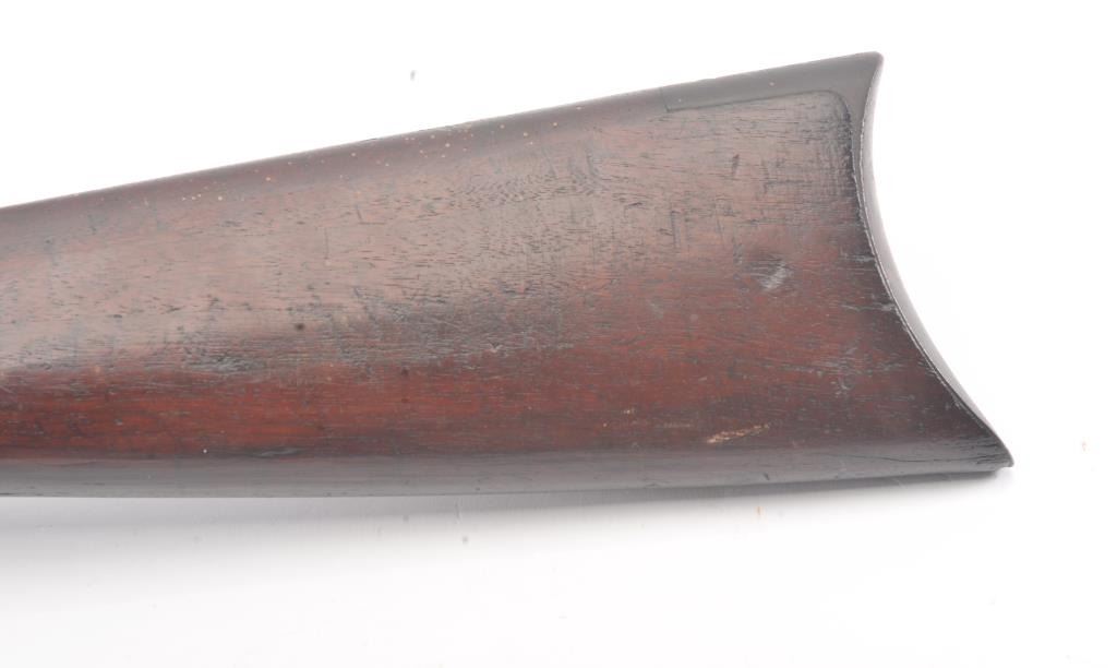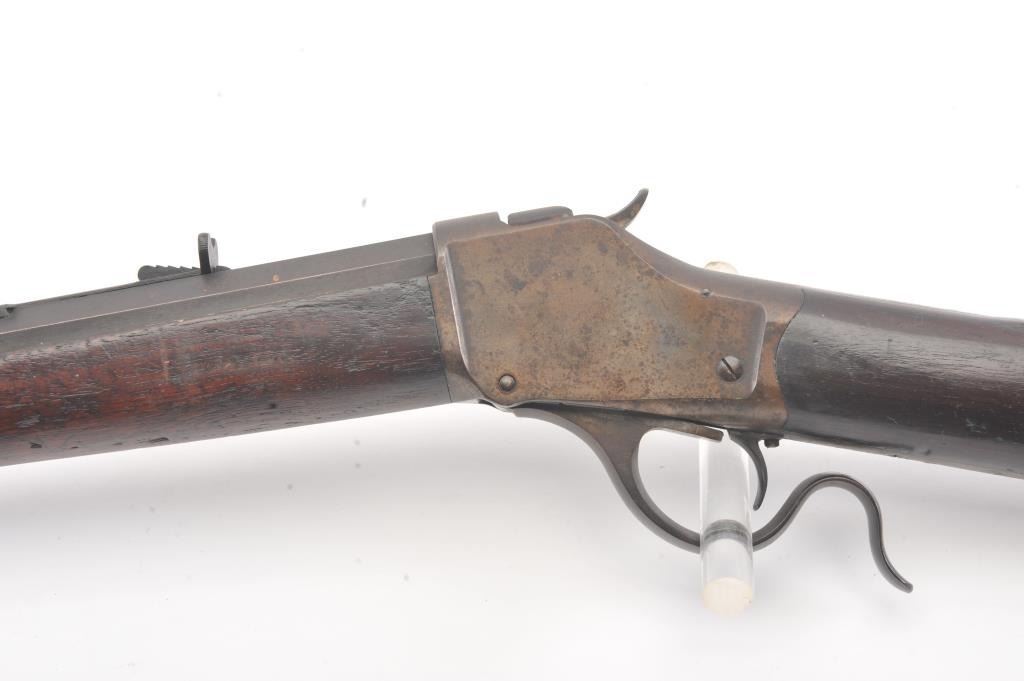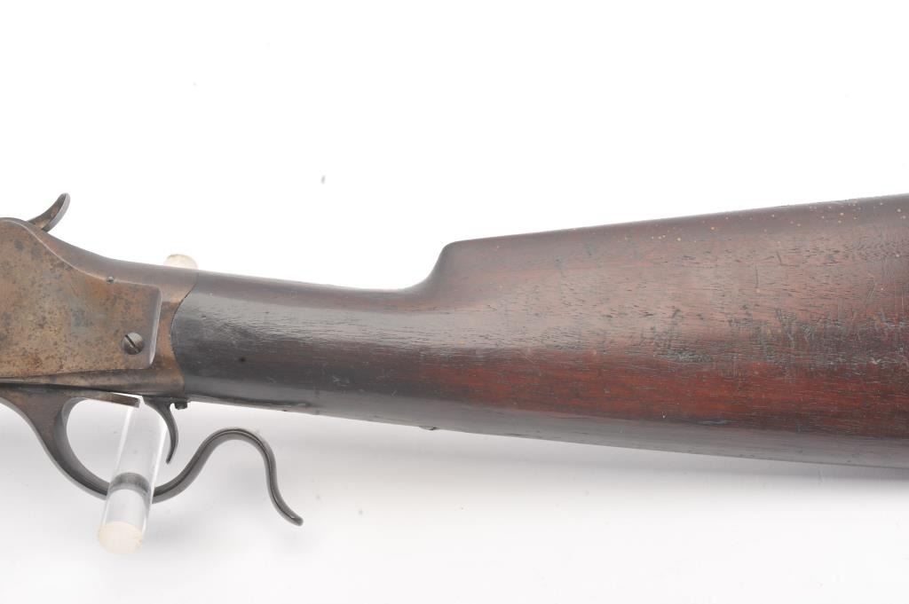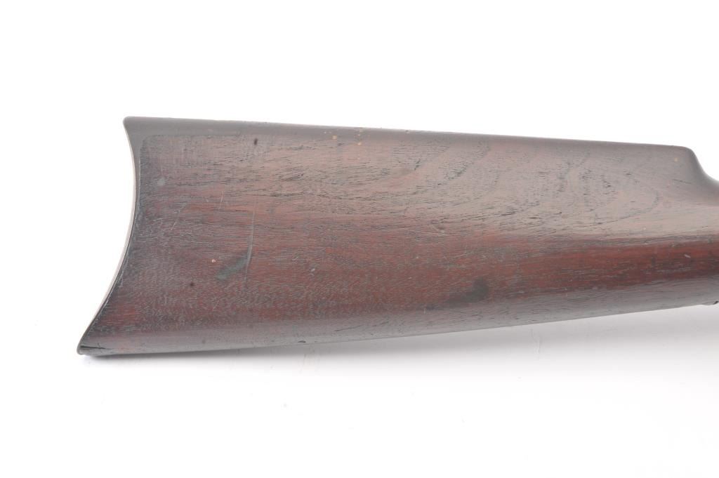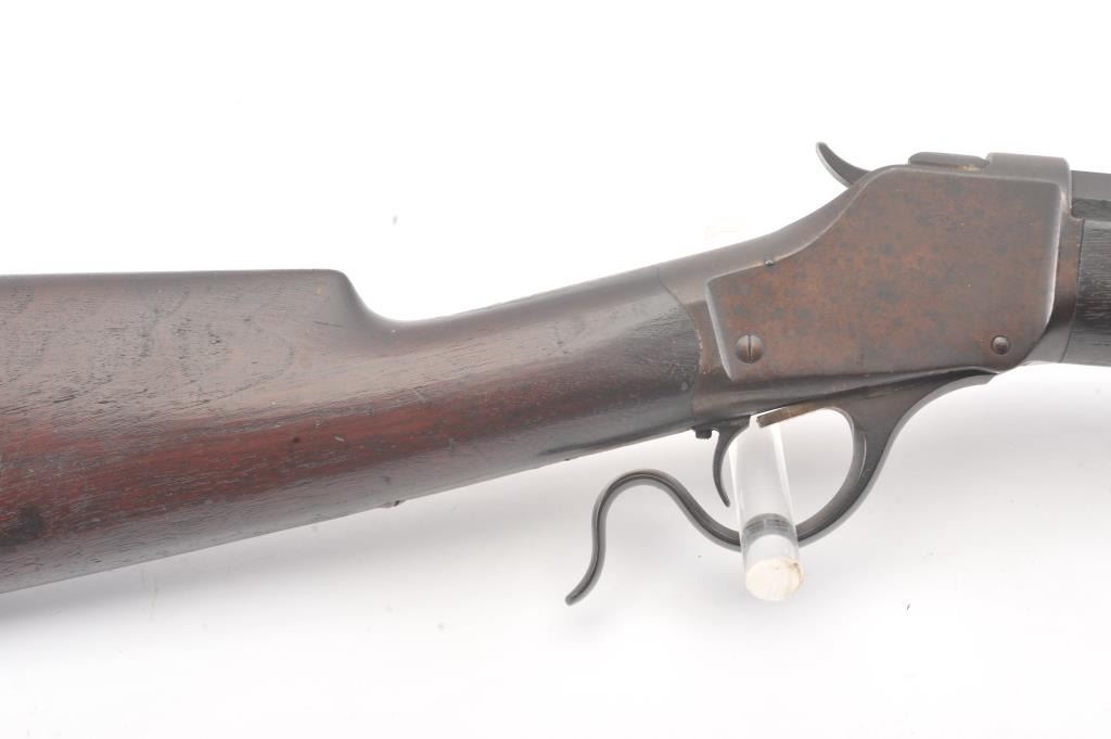 Winchester Hi-Wall Single Shot Rifle in .40-82 caliber with a 30” octagon barrel and single set trigger, S/N 23787. Uncleaned “Out of the attic” condition with the finish showing under erosion. Dirt and surface rust. Good markings. The wood is oil stained but good. The bore is bright with strong rifling. For the collector who likes ‘As Found” with a western frontier look. (Antique) Est.: $700-1400