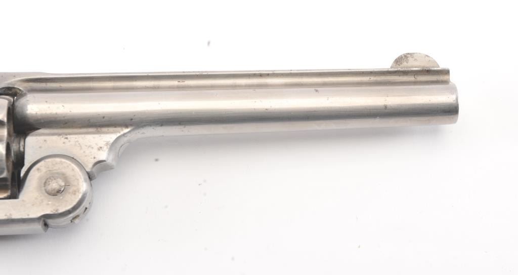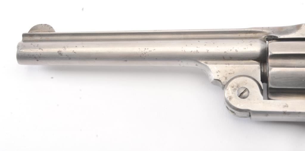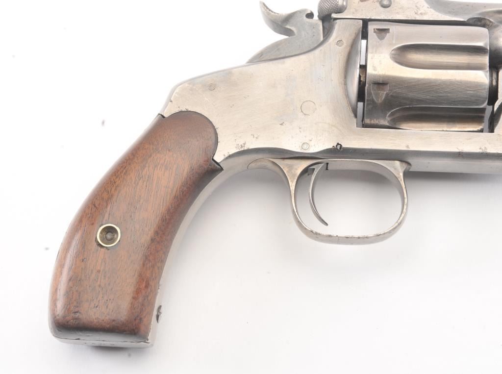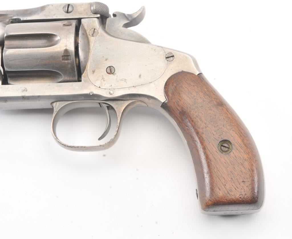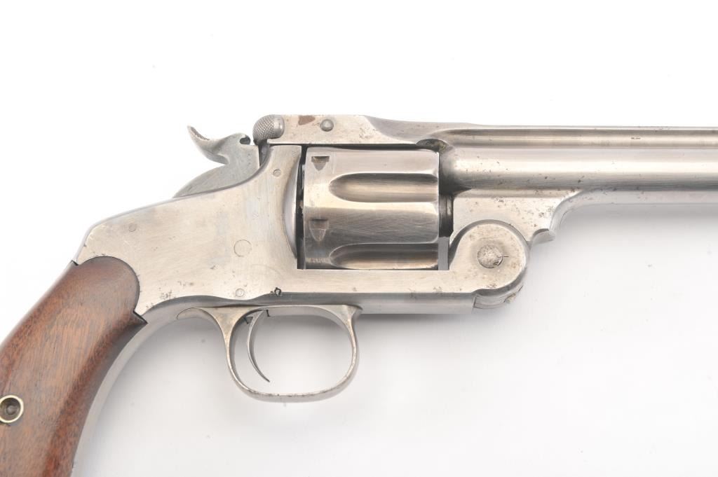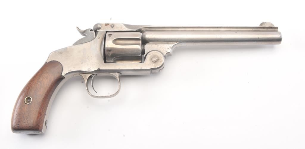 Smith & Wesson New Model #3 SA revolver, .44 caliber, Serial #1509. The pistol is in good overall condition with a 6 ½” barrel. The pistol has been cleaned to a silver patina with a crisp barrel address and the frontsight has been thinned slightly and matching serial numbers. The hammer and trigger show light toned case colors. The smooth wood grips fit well and are in very good condition with only small mars and an extra coat ofvarnish. The pistol locks up tight with a crisp action and dark bore. Est.: $600-$1,200. (Antique).