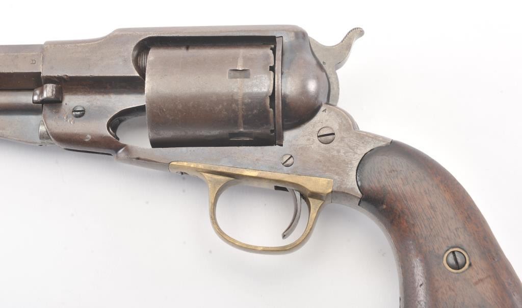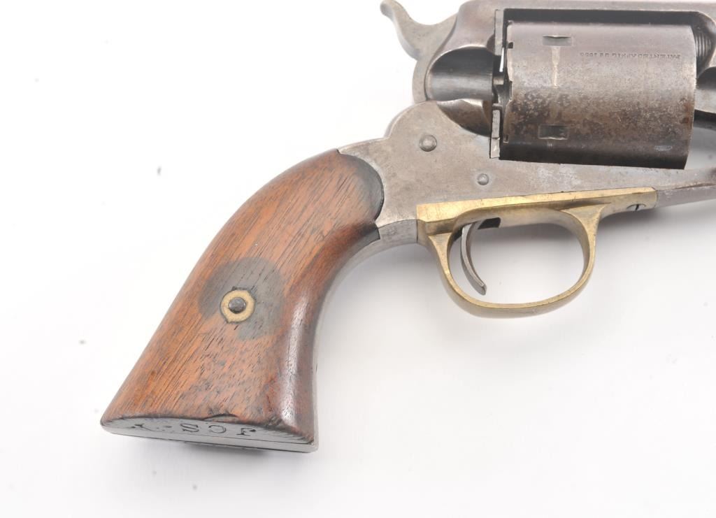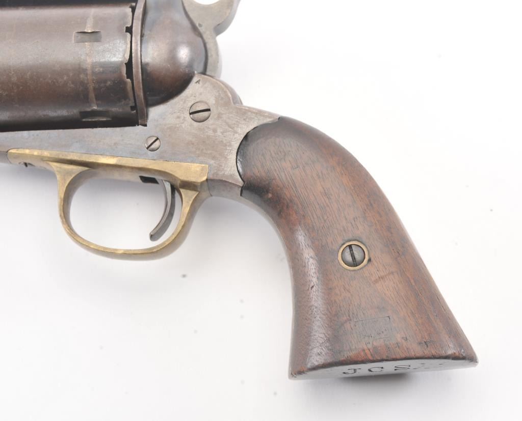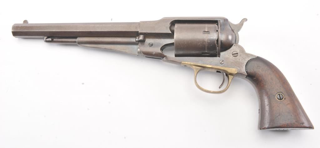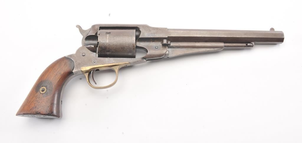 Remington Model 1858 New Model single action Rollin White patent cartridge conversion revolver, .46 cal., 8” octagon barrel, blue finish, brass trigger guard, wood grips, #126281. The barrel address and cylinder show crisp markings. This gun is in overall good condition showing a medium brown patina on metal surfaces with some scattered areas of erosion and pitting, some traces of blue in protected areas of frame and loading lever,good action and overall good bore; the underside of the barrel is stamped “289 S” with “D” and “R” proofs on the barrel, grips are good with small mars and knackering on the butt from hammering nails and “JCS” isstamped on the base of each grip. Est.: $700-$1,400. (Antique).