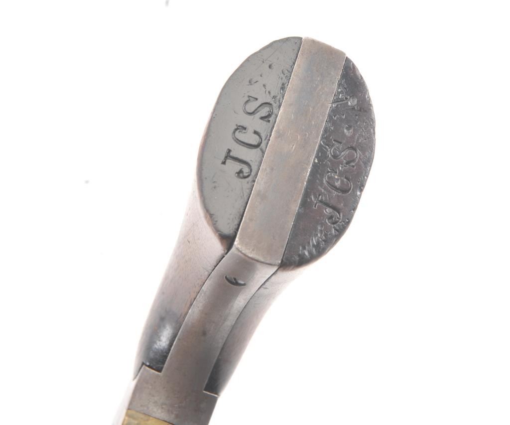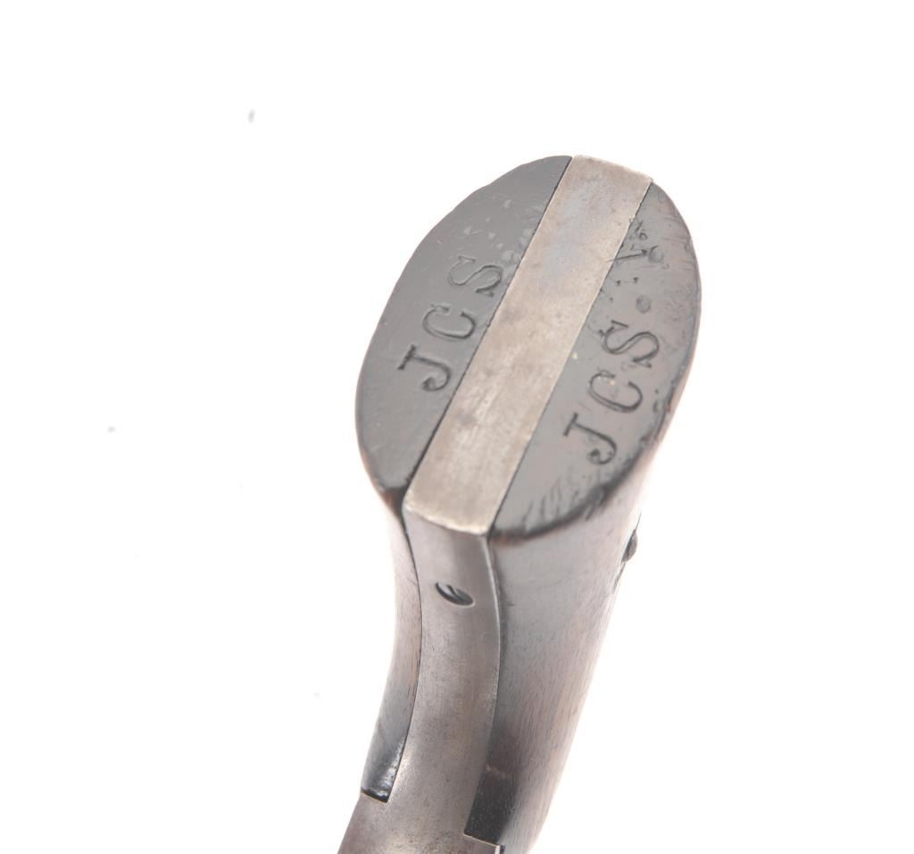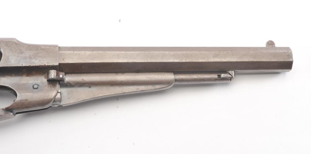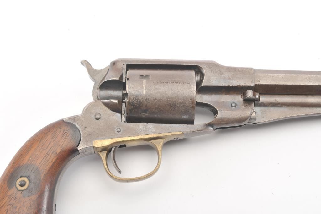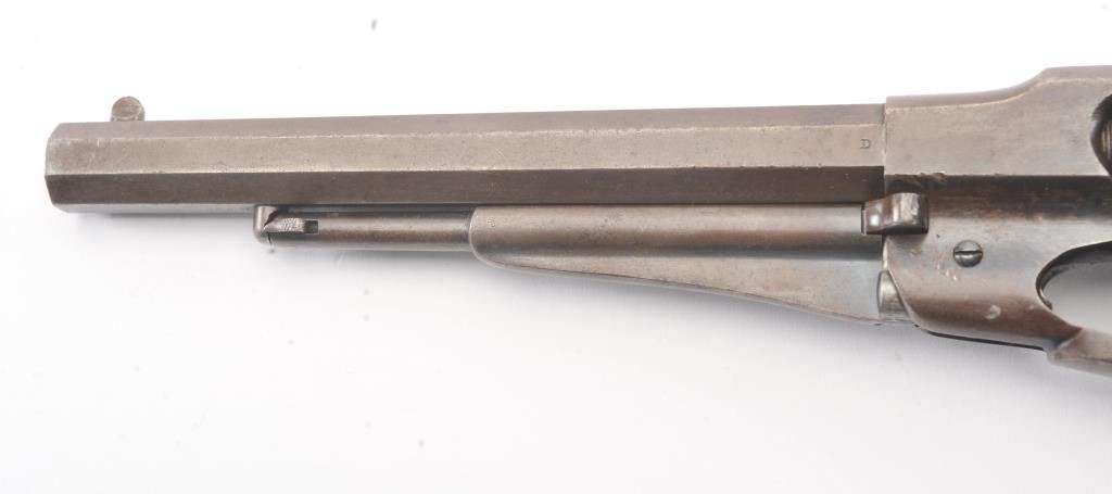 Remington Model 1858 New Model single action Rollin White patent cartridge conversion revolver, .46 cal., 8” octagon barrel, blue finish, brass trigger guard, wood grips, #126281. The barrel address and cylinder show crisp markings. This gun is in overall good condition showing a medium brown patina on metal surfaces with some scattered areas of erosion and pitting, some traces of blue in protected areas of frame and loading lever,good action and overall good bore; the underside of the barrel is stamped “289 S” with “D” and “R” proofs on the barrel, grips are good with small mars and knackering on the butt from hammering nails and “JCS” isstamped on the base of each grip. Est.: $700-$1,400. (Antique).