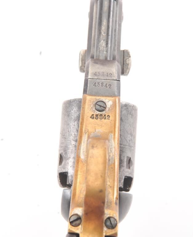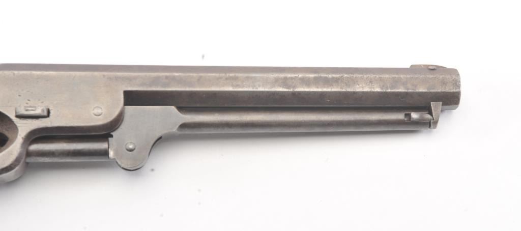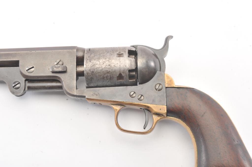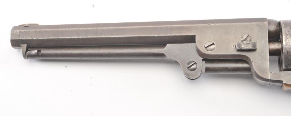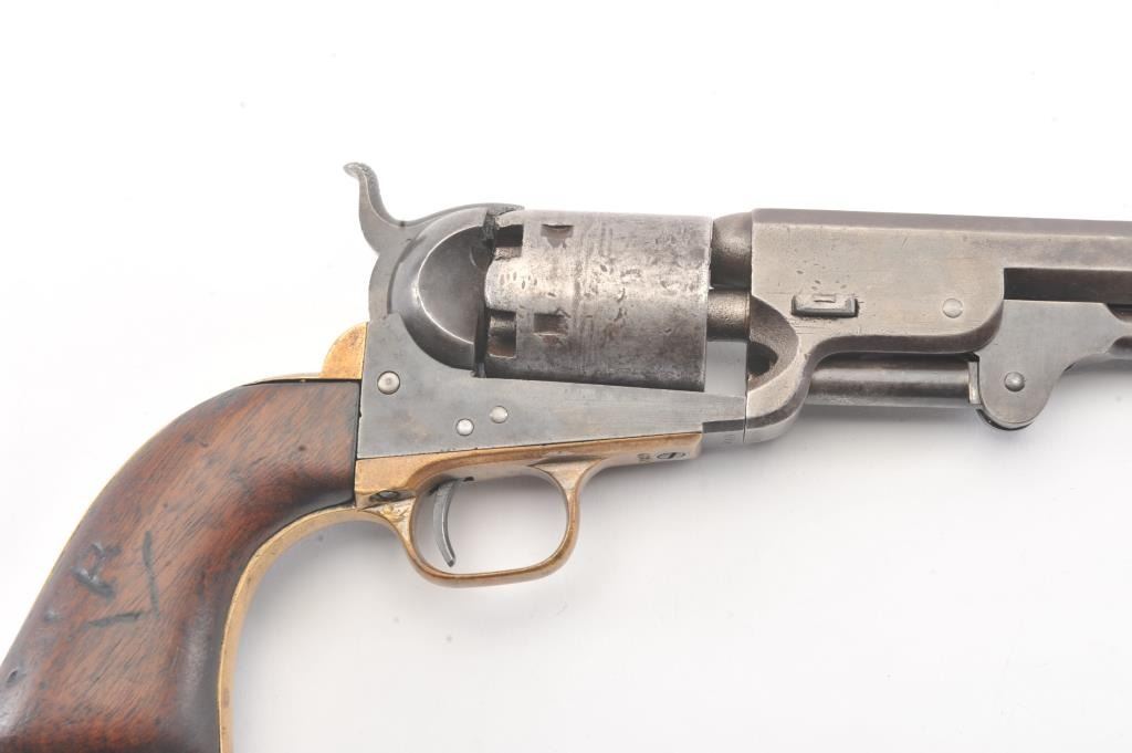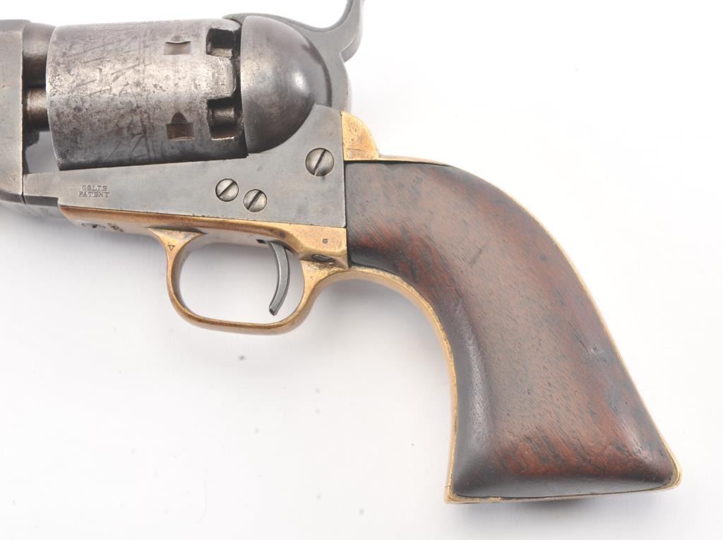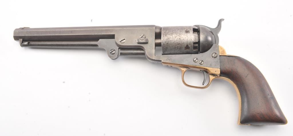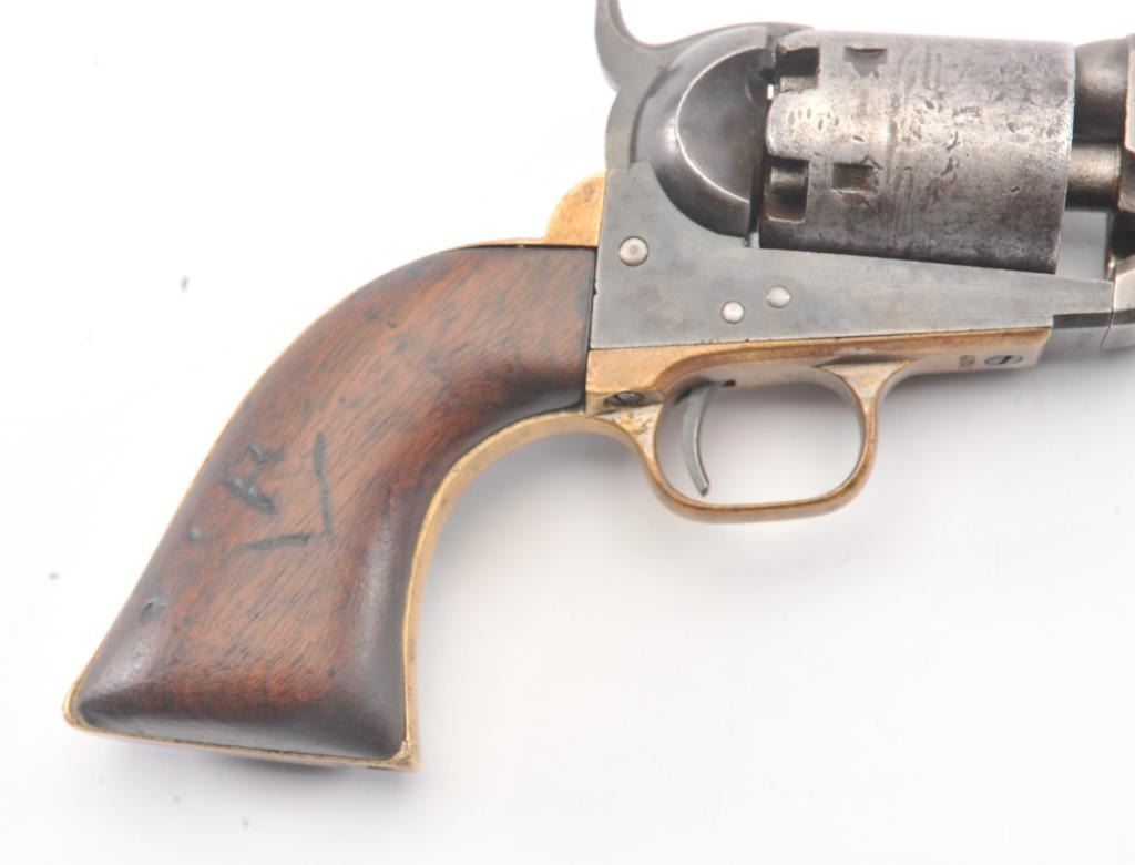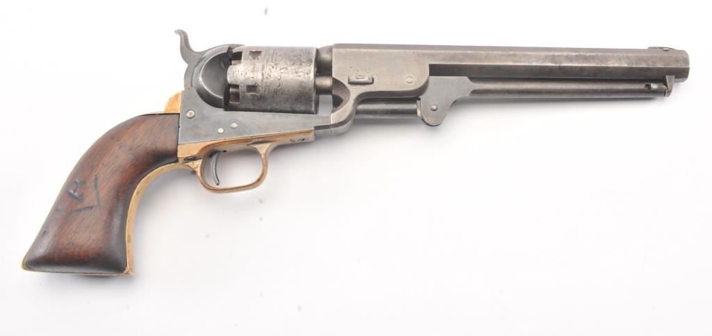 Colt 1851 Navy small guard .36 caliber percussion revolver from the Gold Rush era, Serial #45842. The pistol has a brown patina finish with good markings and 50%-60% cylinder scene. The grips are worn andundersized about good showing markings on the right grip with a P over V, possibly a brand. The pistol has a blade front sight and groove in the hammer. The pistol has matching visible numbers. A 7 on a 1-10scale. Est.: $1000-2000 (Antique).