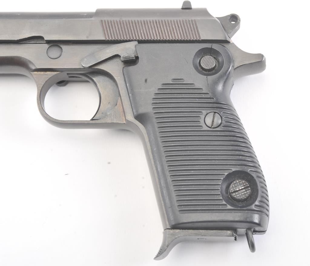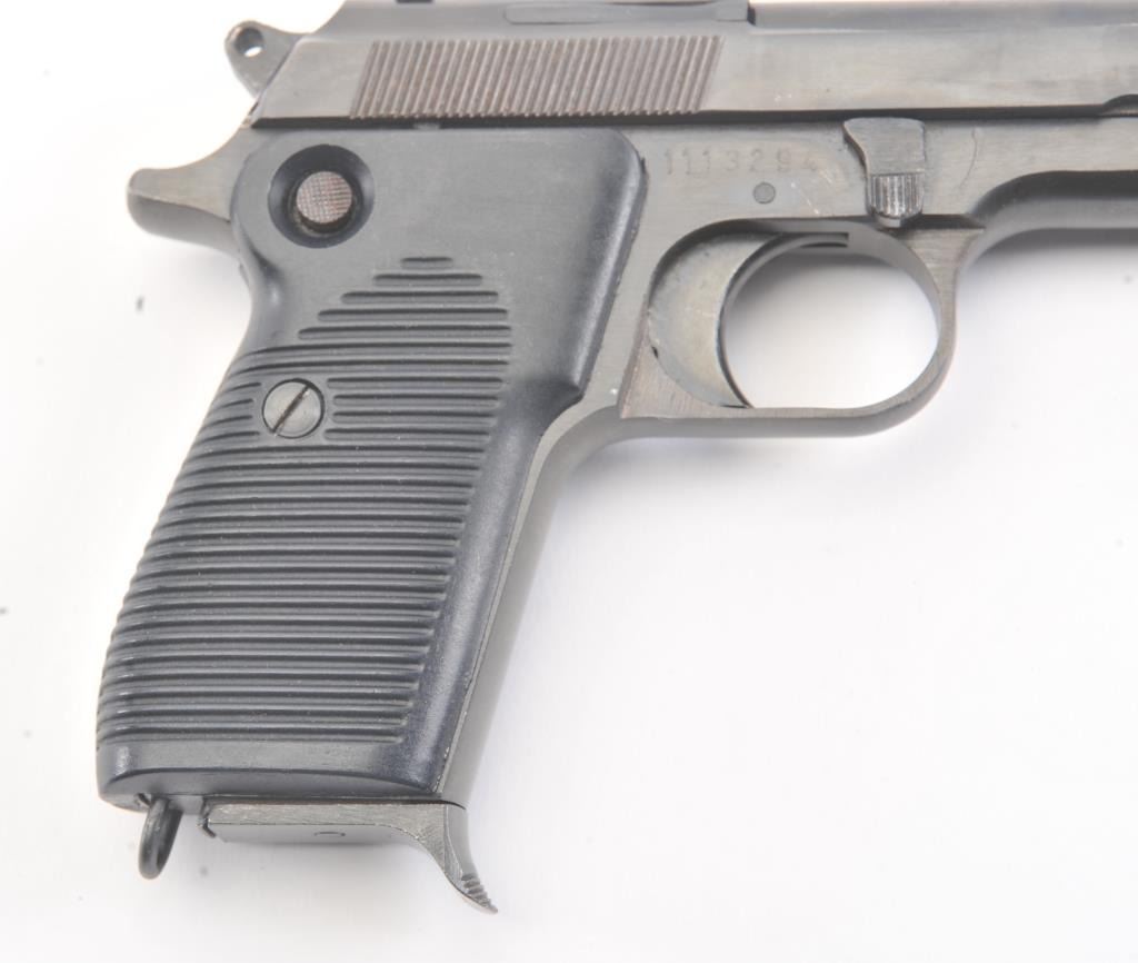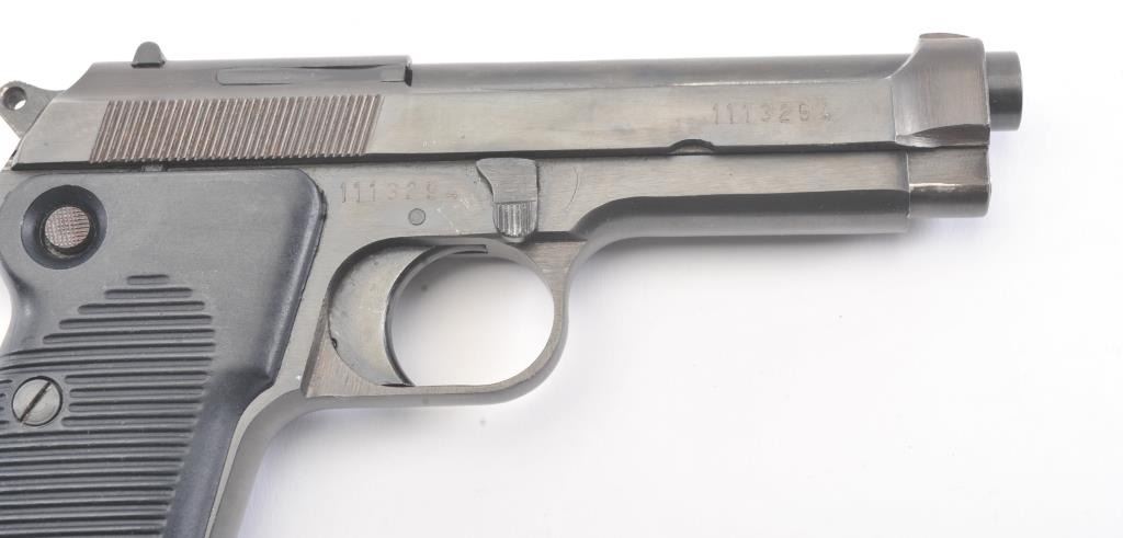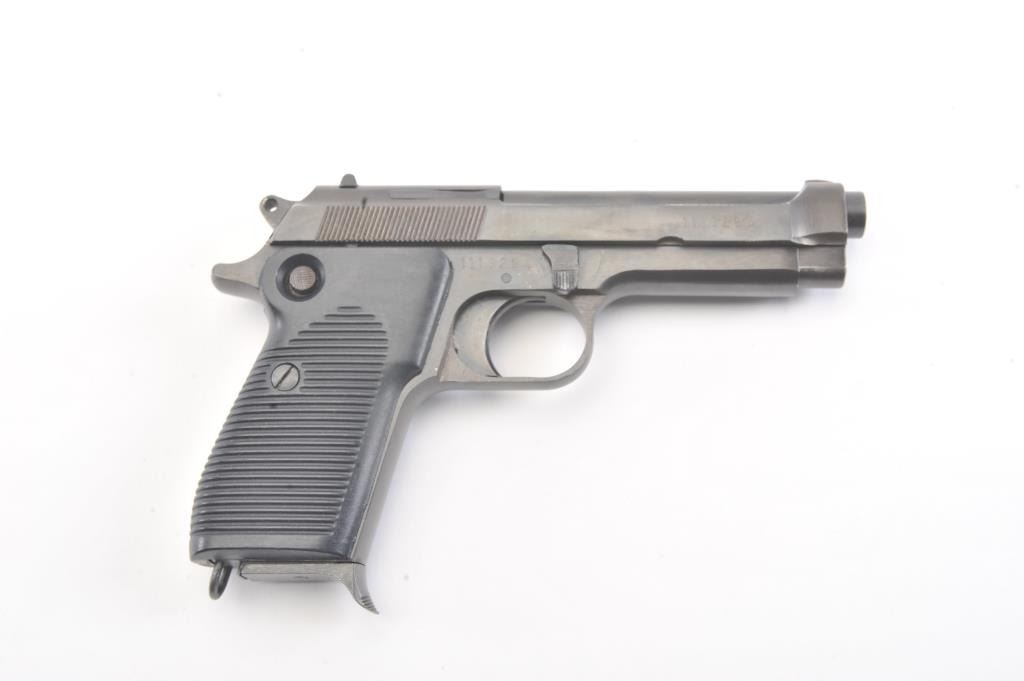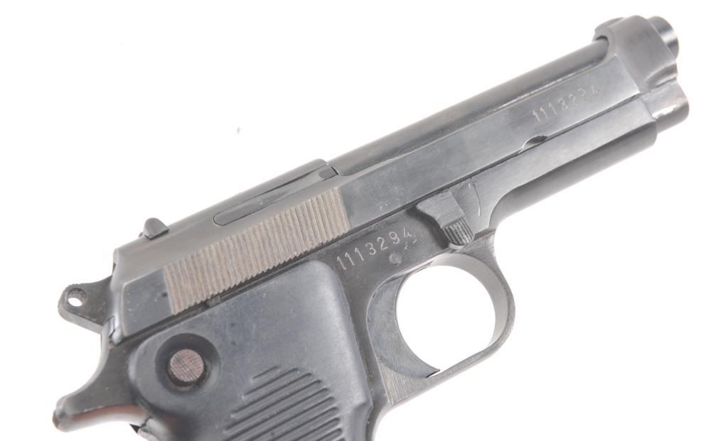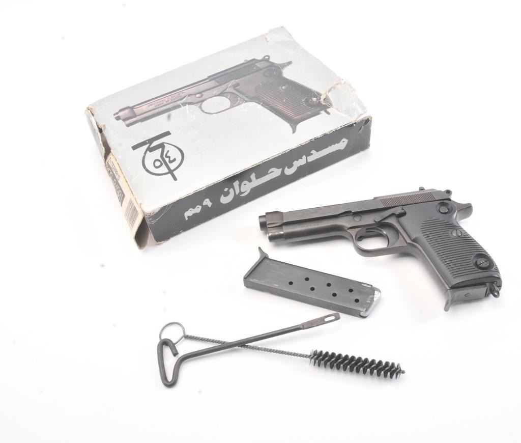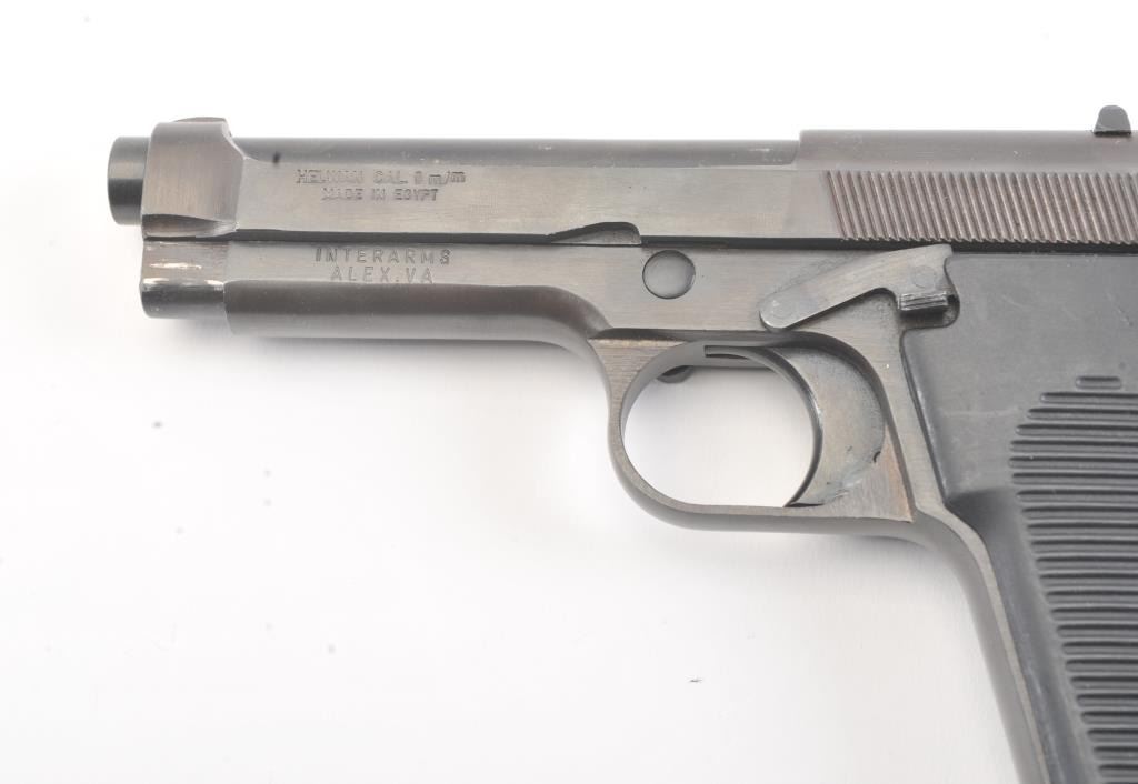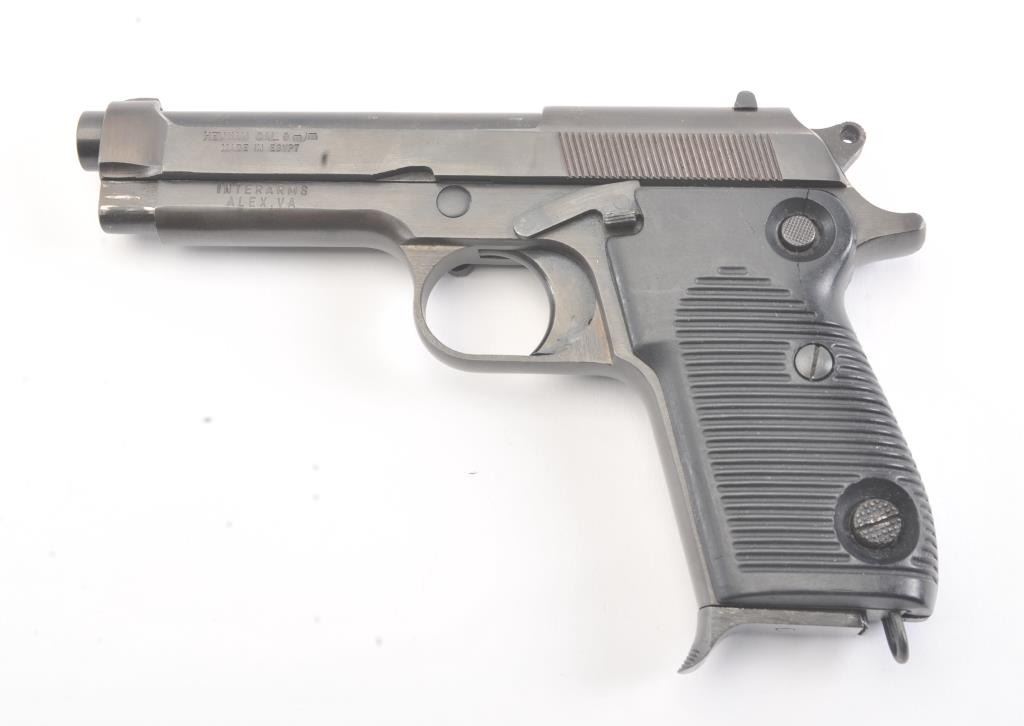 Egyptian Helwan 9mm Luger caliber Semi-Auto pistol patterned after Beretta design. Interarms marked in box. S/N 1113294. Very good plus used condition. 95%-98% finish. (Modern/PPT) Est.: $200-$400