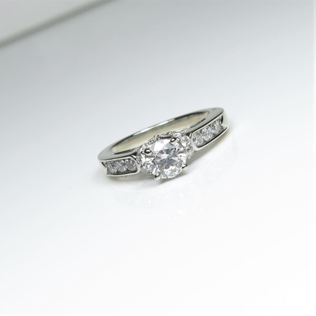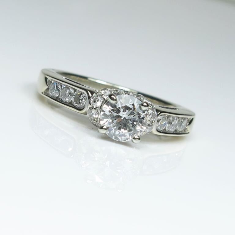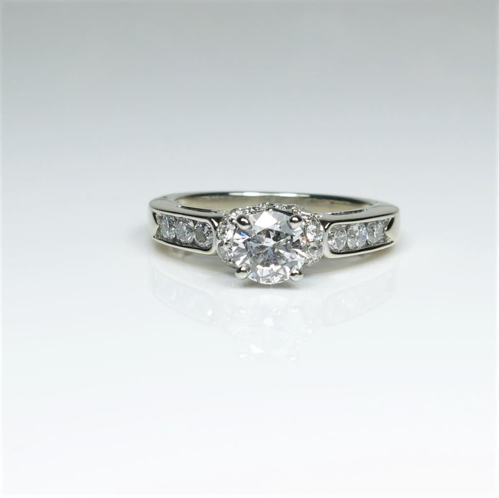 Romantic Cathedral style Diamond Ring featuring an ‘IDEAL’ cut center Diamond weighing approx. 0.60 carats with H-I colors beautifully detailed with 26 round cut Diamonds weighing approx. 1.00 carats withH-I colors and SI clarity set in 14 karat white gold. Retail $3,000-$4,000 Estimates $2,000-$2,500