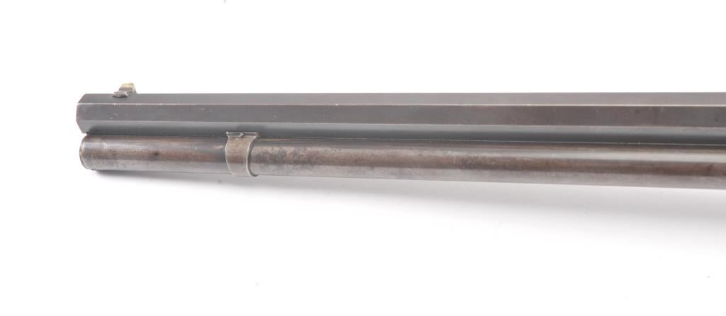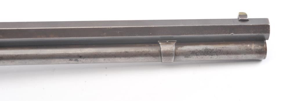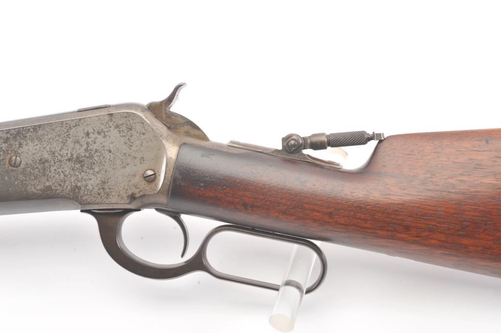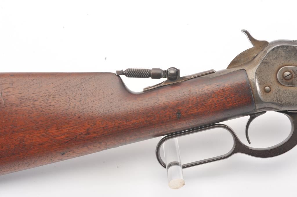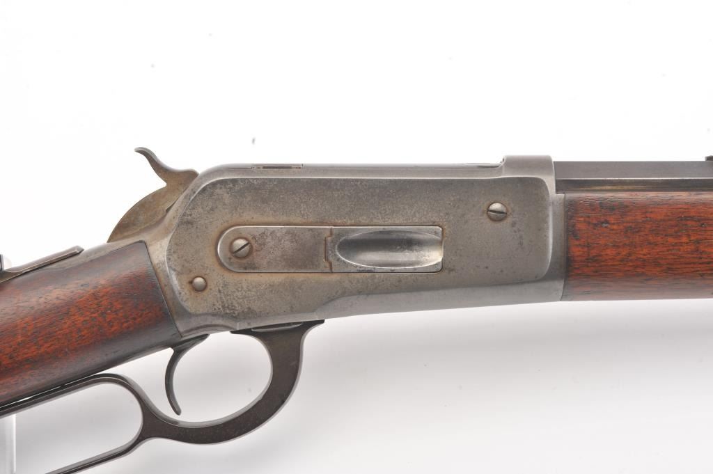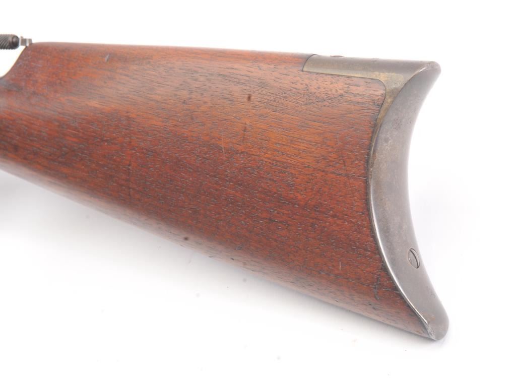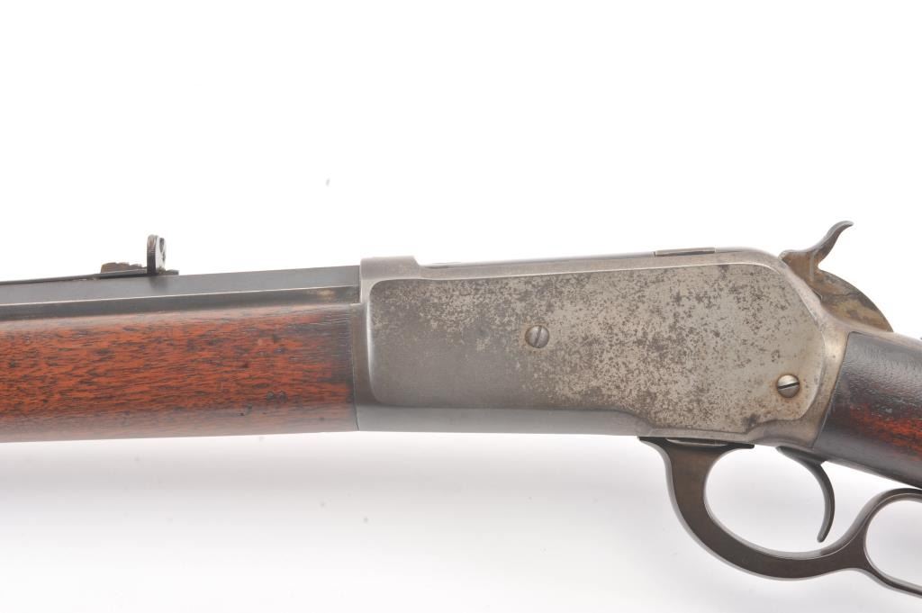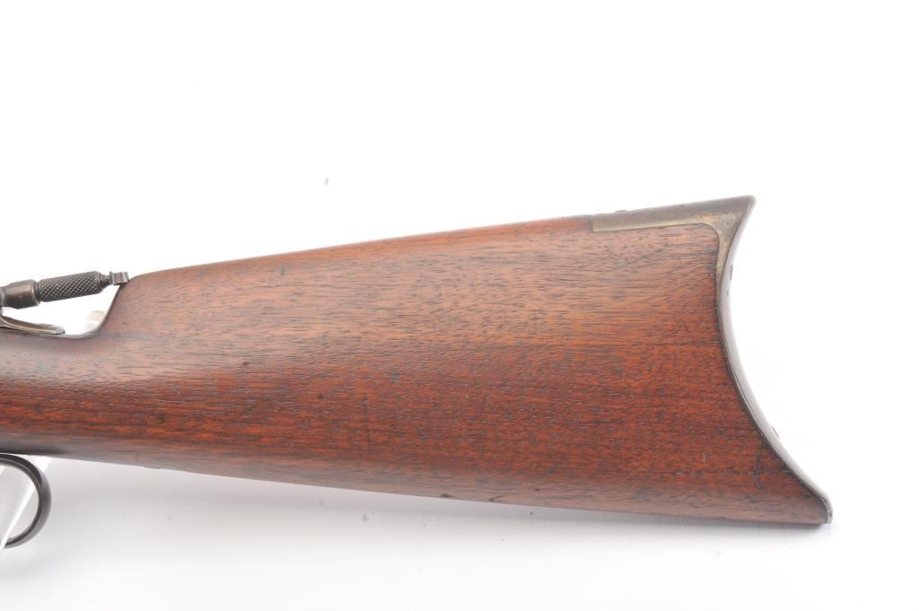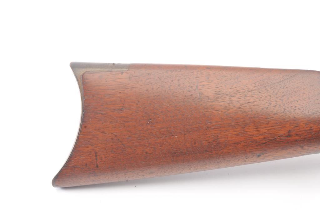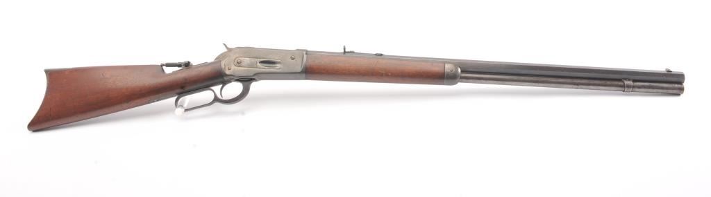 Winchester Model 1886 Lever Action Rifle in .40-82 caliber with 26” octagon barrel, full mag, and rifle butt, S/N 74016. Lyman type unmarked tang sight added. Very good condition with 30%-50% blue and case drifting to natural patina. Minor erosion and light pinprick pitting. Good markings and address. The wood is good to very good with tight wood to metal fit. Blue on the bolt and loading gate. The comb is relieved slightly for“Peep” sight on the tang. Good action and bright bore. A 7.5-8 on a 1-10 scale. (Antique) Est.: $1400-$2800