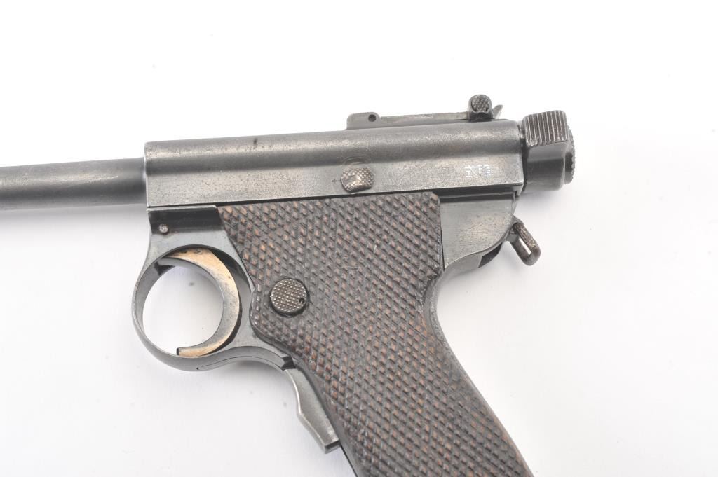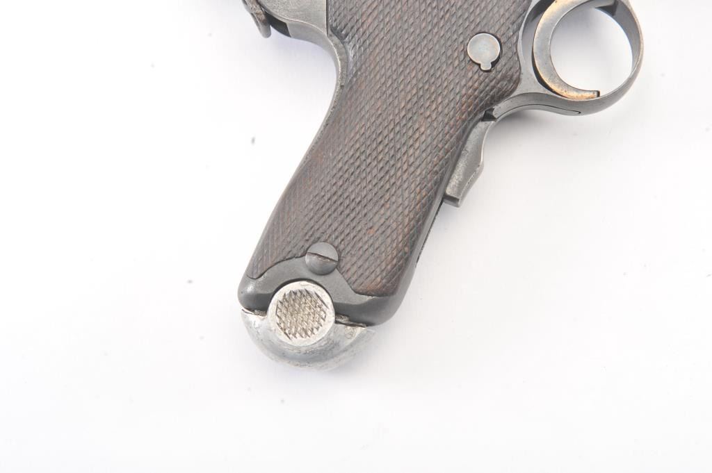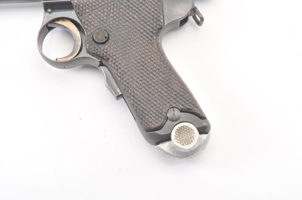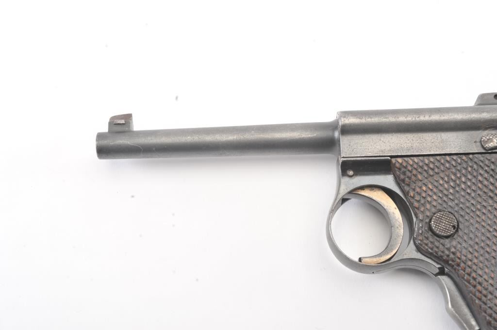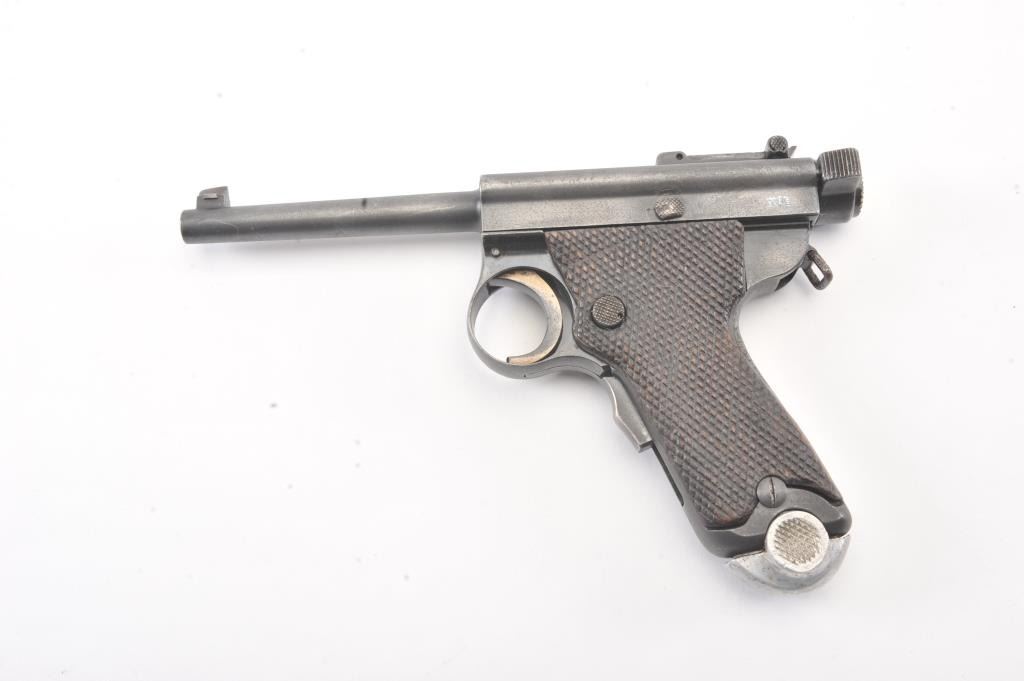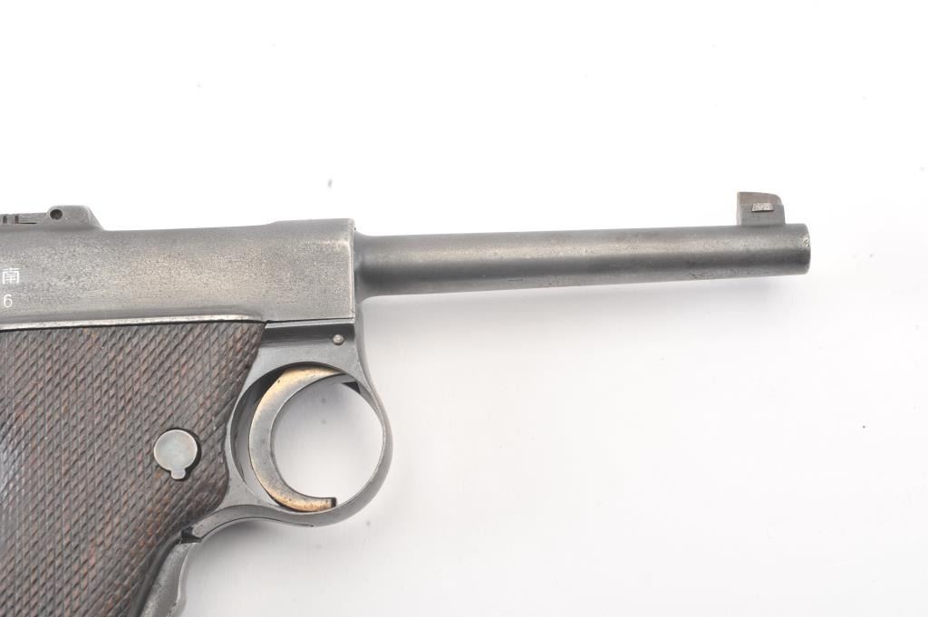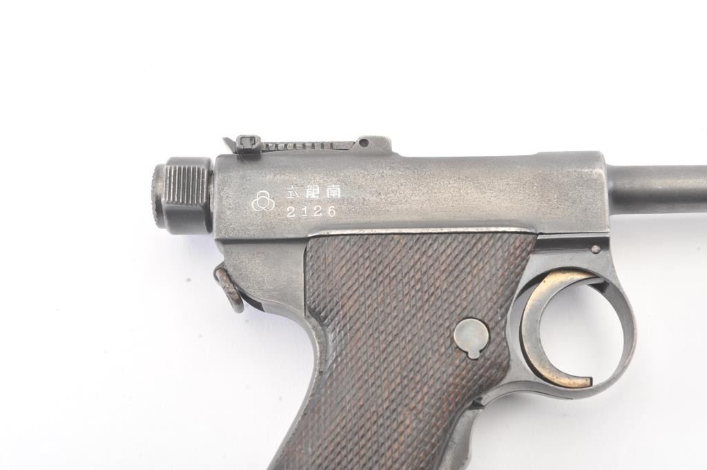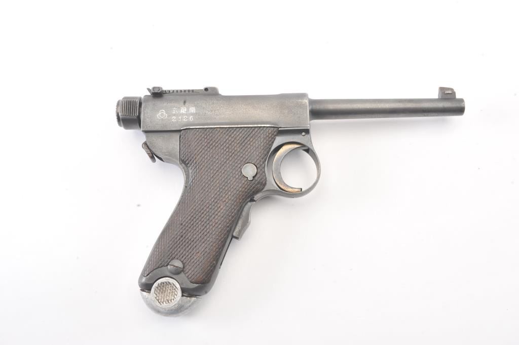 “Papa” Nambu semi-automatic Japanese Military pistol, 8mm, Serial #2126. The pistol shows a Tokyo Gas & Electric (TGE) marking on the breech with grey to blue finish showing minor pitting and erosion with good markings. The grips show some wear and old refinishing to the checkering, a non-matching but correct magazine and a good action and interior. Est.: $1,500-$3,000. (C+R/PPT).