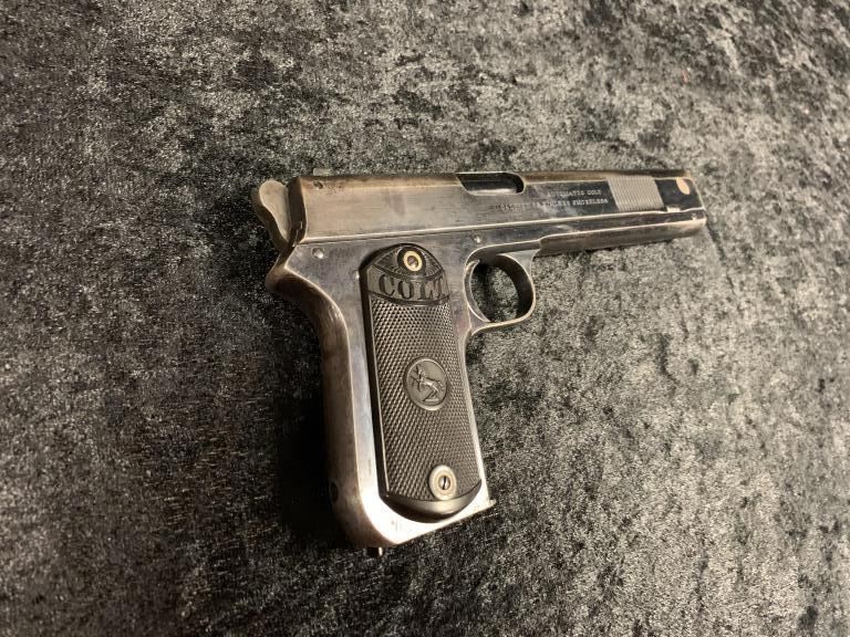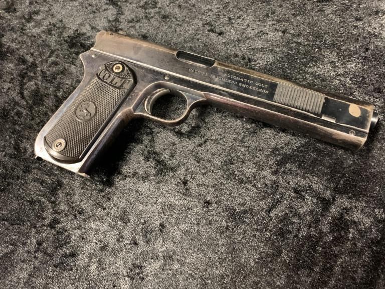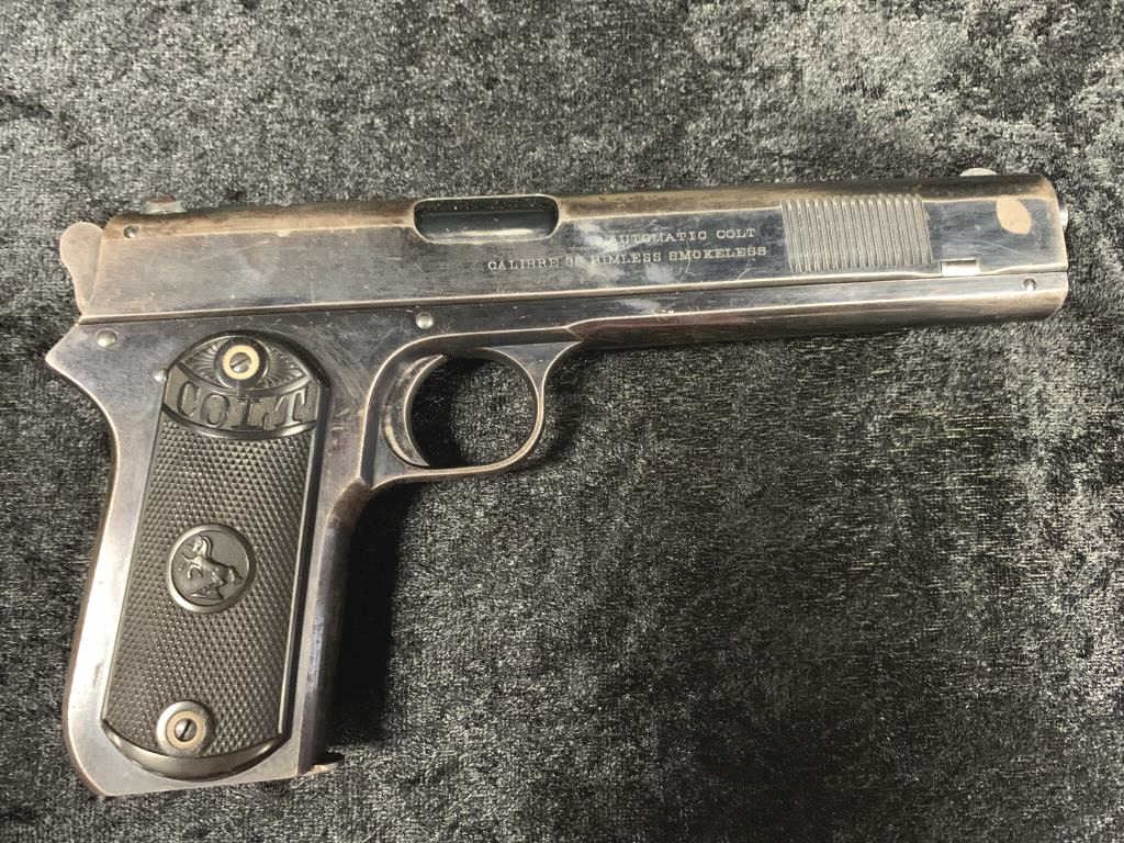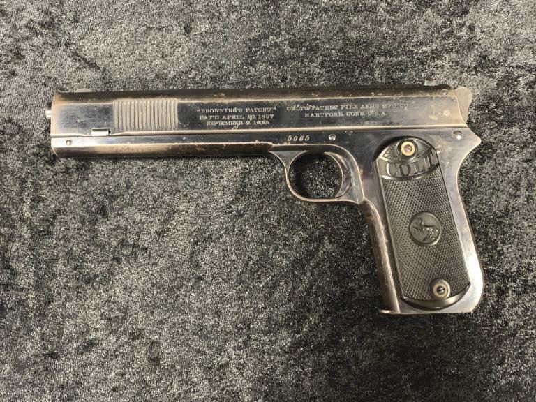 Colt 1902 Sporting Model semi-automatic pistol, .380 ACP caliber, Serial #5065. The pistol is in very good overall condition with 75%-85% of the original blue showing some losses and normal aging. The grips are verygood plus, sharp markings, with a nickel plated and patent marked correct magazine with an excellent interior and bore. The hammer retains nearly all of the case color, minor scattered erosion and pin prickpitting. An 8 on a 1-10 scale. Est.: $1,400-$2,800. (C+R/PPT).