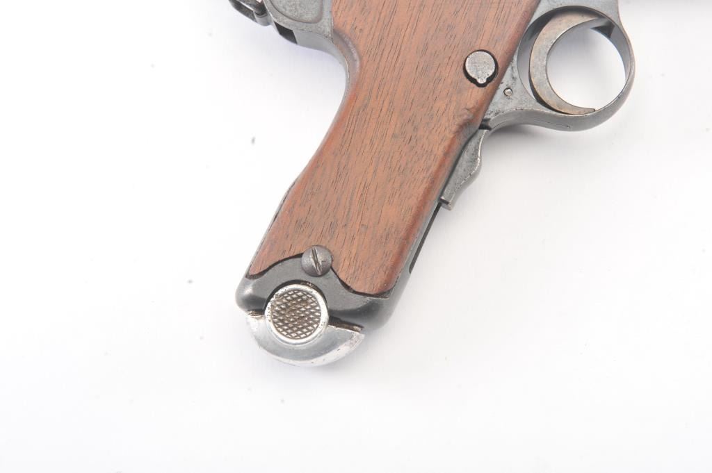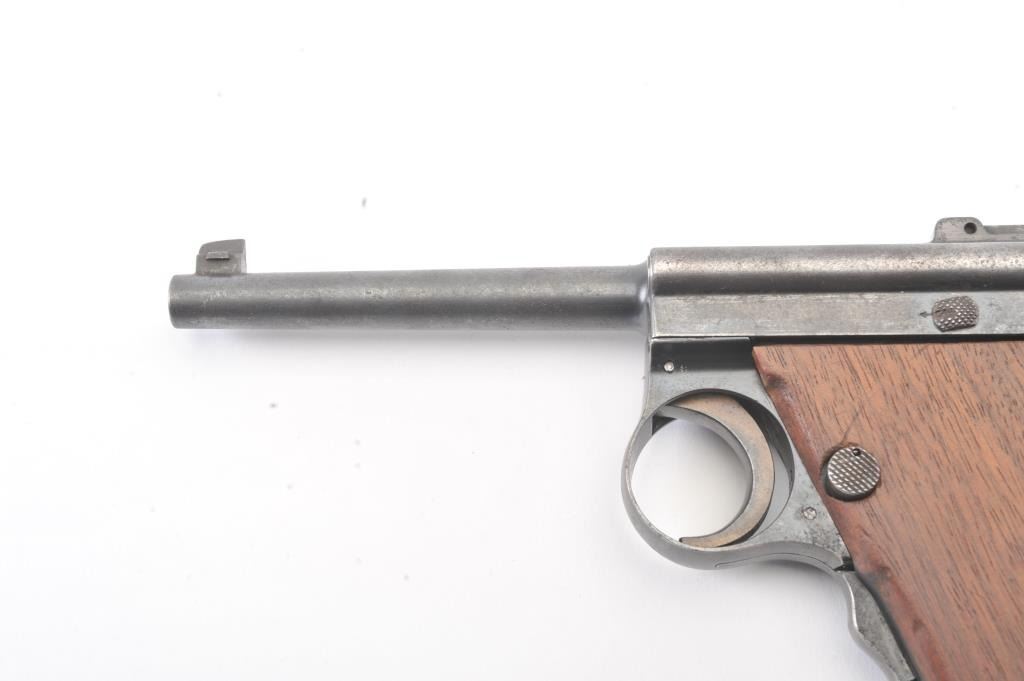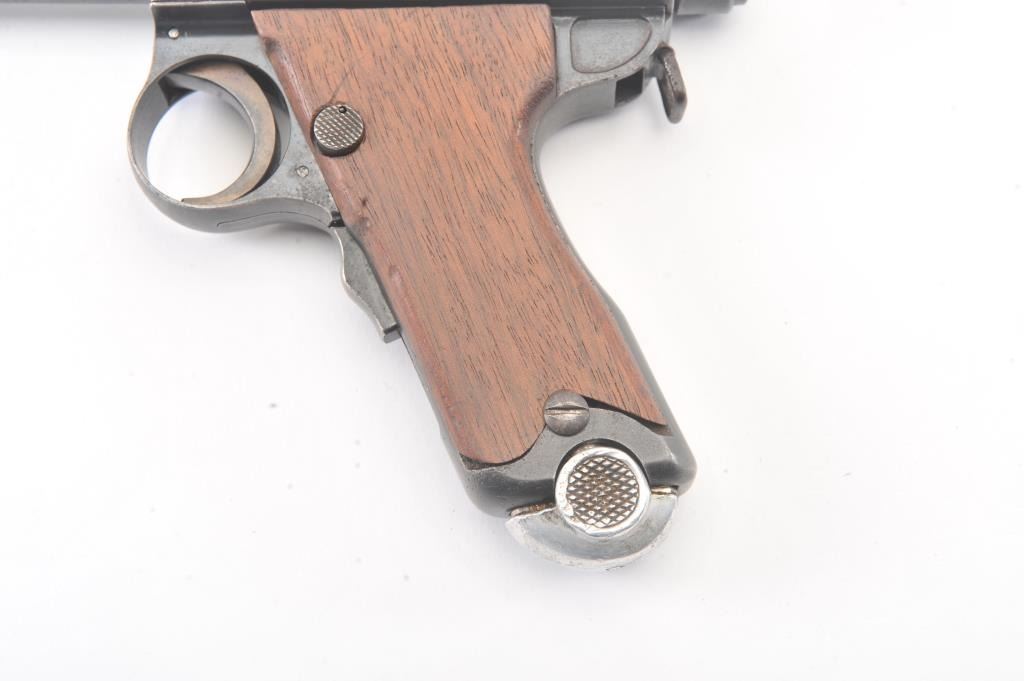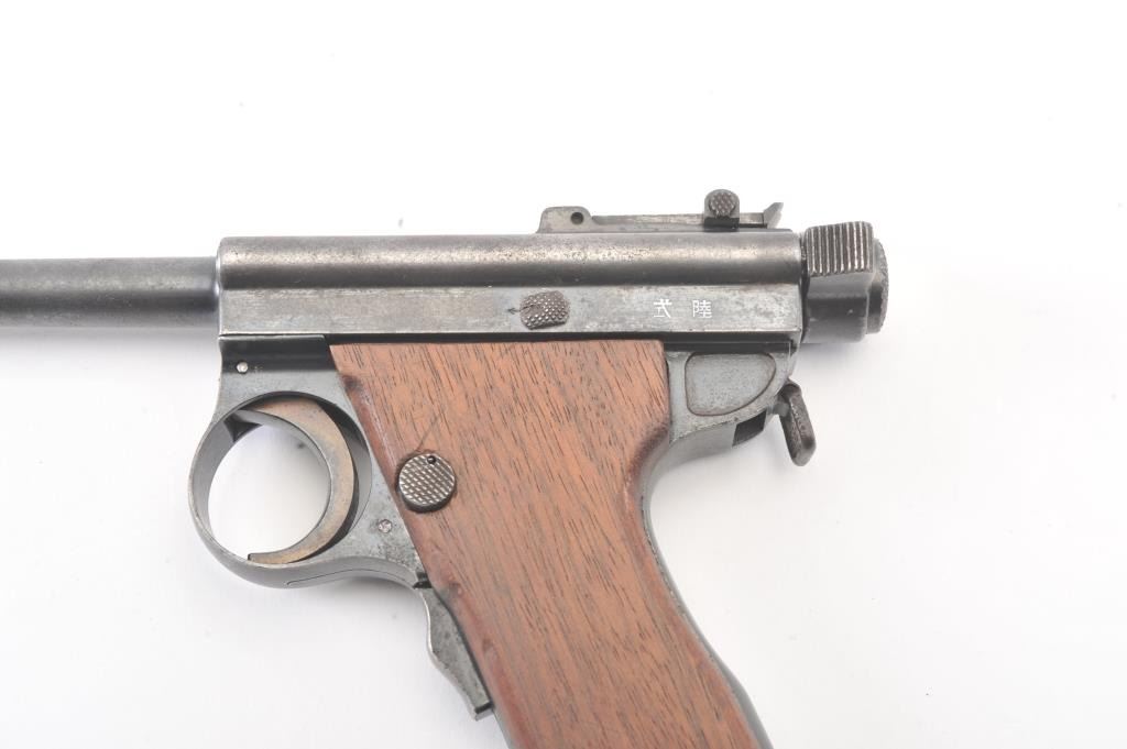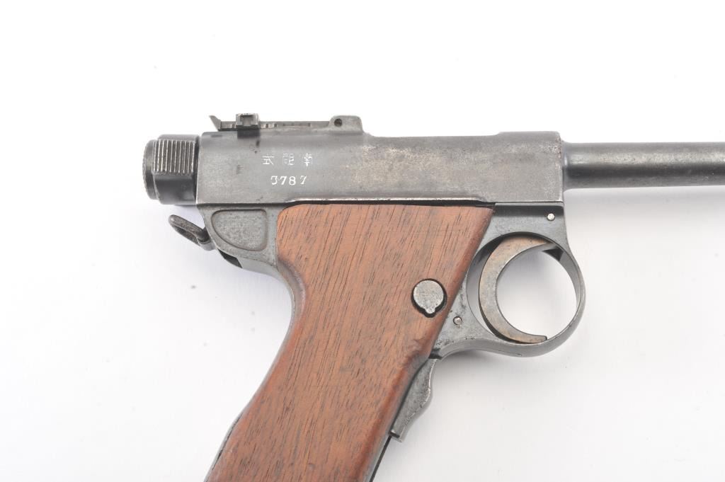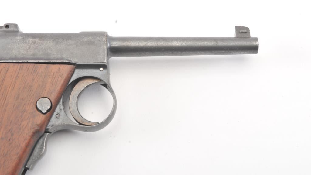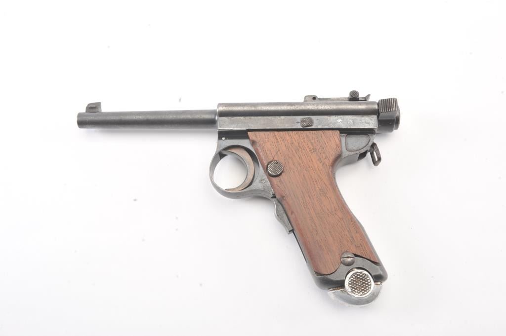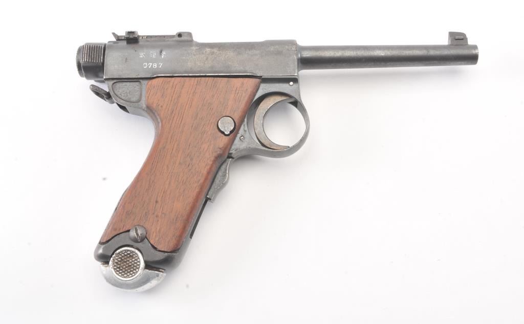 “Papa” Nambu Japanese semi-automatic Military Issue pistol, 8mm, Serial #3787. The pistol retains 50%-70% toning blue finish with minor pitting and erosion. The smooth wood grips are old replacements. The pistol shows a three-ring arsenal marking on the breech, with the correct clip (not matching), good action and fair bore. Est.: $1500-3000. (C+R/PPT).