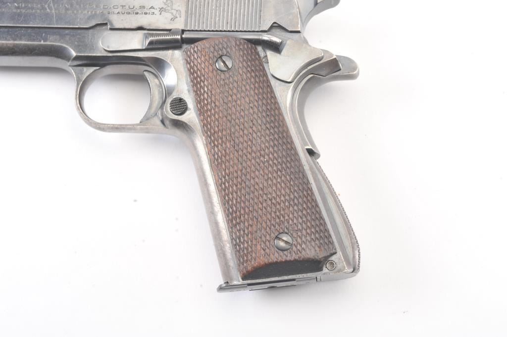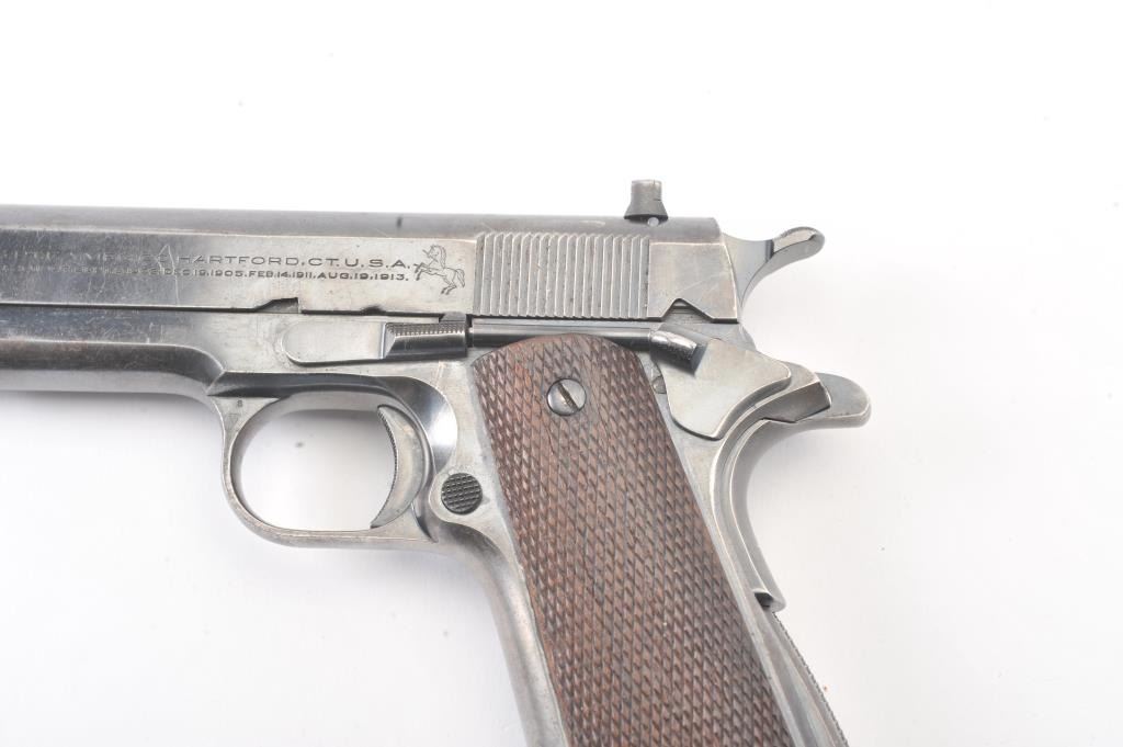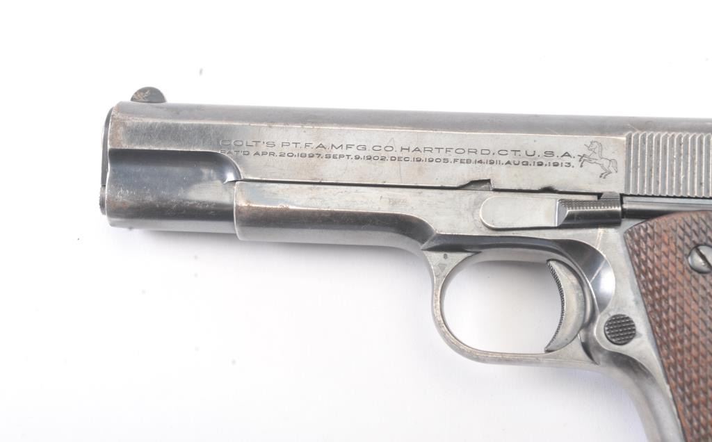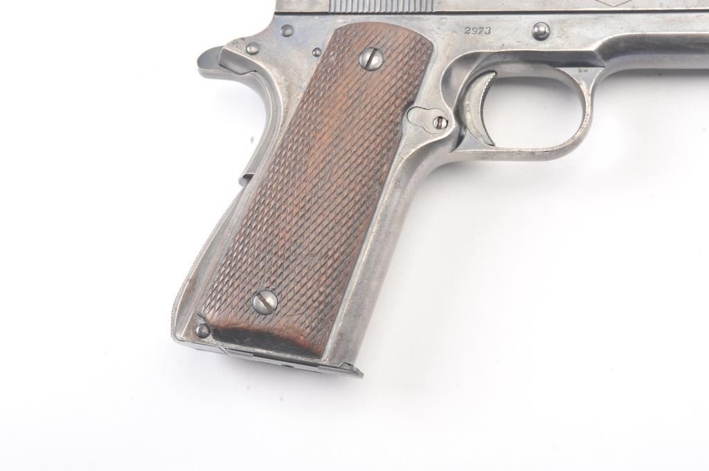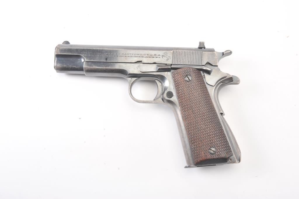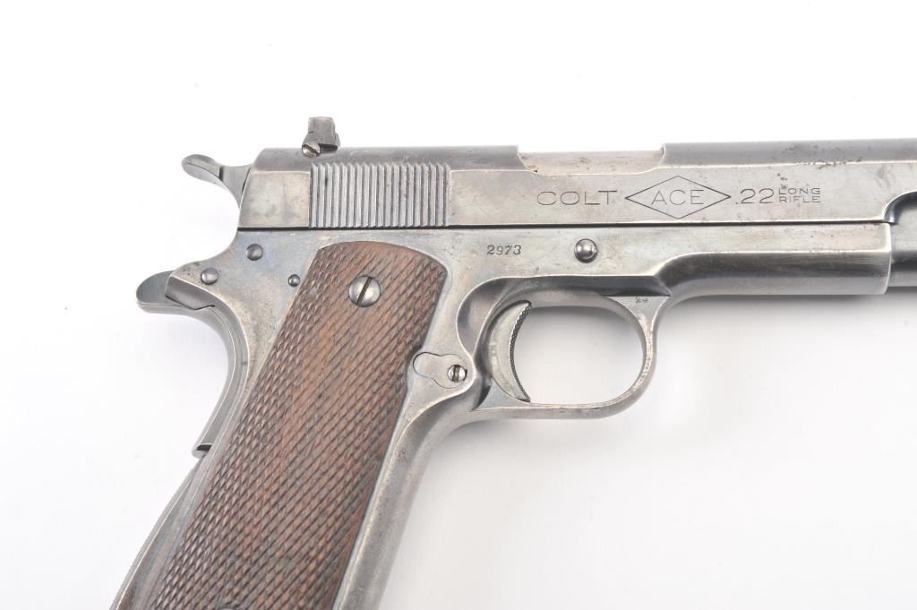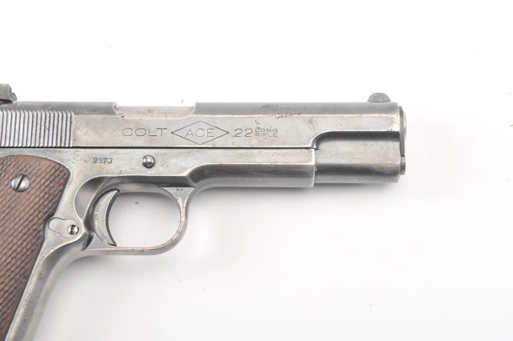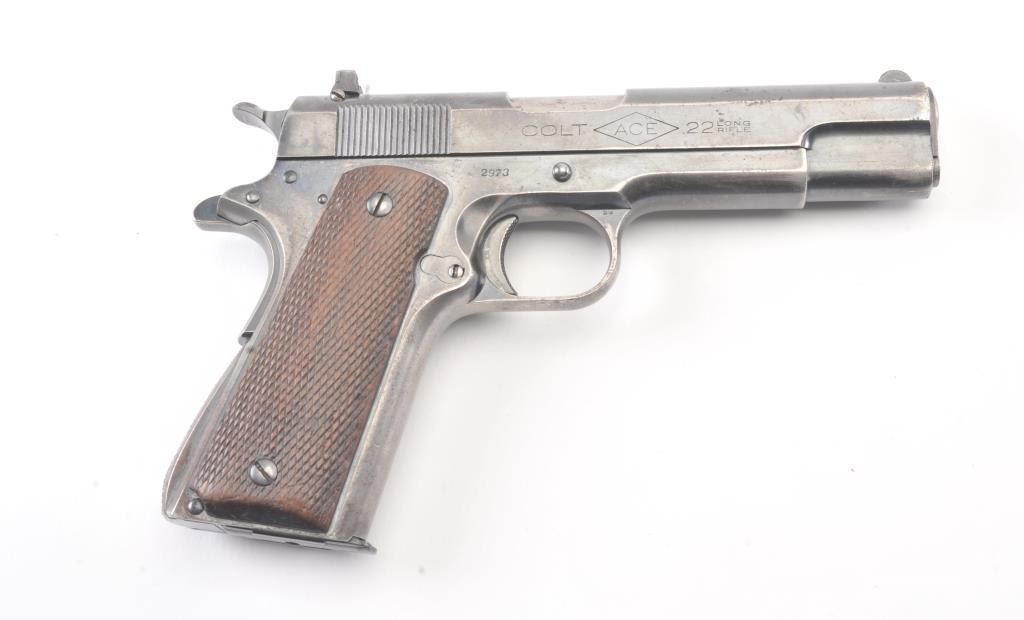 Colt “Ace” pre-war semi-automatic pistol, .22 caliber, Serial #2973, fixed sights with 80% plus original blue drifting at the edges and high points. The pistol shows minor erosion and pin prick pitting just beginning withgood markings and a post-war magazine. The grips show minor wear and rate about good. The action is good, bore is good and may clean to very good. Est.: $1400-2800. (C+R/PPT).