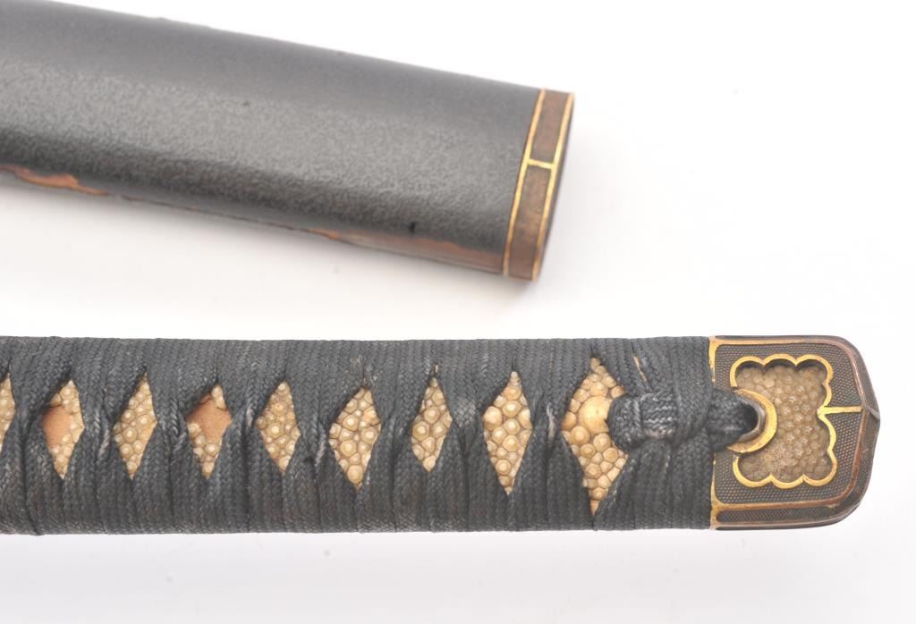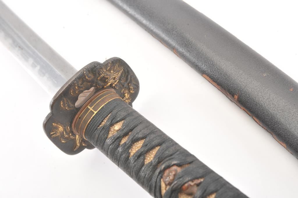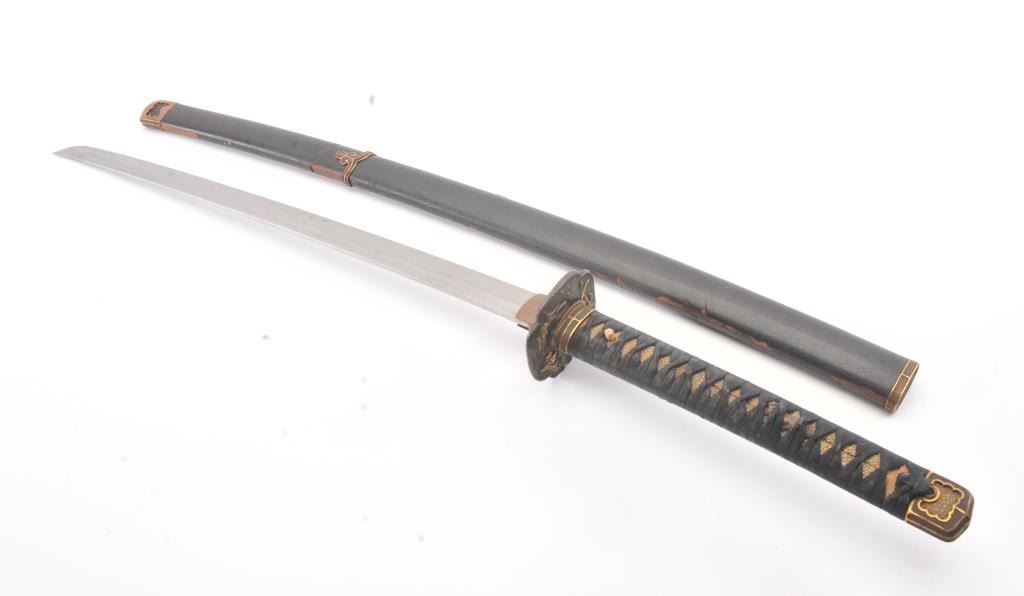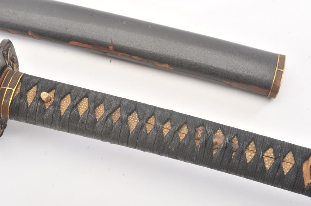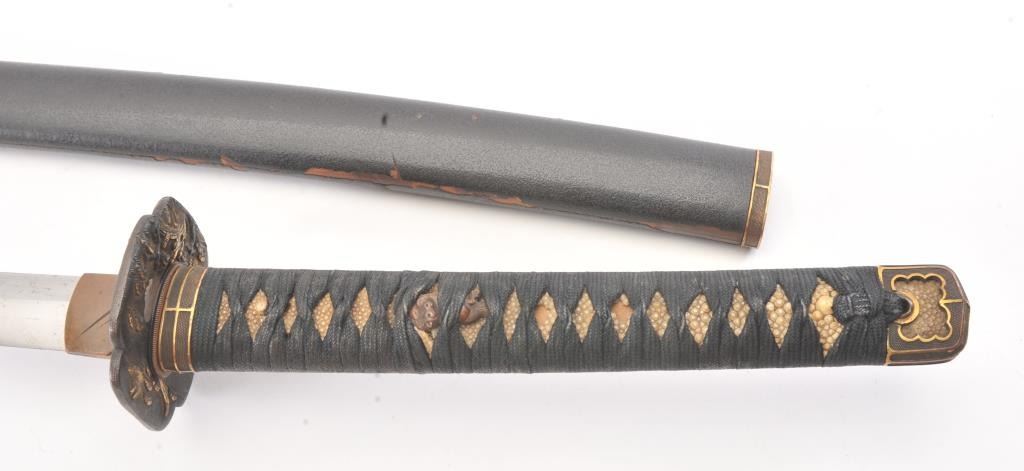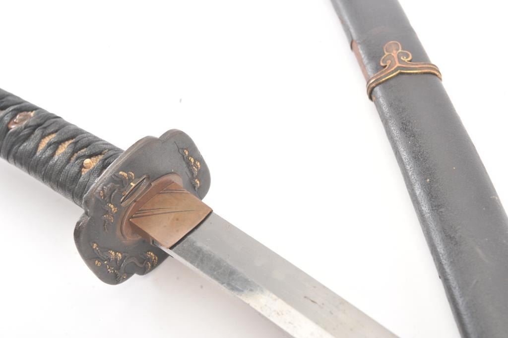 Japanese Samurai sword in traditional and fancy mounts with signed old blade, approximately 400 years old. The 20 ½” (Ko-Wakasashi) blade was longer and shortened during the period of use, probably from along sword. The blade shows improper cleaning with most of the temper visible. The gold inlaid high quality matching mounts show copper and gold with breaks in the lacquer on the scabbard. Est.: $1250-2500