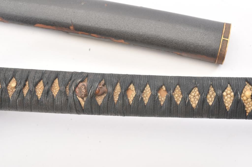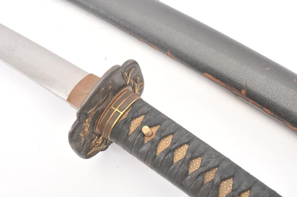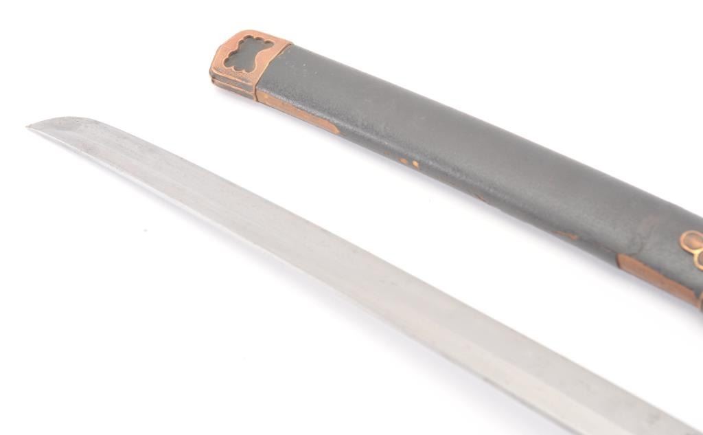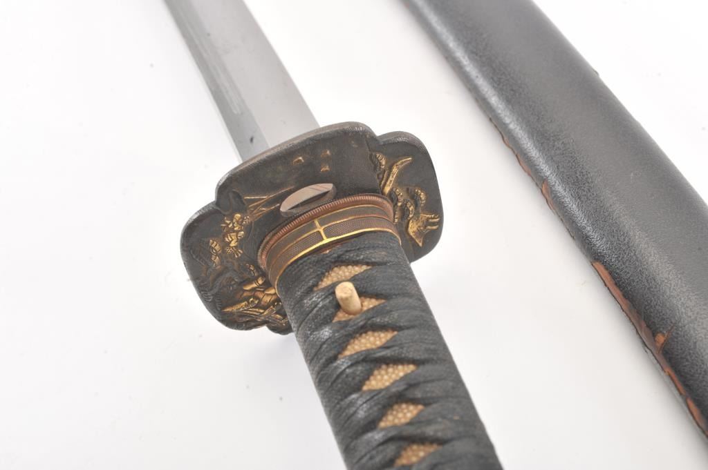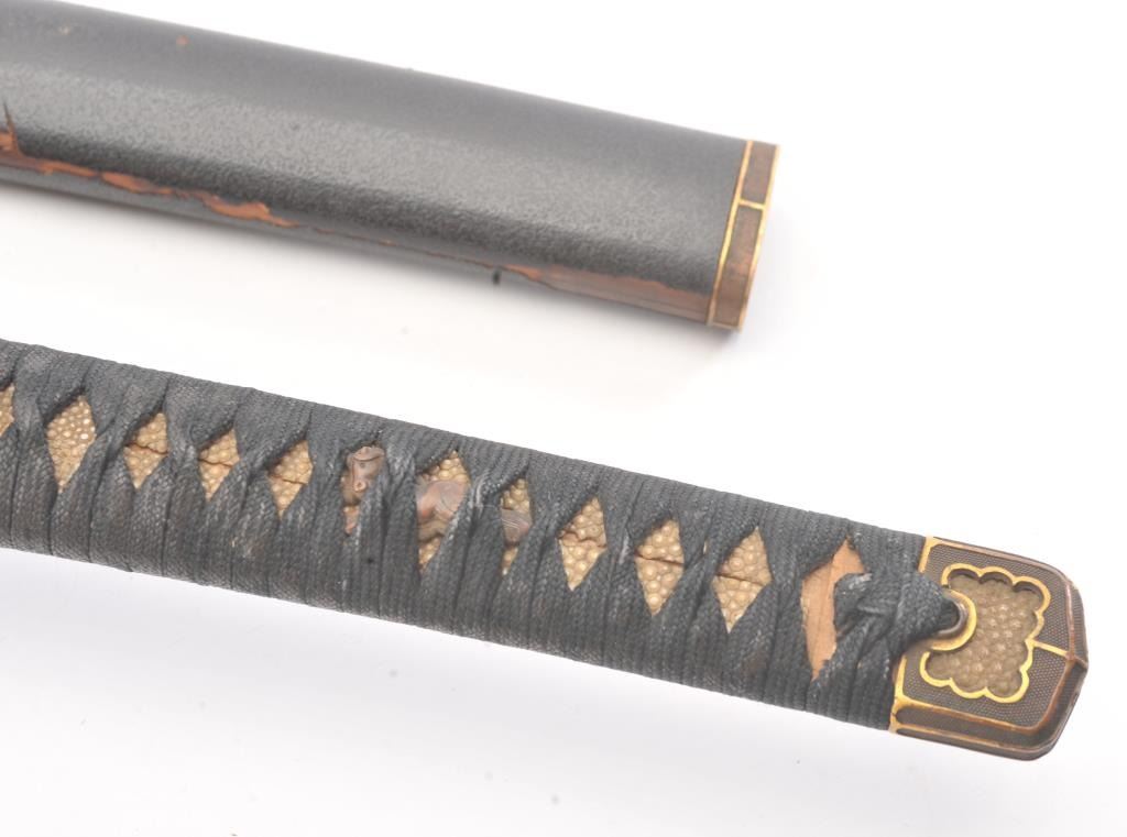 Japanese Samurai sword in traditional and fancy mounts with signed old blade, approximately 400 years old. The 20 ½” (Ko-Wakasashi) blade was longer and shortened during the period of use, probably from along sword. The blade shows improper cleaning with most of the temper visible. The gold inlaid high quality matching mounts show copper and gold with breaks in the lacquer on the scabbard. Est.: $1250-2500