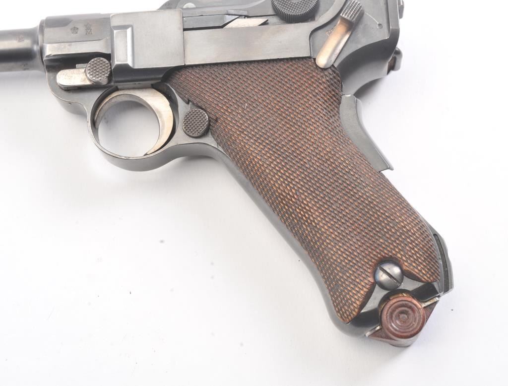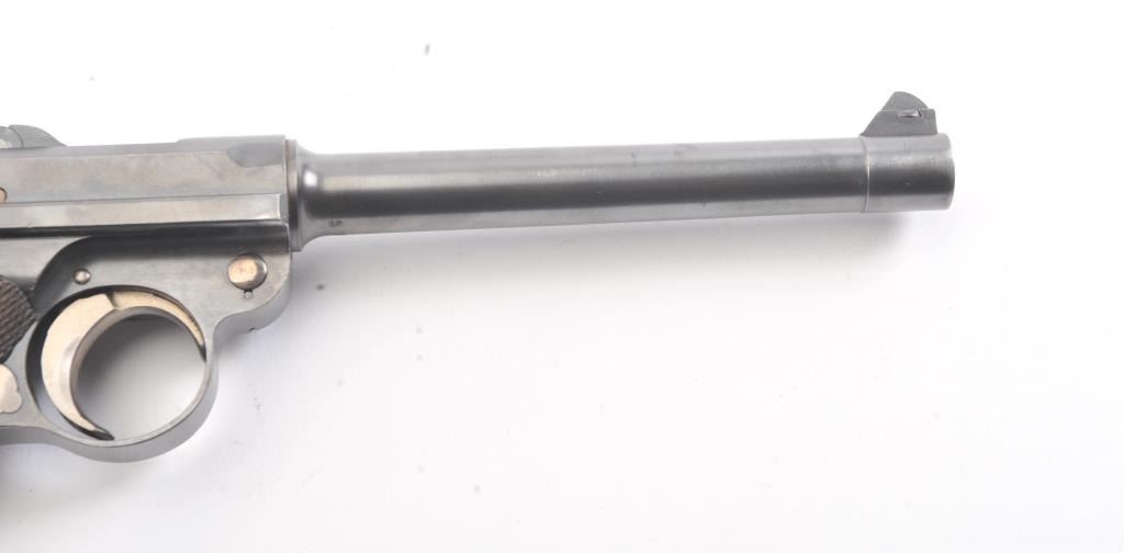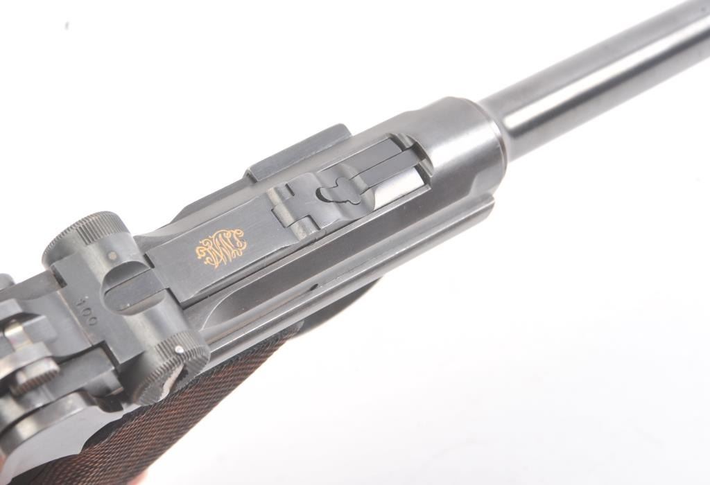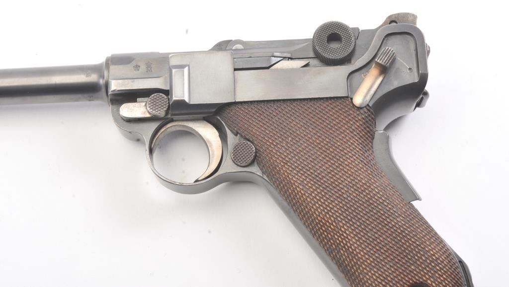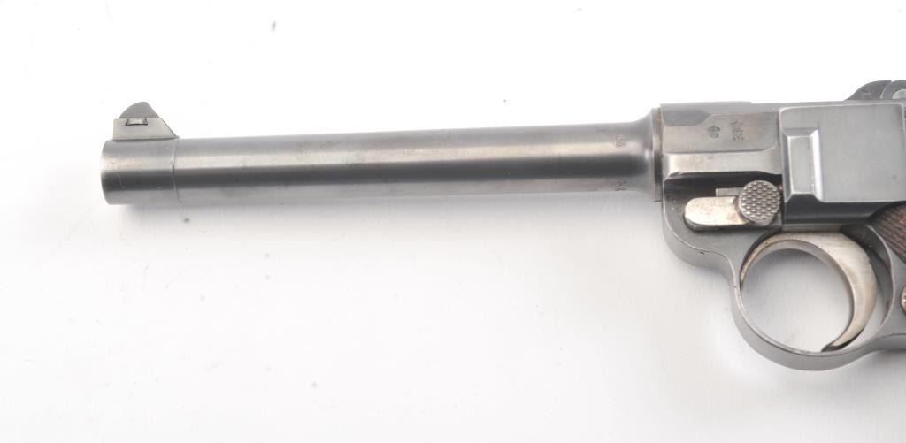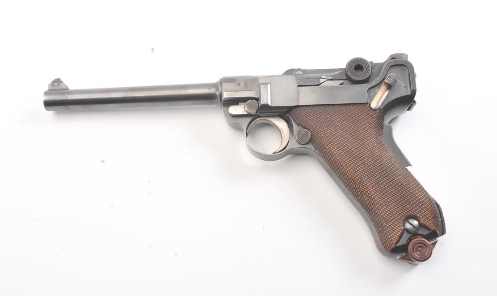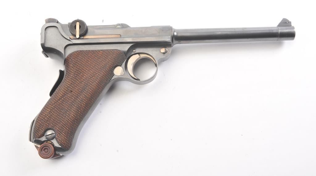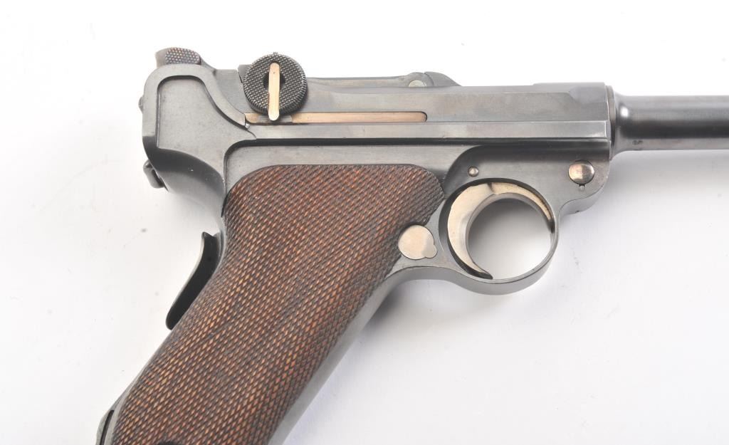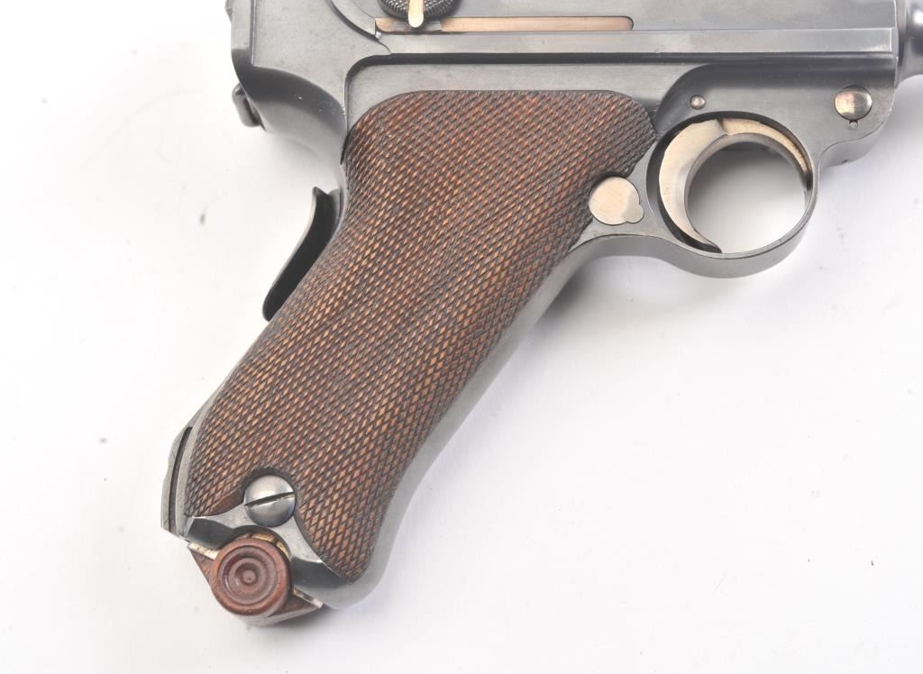 Model 1904 Navy Luger pistol, 9mm with safety marking in upper position and WW 127 marking on the back strap, Serial #574. The pistol is in fine to nearly excellent condition with 95% plus original blue thinning at the leftmuzzle and high points. The lot includes the matching, correct magazine. The grips are very good to near fine. The pistol has all matching visible serial numbers with correct markings. The pistol has a pristine andbright interior with a shiny bore. A strong 9 on a scale of 1-10. Note: This 1904 Navy Luger was professionally restored back to its original configuration by a master gunsmith.Est.: $1750-3500 (C+R).