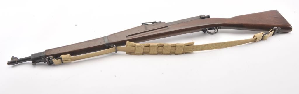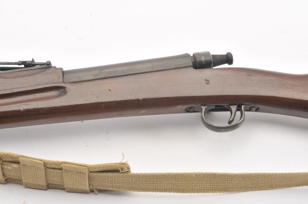 1903 Training rifle with sling marked "Dummy Training Rifle Mk I - U.S.N. Parris-Dunn Corp Clarinda Iowa" on the butt, with canvas case. Case is personalized "To my friend Mr Walter Ehlers. Thank you for your serviceand your friendship. I am proud to call you my friend. SFC Israel Hill (with signature) 2-1-2011. Ehlers was a Congressional Medal of Honor winner with a letter of provenance from the estate seller of his home andeffects. The rifle is in good condition with a canvas sling, functioning bolt, blued finish, sights, and metal butt plate. The US issue M-1950 Parachutists canvas drop bag is in very good condition overall, with a small 1" tear in the top flap. Est. $250-500