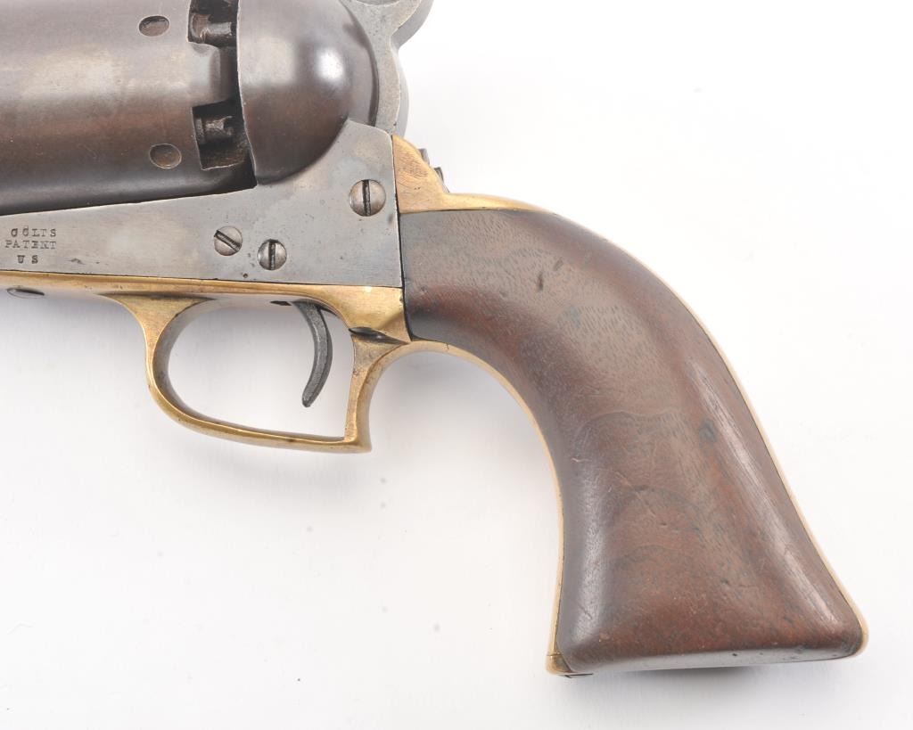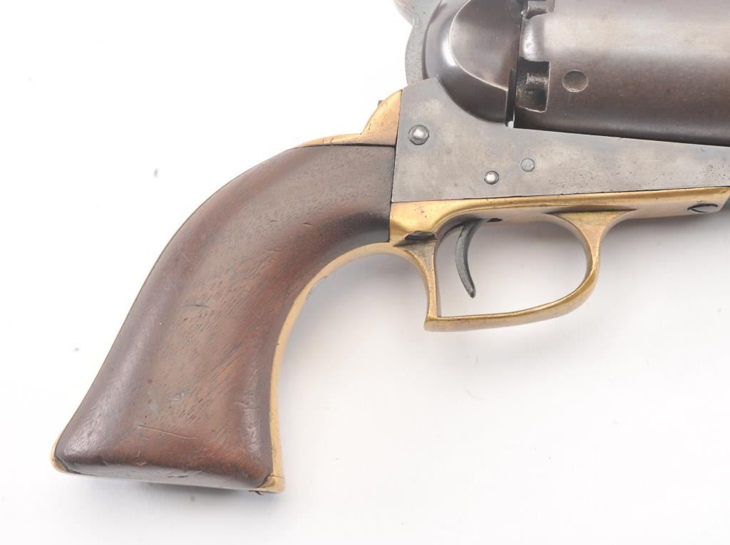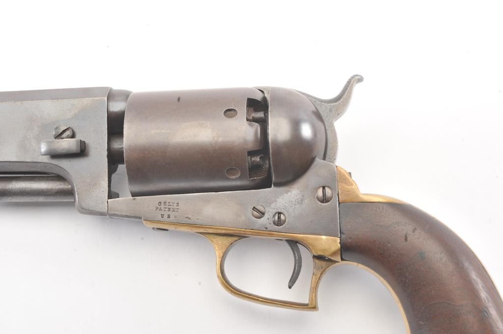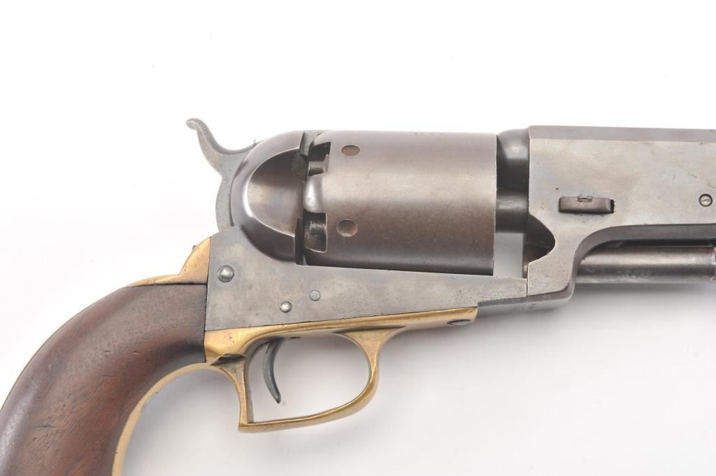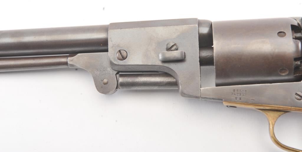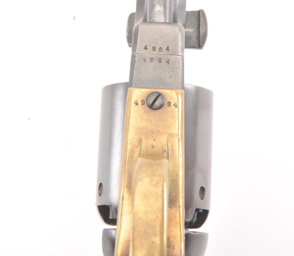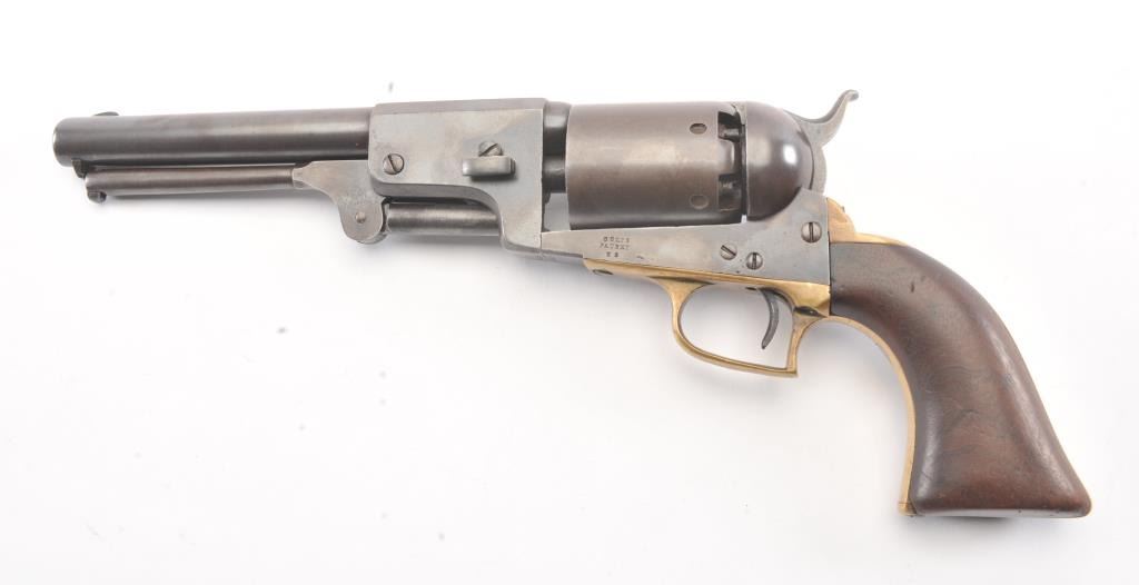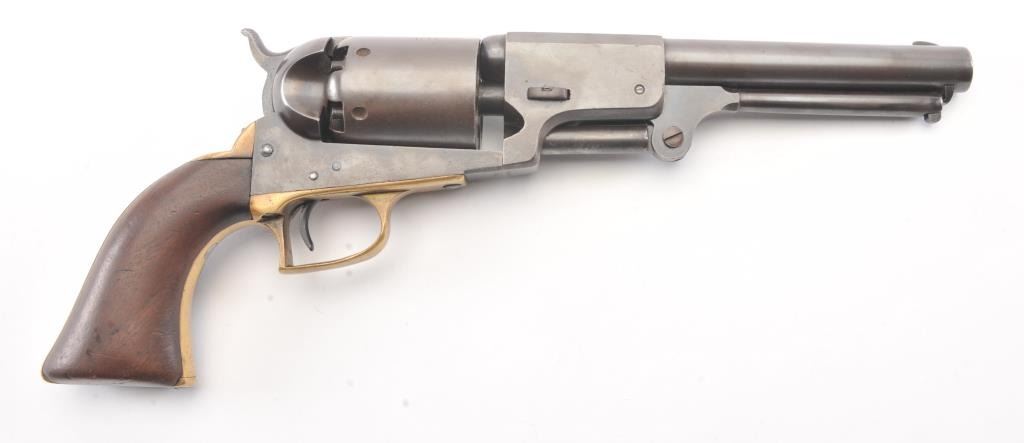 Colt 1st Model Dragoon percussion revolver, .44 caliber, Serial #4984 with U.S. marking and traces of cartouches on the grips. The pistol has had some light cleaning and coloring with the cylinder number refreshed. A very presentable 1st Model Martial dragoon that has a great appearance. Est.: $3000-6000 (Antique).