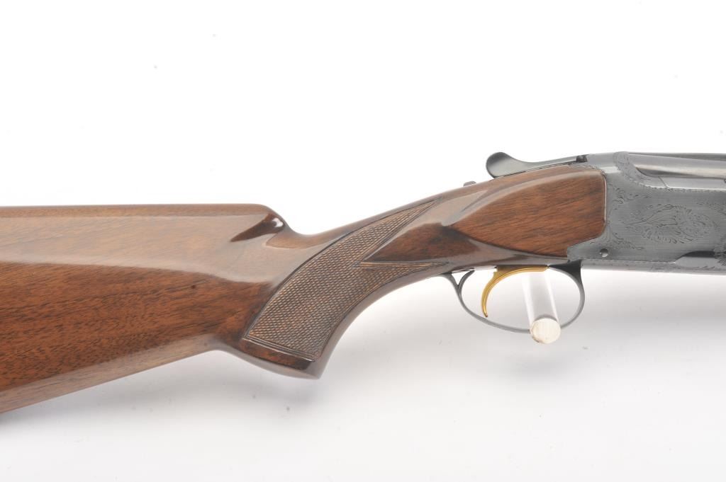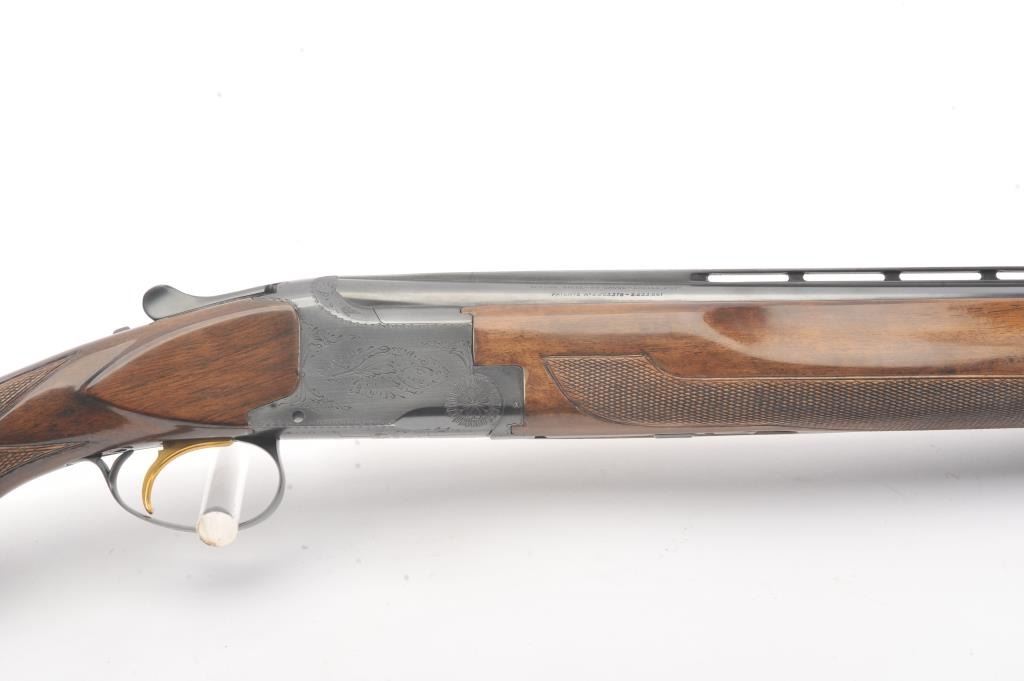 Browning Superposed Belgian made O/U shotgun, #2799F69, 28 Ga., 28" vent rib barrels, with hand filed matte rib, ivory bead sights, blued finish, engraved receiver, with hand checkered walnut stock and rubber recoil pad. Shotgun is in near excellent condition overall, retaining 98%+ original blue, sharp markings. Bores are good, choked skeet / skeet, action is good. Wood is fine plus, with just minor handling marks, and a slightchip on the forend where the bottom meets the receiver. Length of pull is 14 1/2", 13 3/8" to the end of the wood. (Modern) Est. $1400-2800