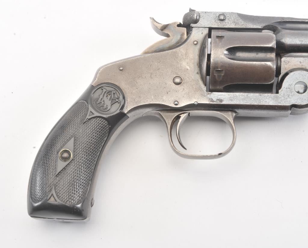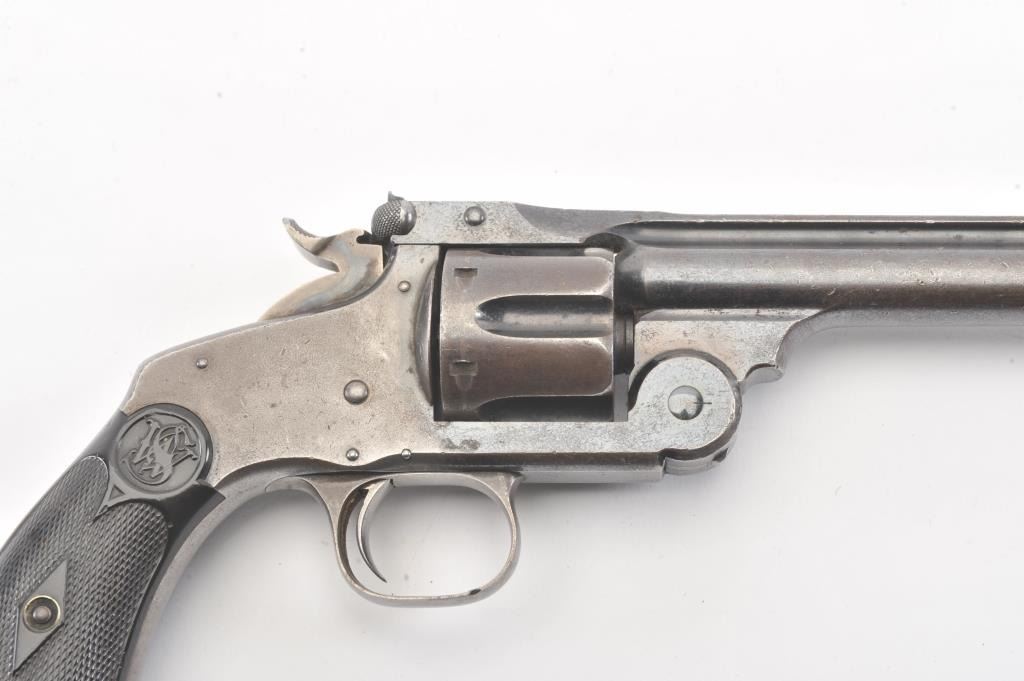 Smith & Wesson New Model #3 Target Single Action revolver, #412, .32-44 cal., 6-1/2” barrel, blue and case hardened finish, replacement grips. Revolver is in overall good to very good condition showing approx.30% original blue, crisp action, very good markings, overall good bore with some pitting, replaced front sight. Per Flayderman’s, only 2,621 produced in this caliber. (Antique). Est.: $750-1500.