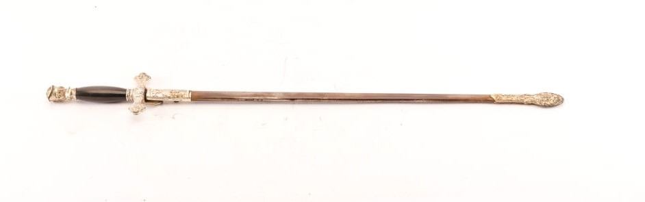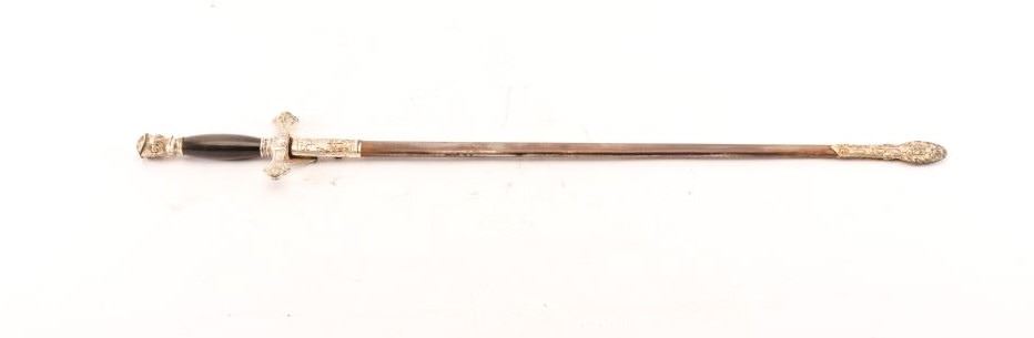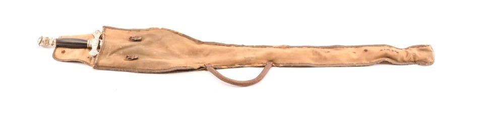 Knights of Columbus sword by Lynch & Kelly of Utica, New York with steel scabbard and case. The sword is 35” in total length with a 28” etched blade. The blade is marked Lynch & Kelly at the handguard and Knights of Columbus on the blade. The handguard is cast with a smooth plastic grip and knight’s head pommel. The steel scabbard shows moderate surface rust with ornamentation at the throat and toe. The lot includes aleather handled canvas case in fair condition. Est.: $75-150