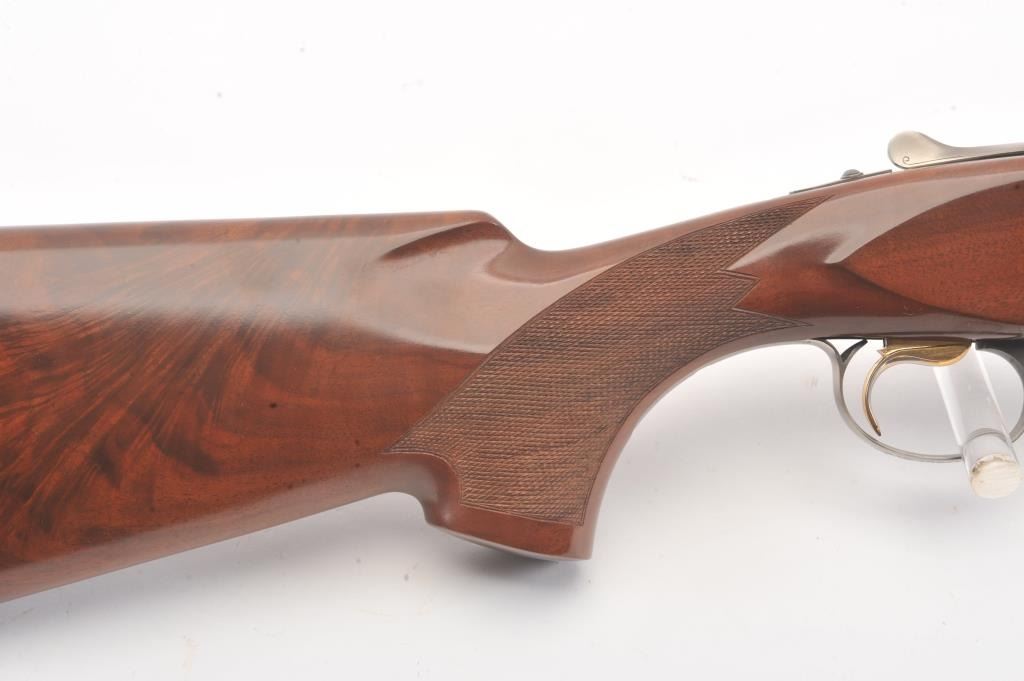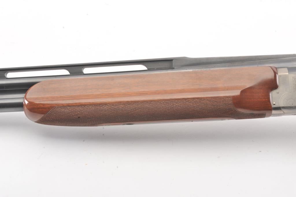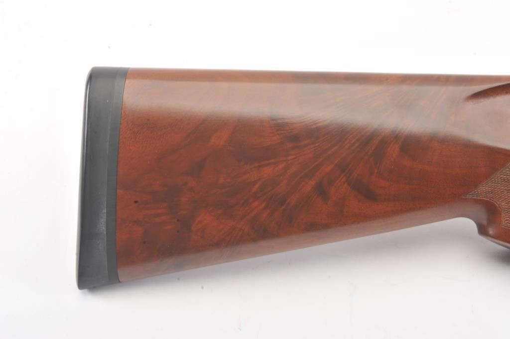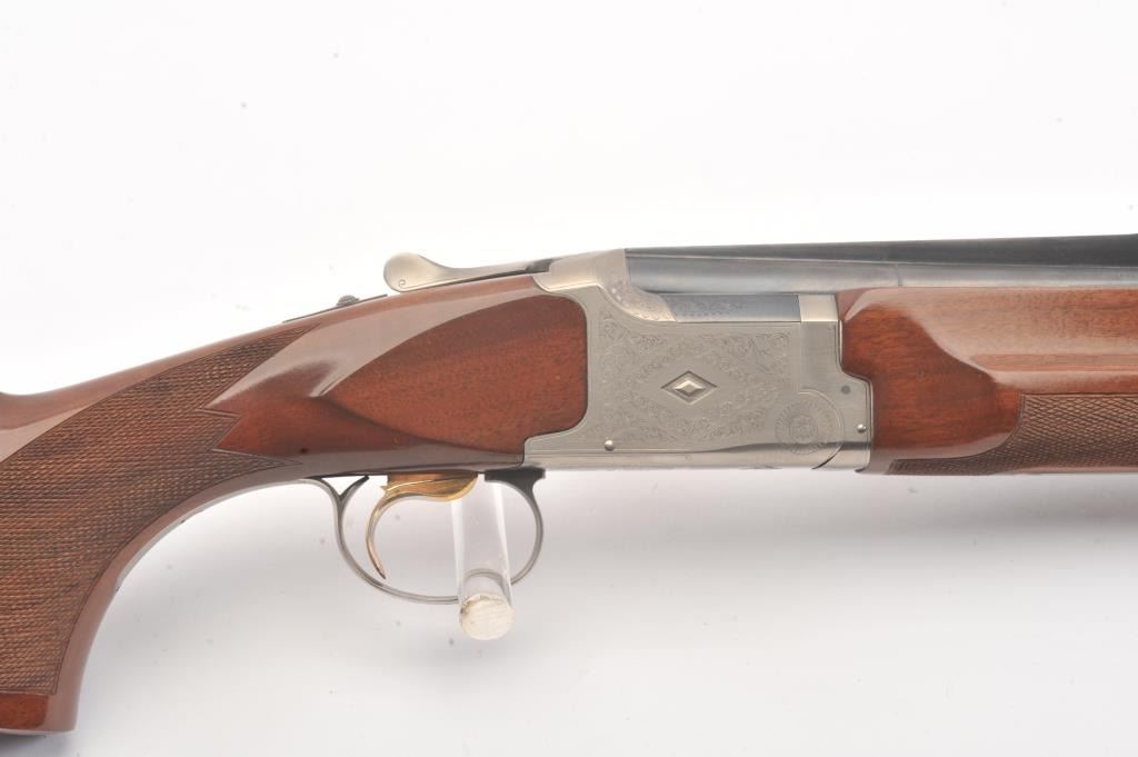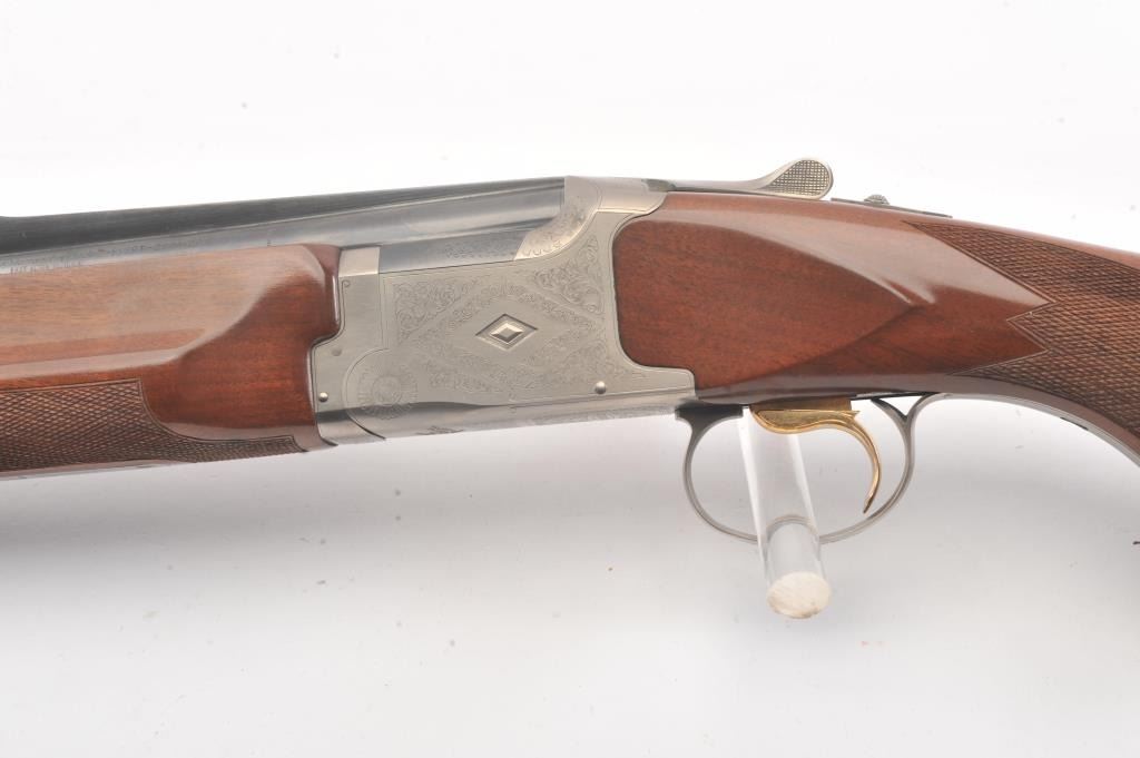 Winchester Diamond Grade Skeet O/U shotgun, #DG280293E, 28 gauge, 2-3/4” chambers, 27-1/2” ventilated rib barrels, blue finish with engraved bright receiver, single trigger, checkered wood stocks with hardrubber butt pad, length of pull 14-3/8”. This gun is in overall excellent condition showing approx. 98% + original finish with minty bores, crisp action, sharp markings and beautifully grained fine wood stock; alovely Diamond Grade Winchester that has been well-cared for. Includes Winchester Diamond Grade hard case in very good condition. (Modern/PPT) Est.: $1000-2000
