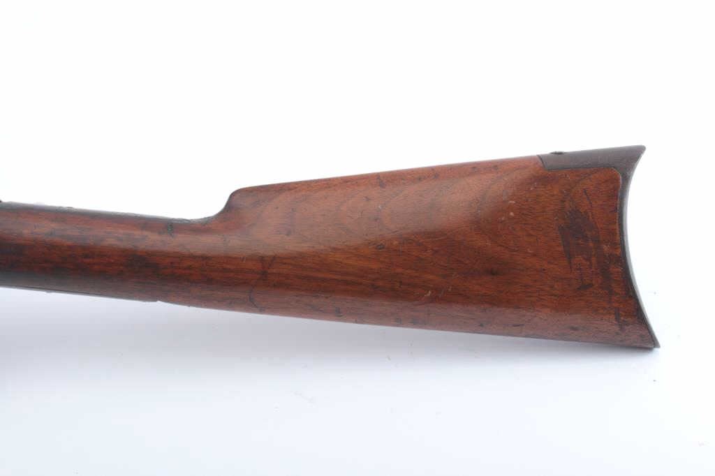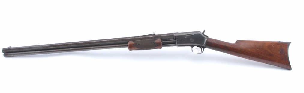 Colt Lightning pump rifle, .32-20 caliber, Serial #30967. The medium frame rifle is in very good overall condition with a 26” octagon barrel with dealer added Beeches front and buckhorn rear sights in theoriginal dove tails. The barrel and full-length magazine have drifted to grey/brown patina with muted original blue in the protected areas and sharp edges. The receiver retains a significant amount offlaking original blue finish with a crisp Rampant Colt emblem on the left side. The tang is slightly knackered and a screw is missing. The checkered wood fore end is in very good condition with some flattening ofthe checkering. The butt stock is good also with a smooth steel crescent butt plate. The bore is fair, the action is crisp and the markings are sharp on this desirable Lightning circa 1888. Est.: $1,200-$2,400. (Antique).