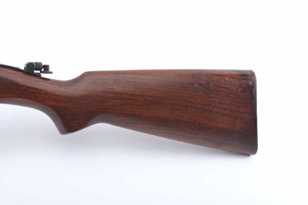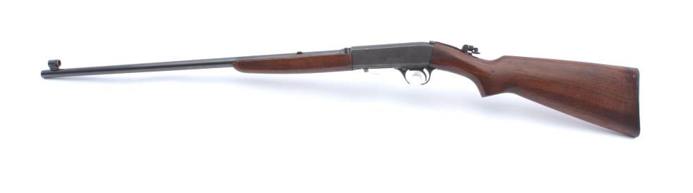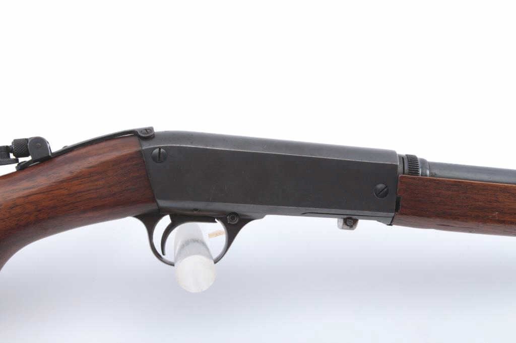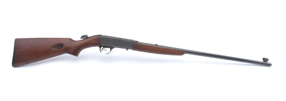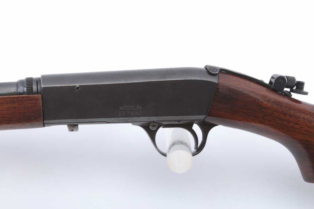 Remington Model 24 semi-automatic rifle, .22 Long Rifle caliber, Serial #127642. The rifle is in good overall condition with a 21” barrel with a hooded front sight and the rear sight removed with the dove tail filled. The metal surfaces retain a significant amount of toning blue finish with wear at the muzzle and light surface erosion noted. A period Marbles tang sight has been added during the period of use. The smooth woodstocks are in very good condition with light handling and storage marks. The bore is fair, the action is crisp and the markings are sharp. Est.: $250-$500. (C+R).